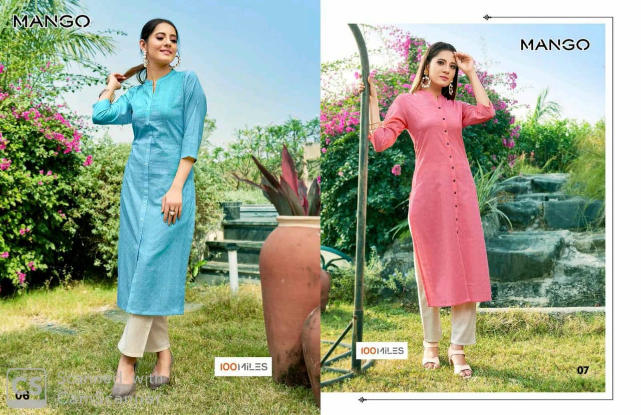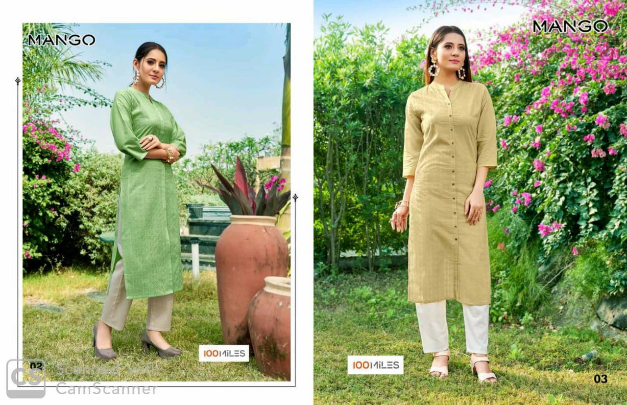 | Other Details: | Catalog : MANGO BRAND : 100MILESâ„¢ TYPE : Pure Cotton Schifli work kurtis SIZES : M to 2XL RATE : 405/- Pieces: 8 psc per bag |