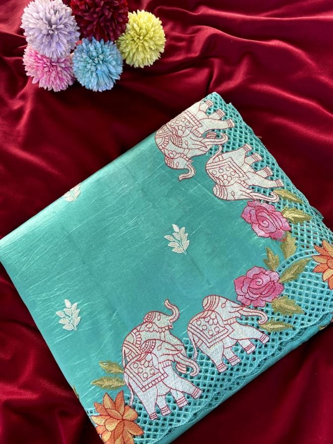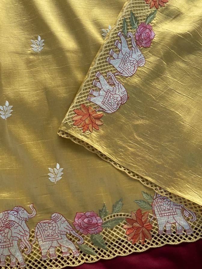 | Other Details: | FRESH ARRIVAL❤️ Ds no : 3012 Pure viscose tussar saree with beautiful embrodied elephant design panel with cutwork and hole work Teamed with. Running blouse ( as shown in videos )