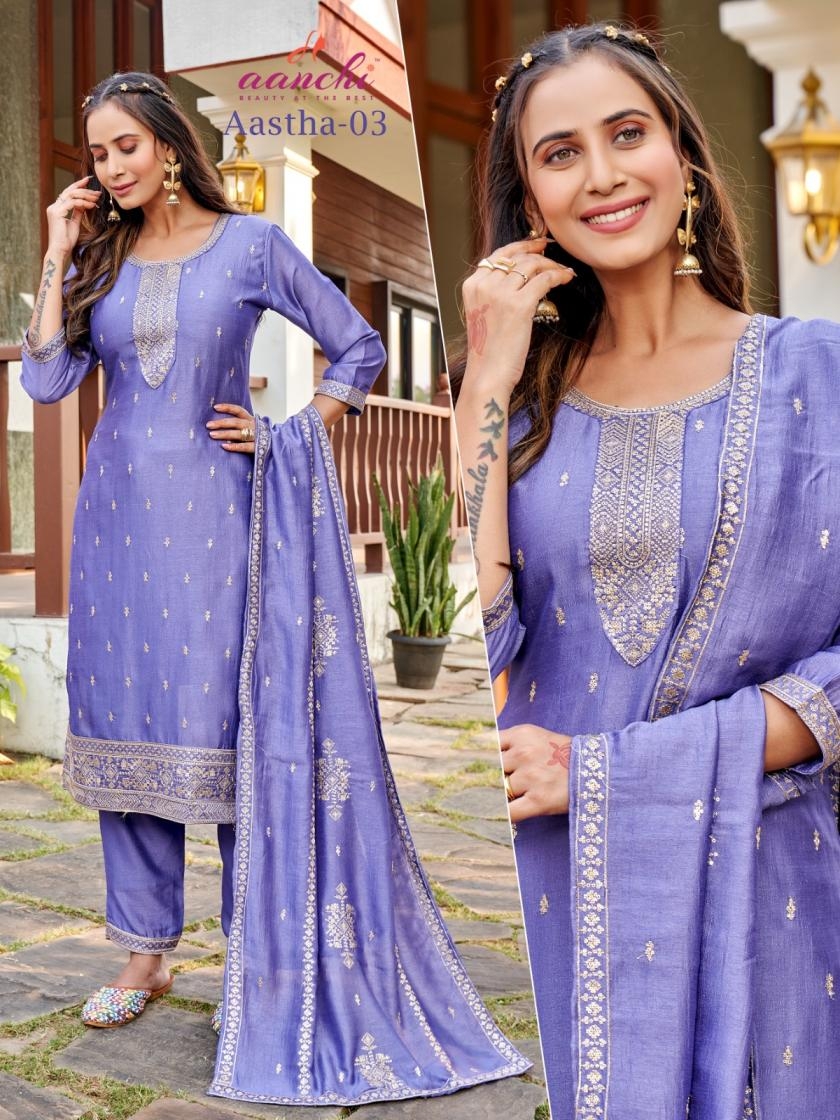 | Name: | Aanchi Aastha Series 01-03 Vichitra Silk Wholesale Readymade Suit In Surat | |
