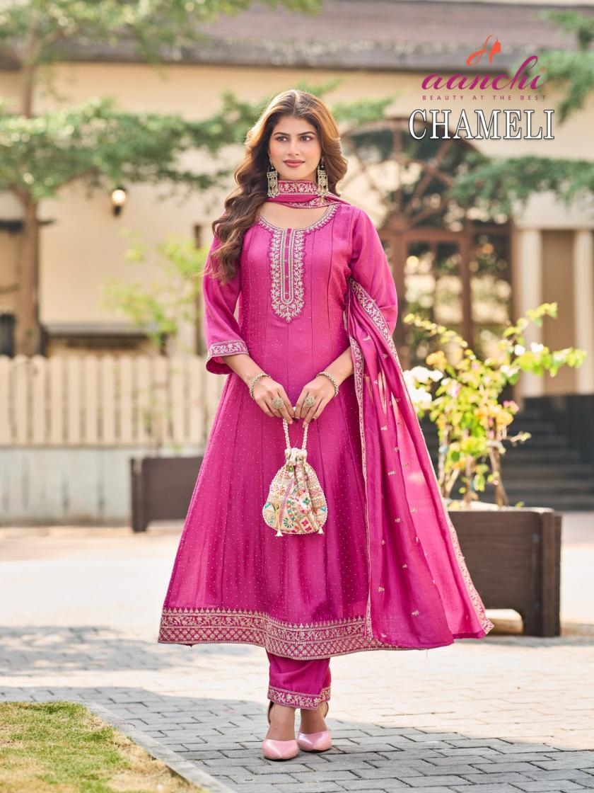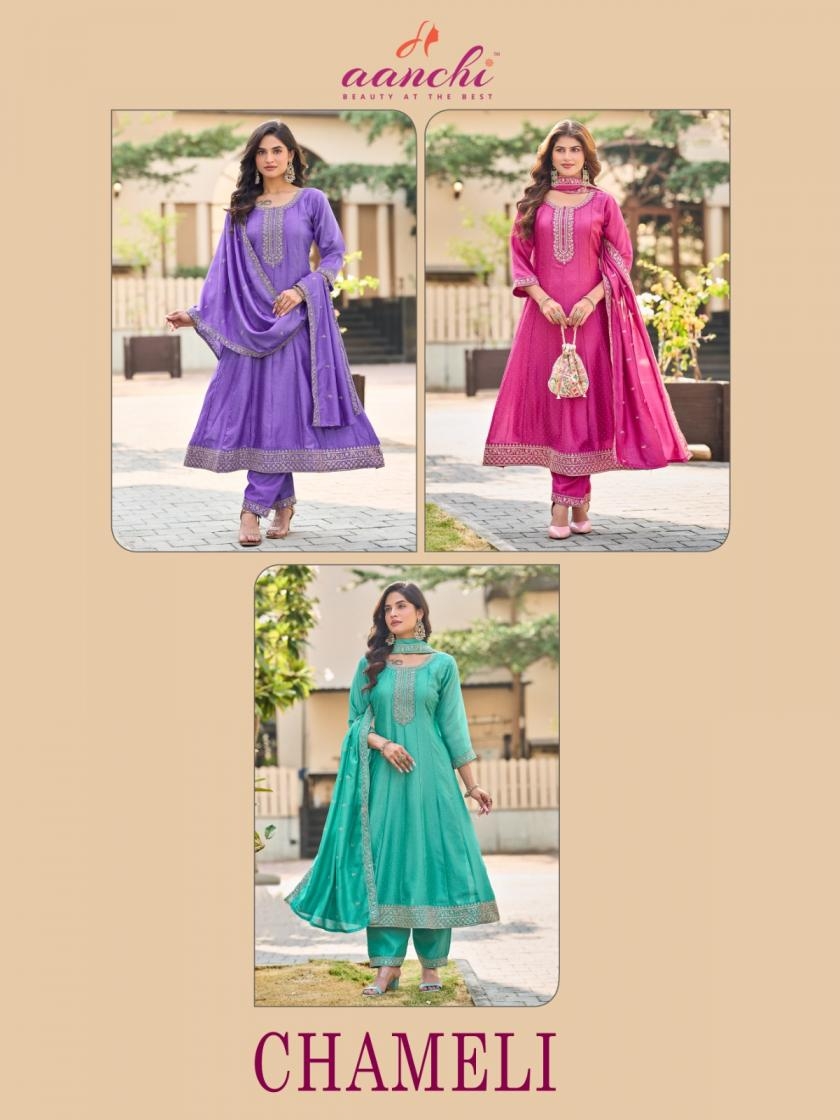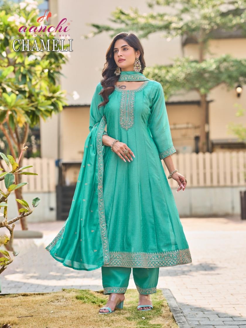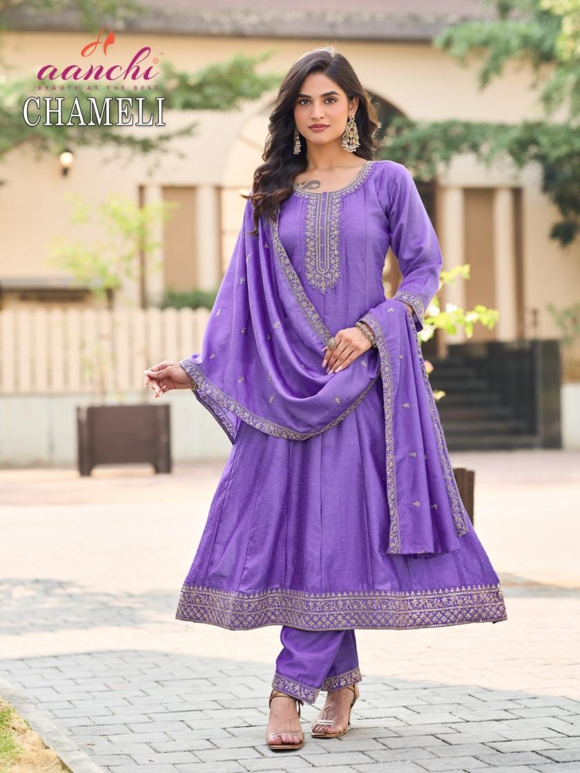 | Name: | Aanchi Chameli Vichitra Silk Anarkali Style Readymade Wholesale Suit | |