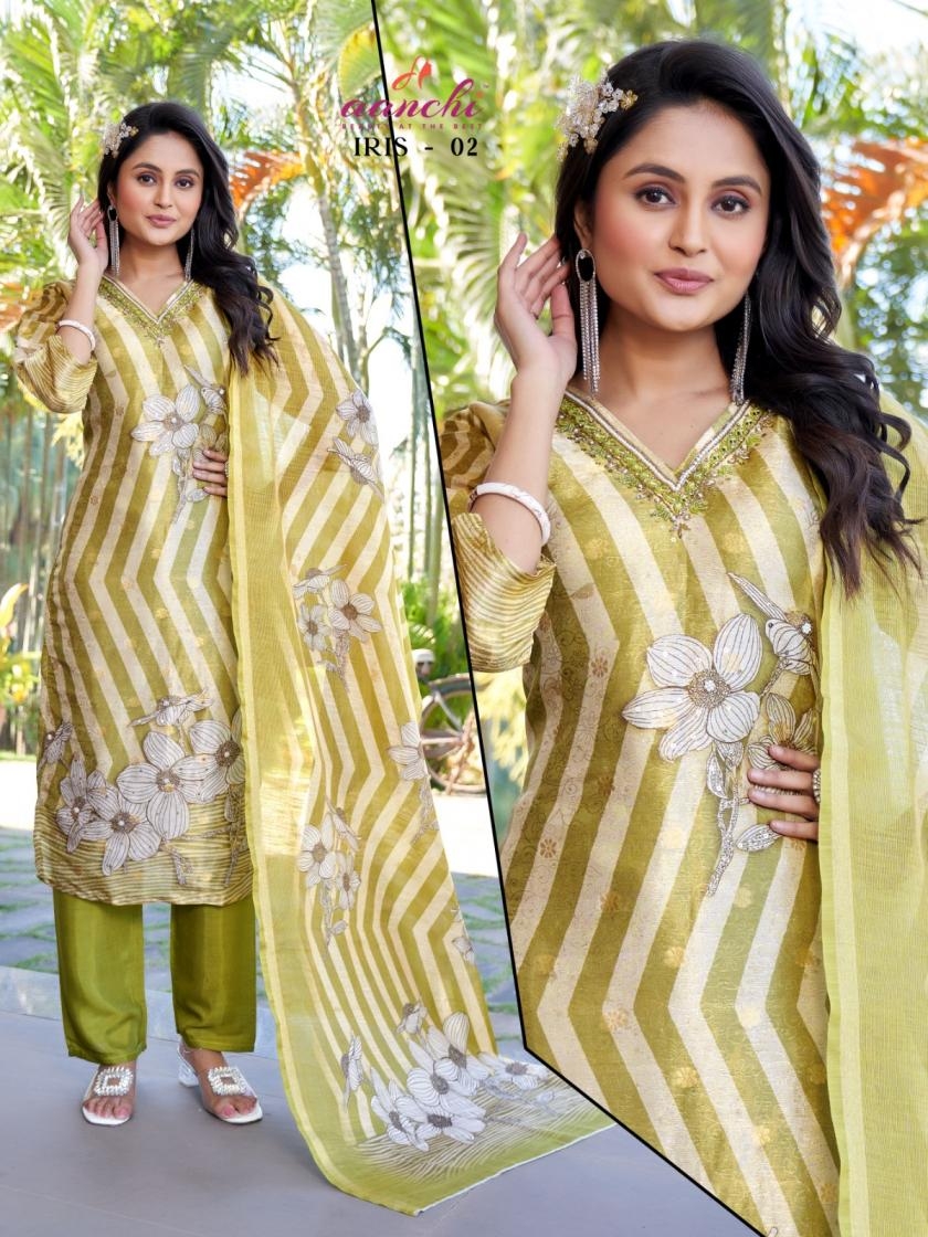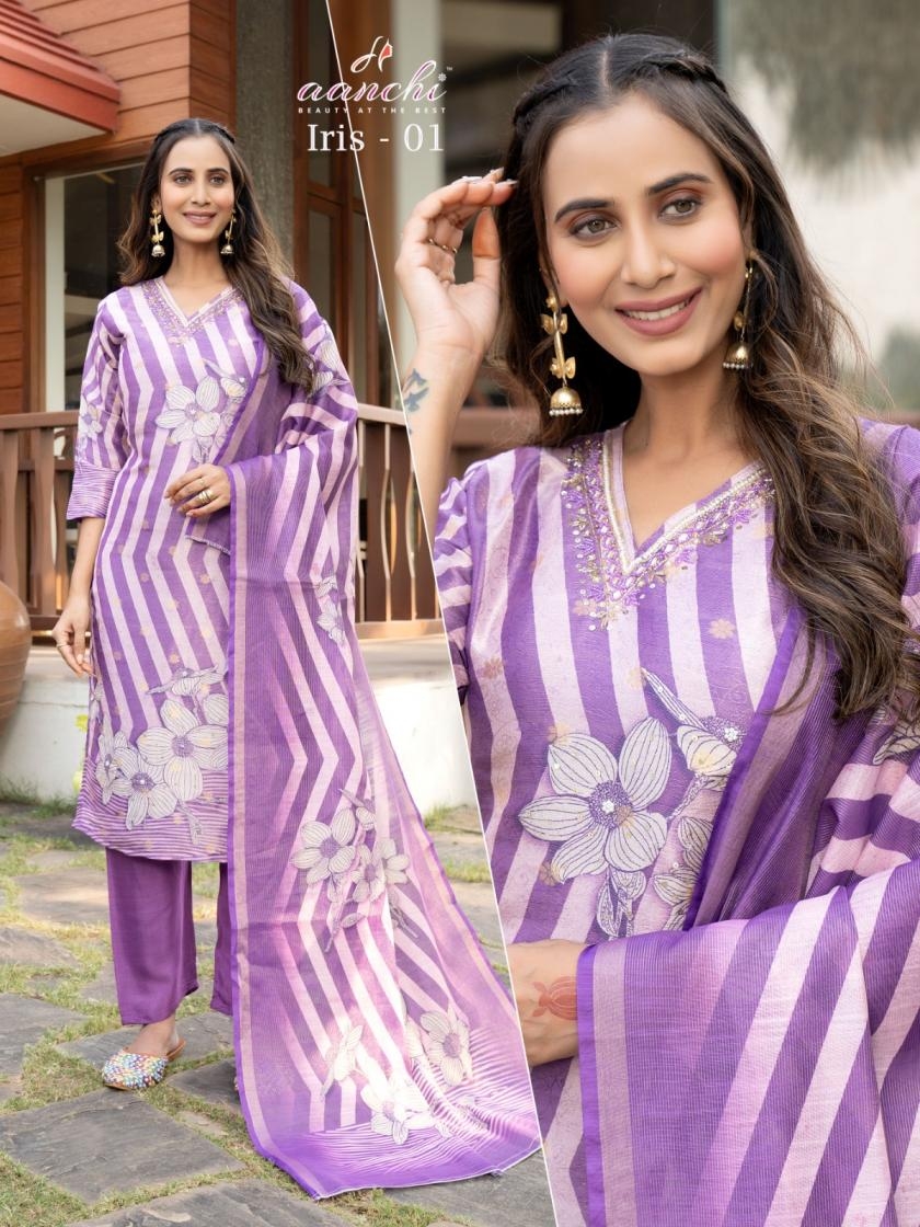 | Name: | Aanchi Iris Series 01-02 Simmer Butti Wholesale Readymade Suit | |