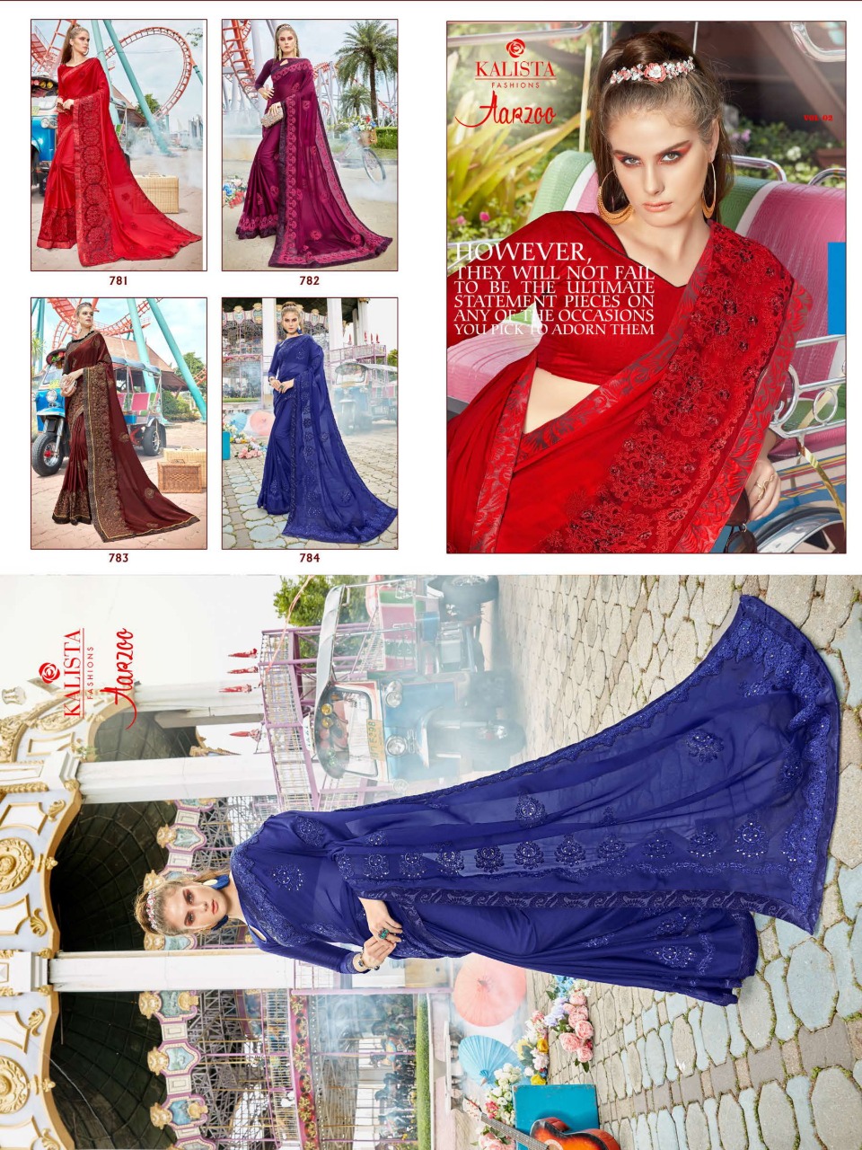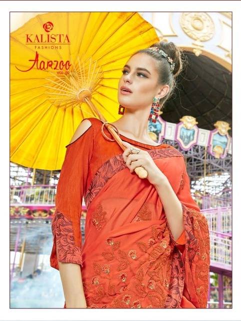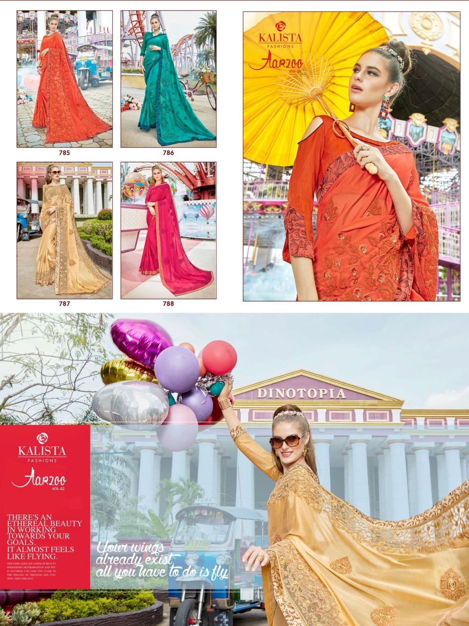 Other Details: | KALISTA NEW POSTER CATALOG-AARZOO VOL 1 AND AARZOO VOL 2 TYPE-SAREE RATE-999/- GST 5% EXTRA DELIVERY-2-3 DAY’S |