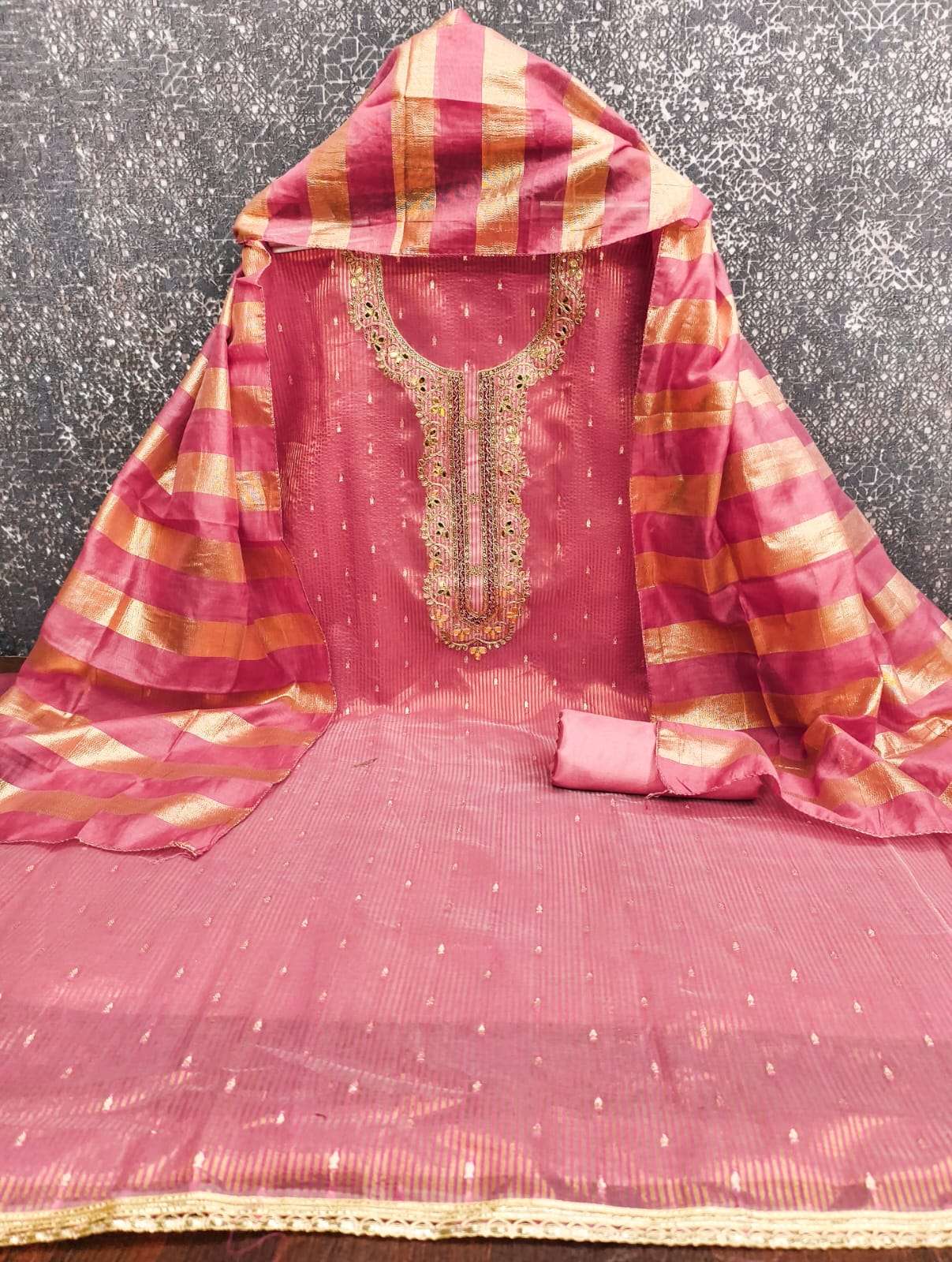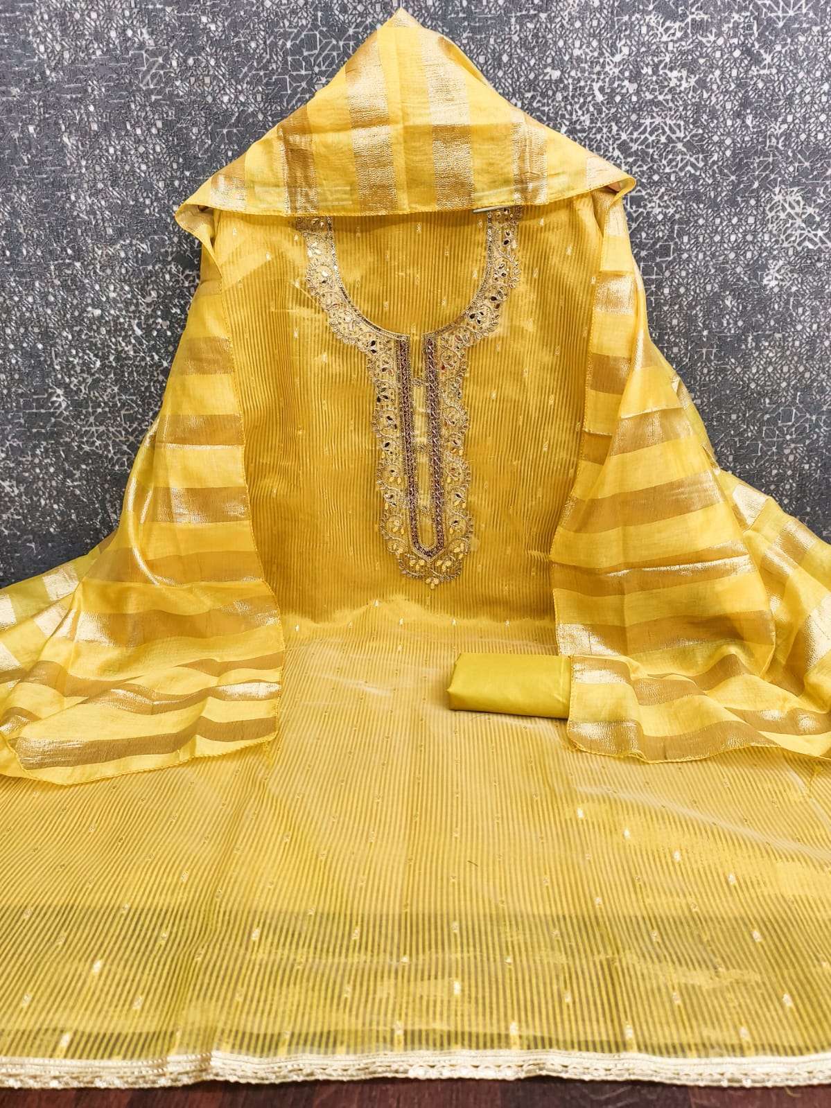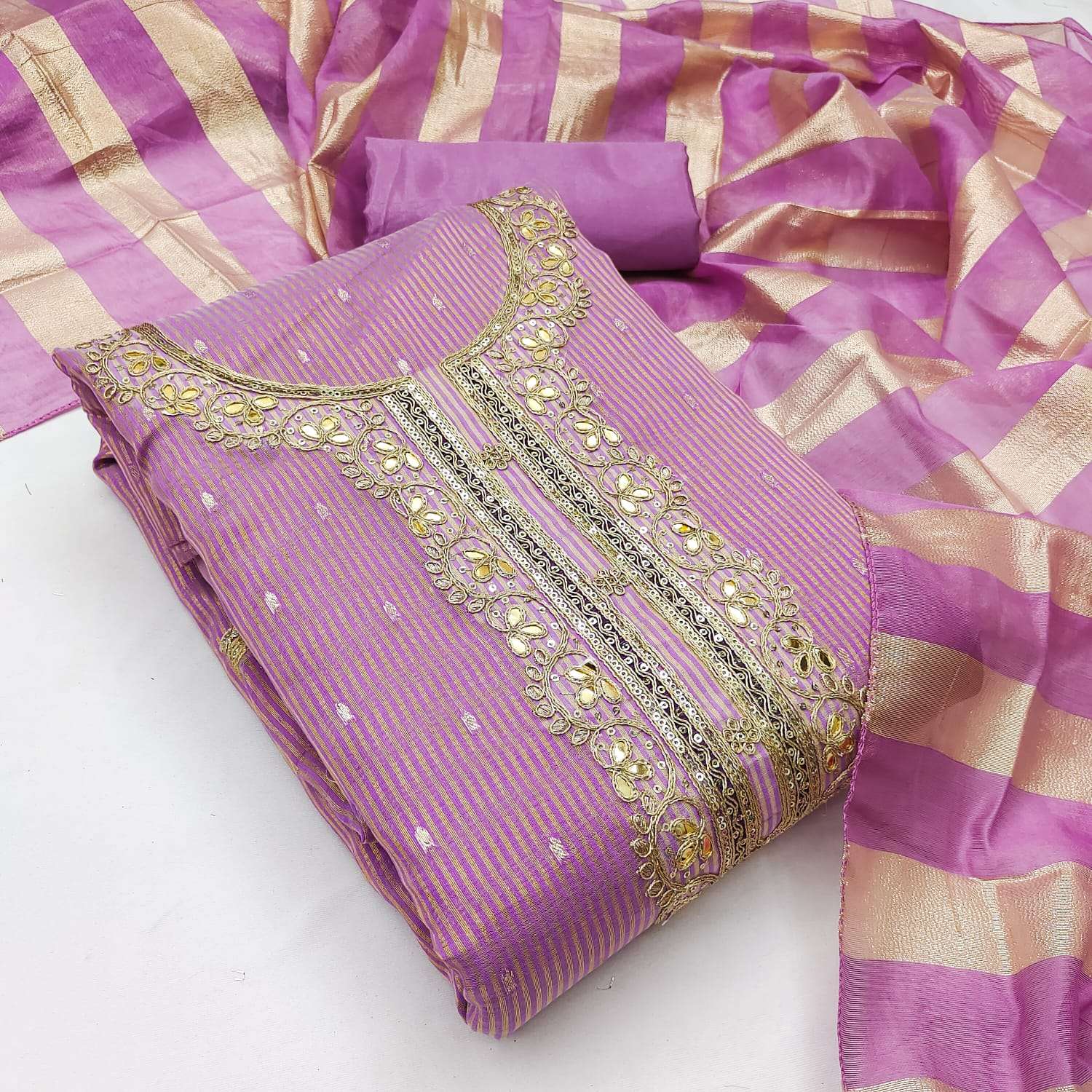 BOTTOM + INNER Fabrics:- Dupatta: CHANDEEI SILK FANCY ZAKARD ▪ Size: MATERIALS