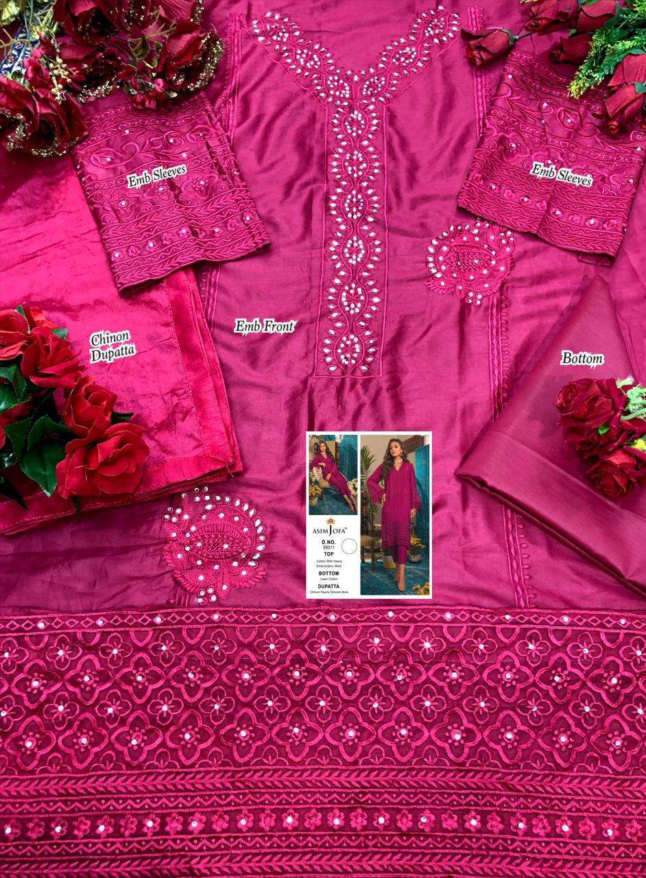 | Other Details: | ASIM JOFA🌹 D.No 56011 👇ðŸ»Fabric Details👇🻠Bottom:- Pure Heavy Quality Material Heavy Semi-Lawn With Beautiful Colour Matching With Kameez Singles Available At Company Price Price:- 999/-₹ Only |