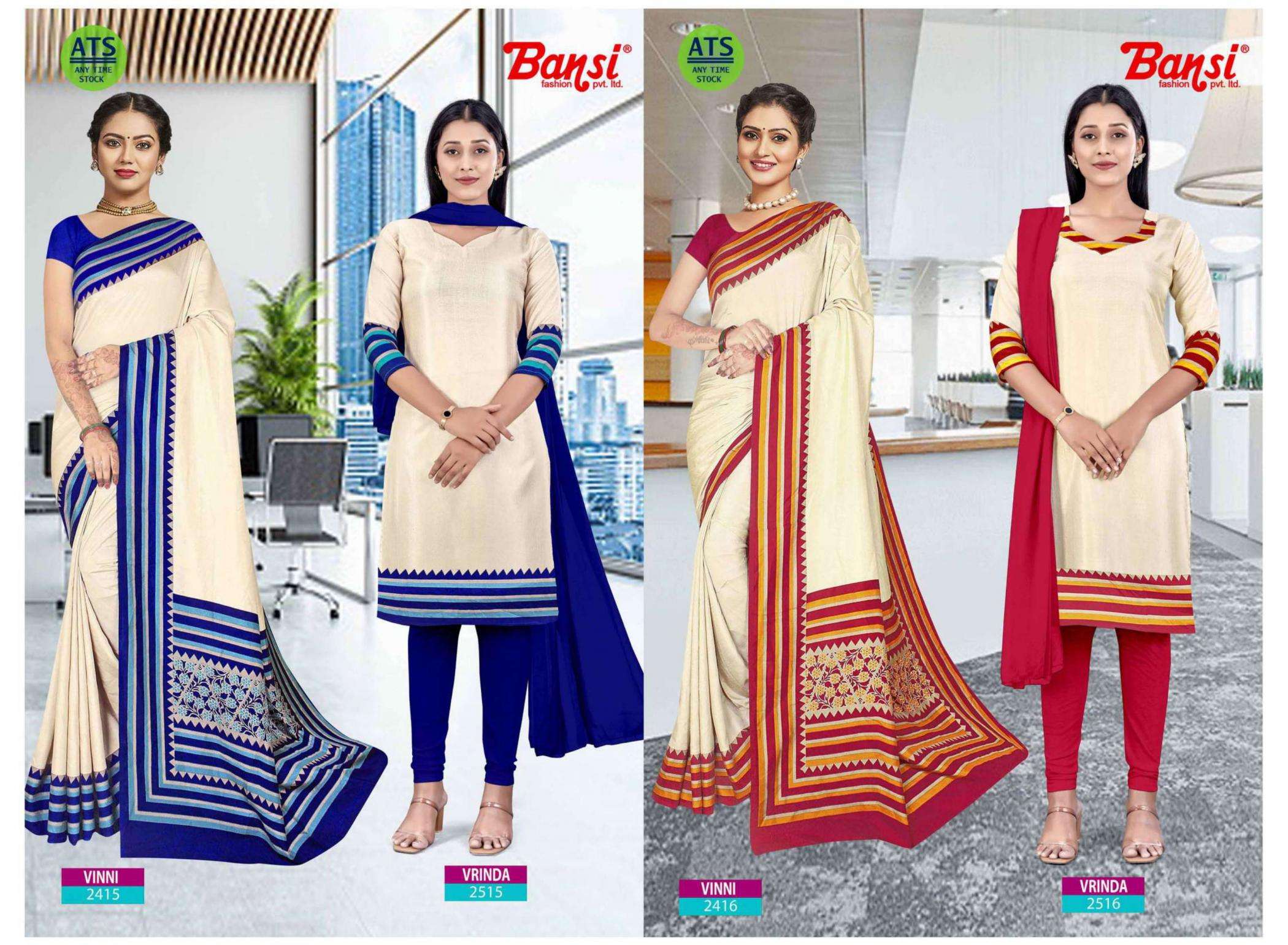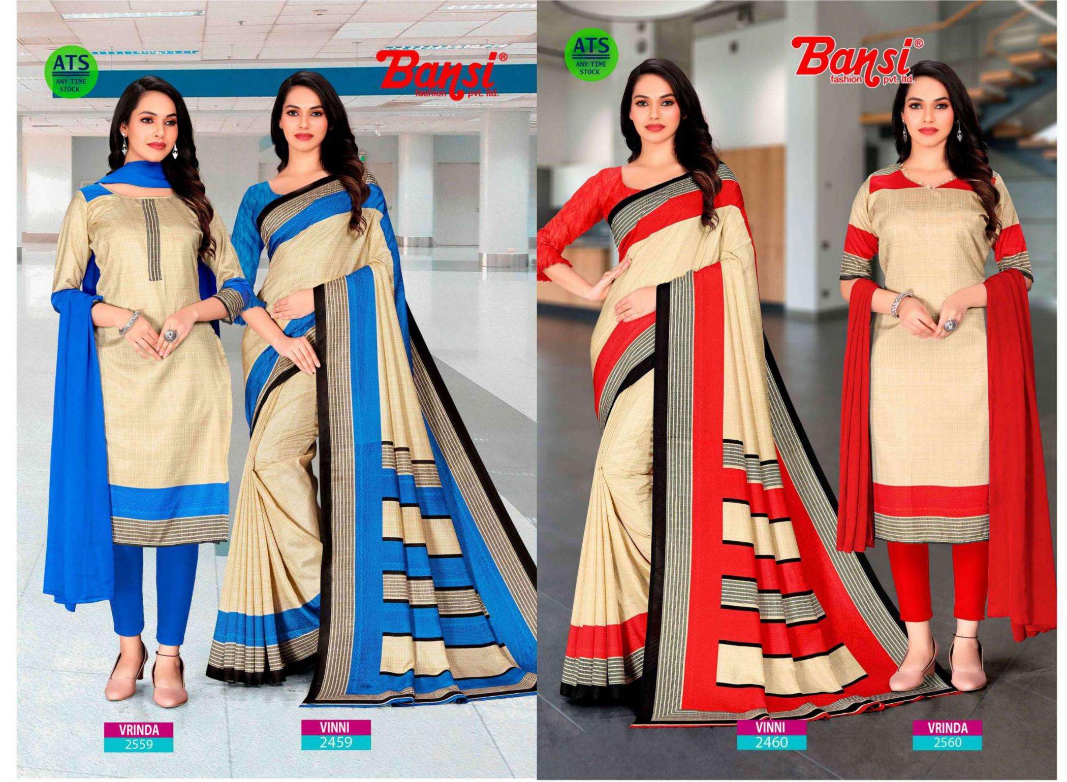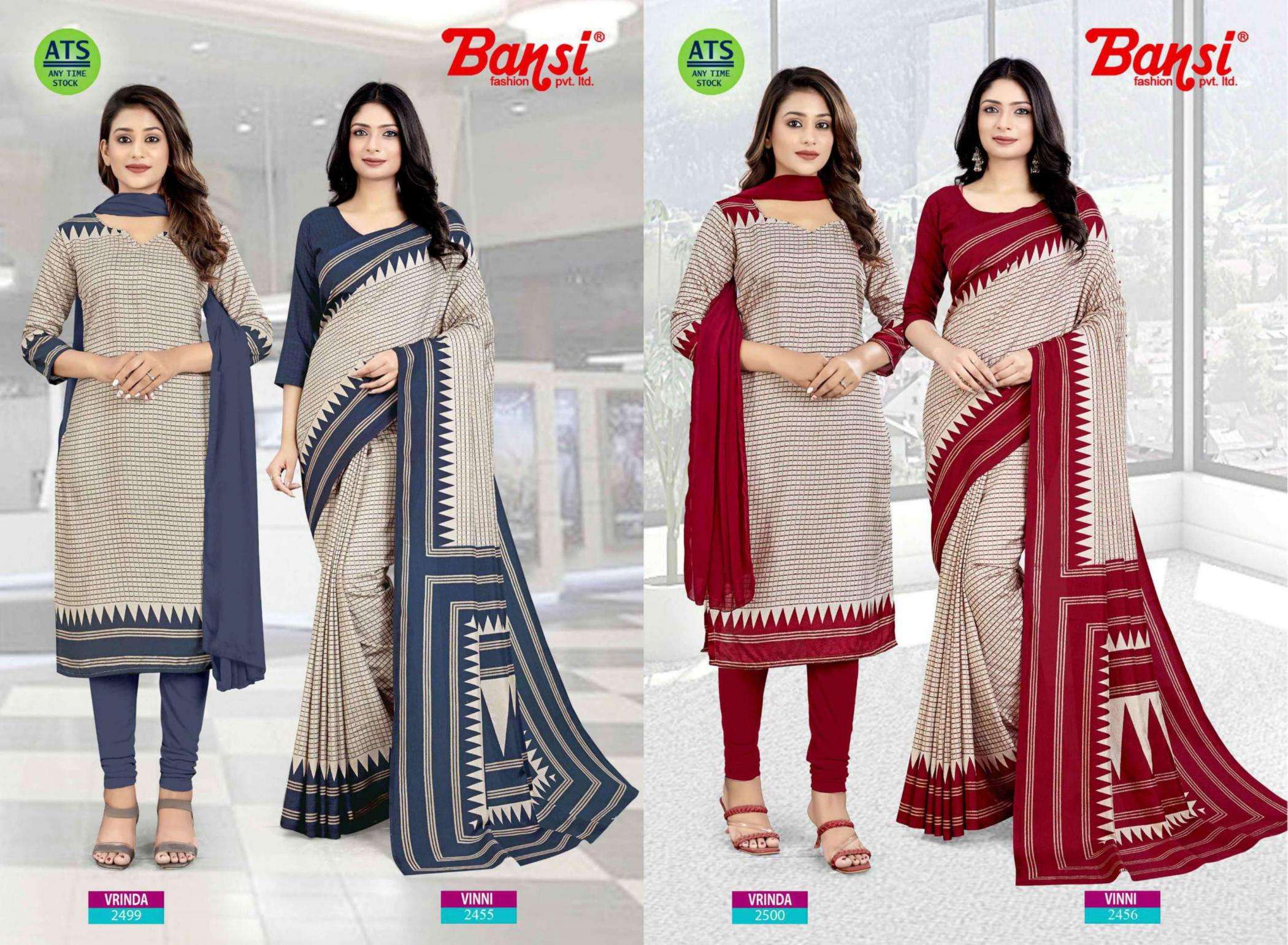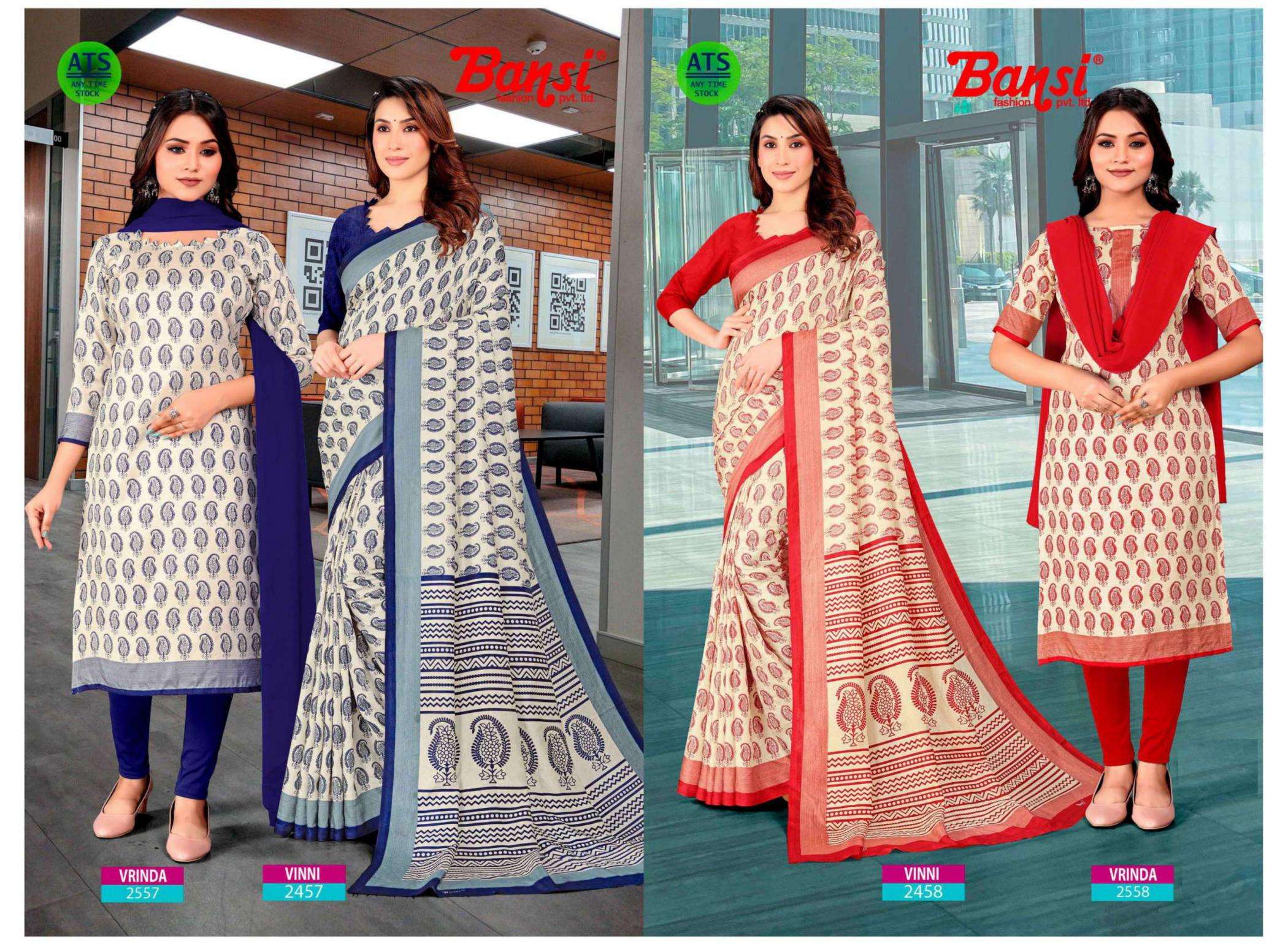 | Name: | Bansi Varinda & Vinni Series 2301 To 2560 Crackle Pretty Look Combo Set Uniform Saree & Suit In Wholesale Surat |