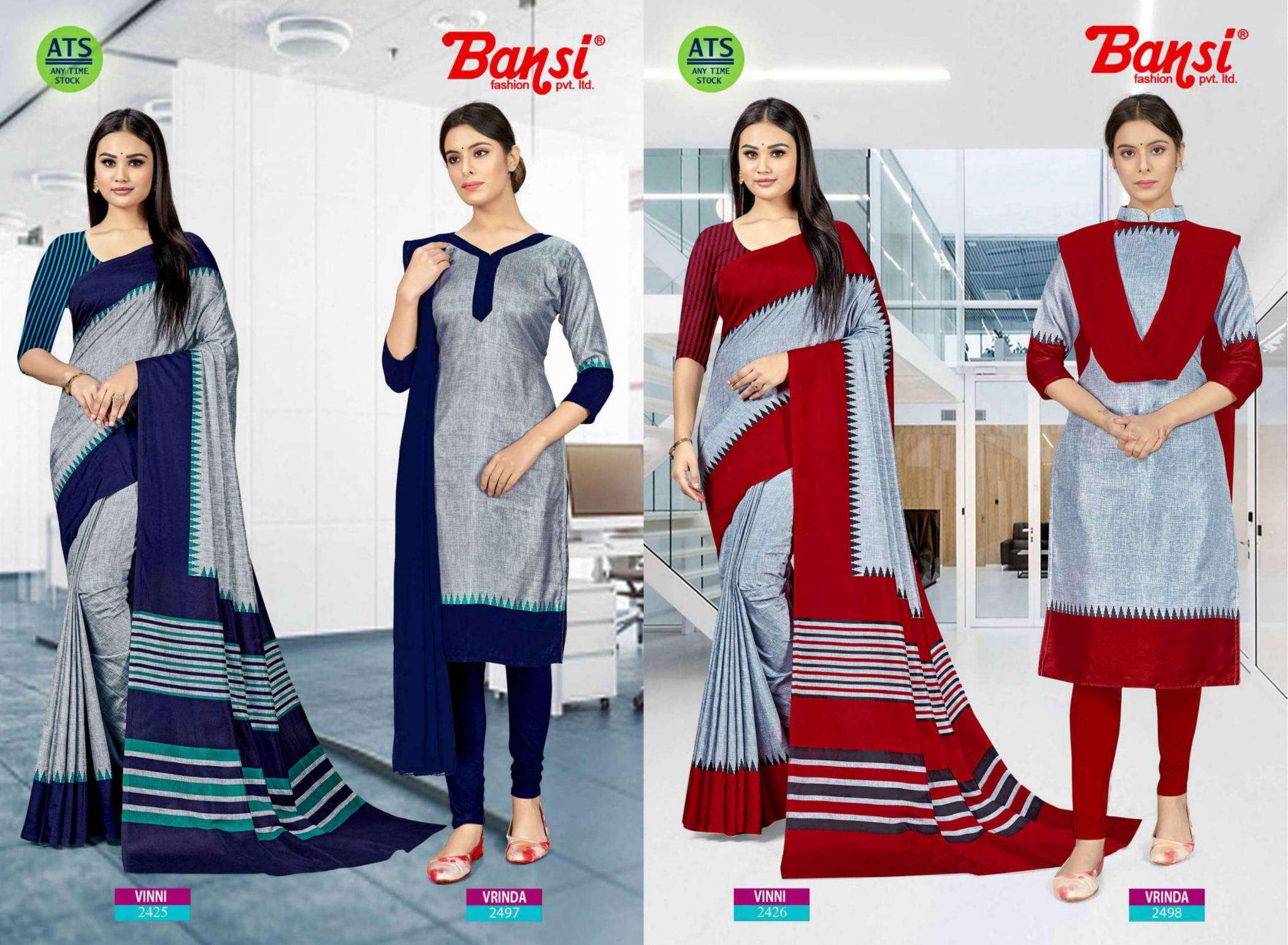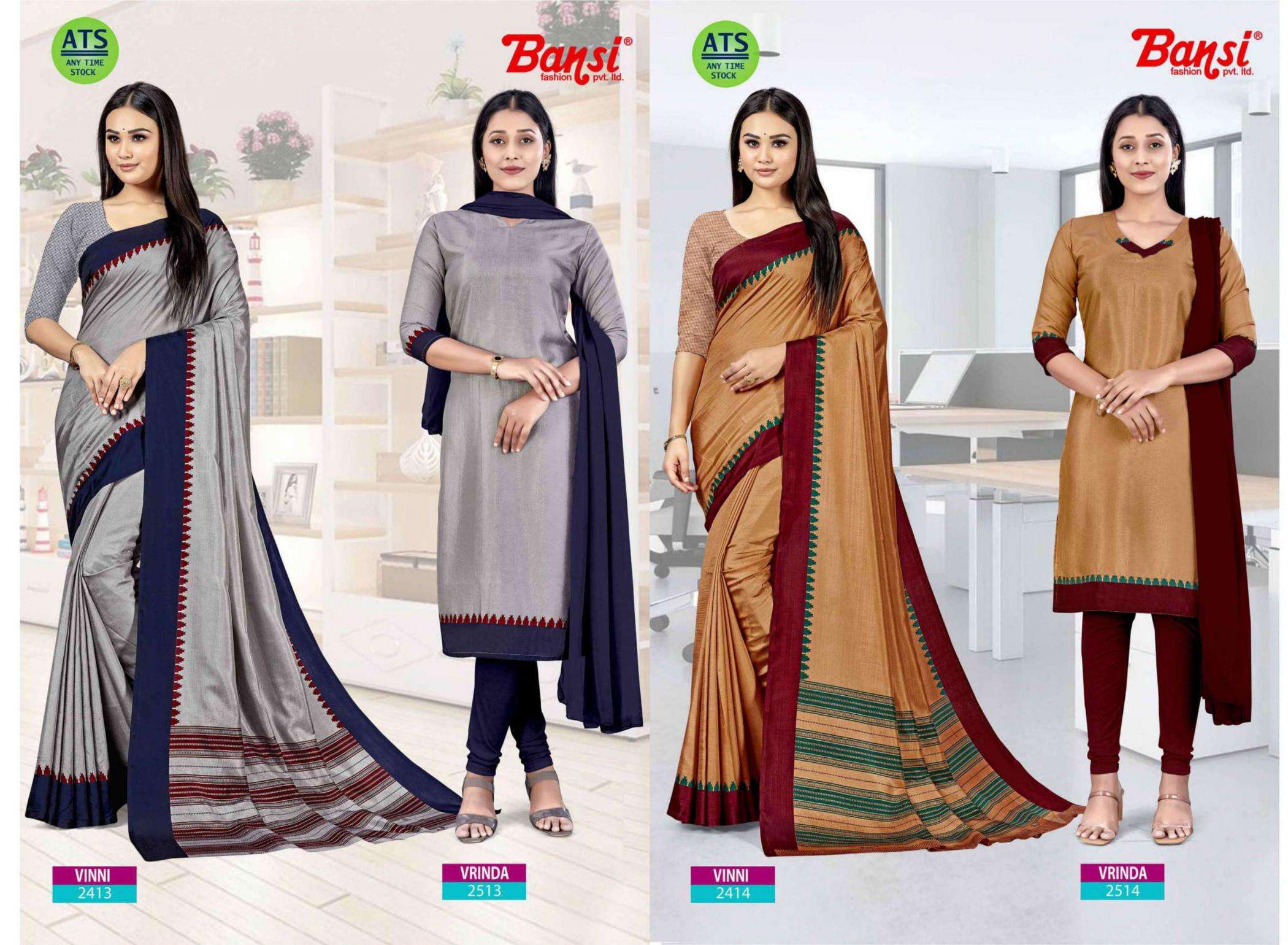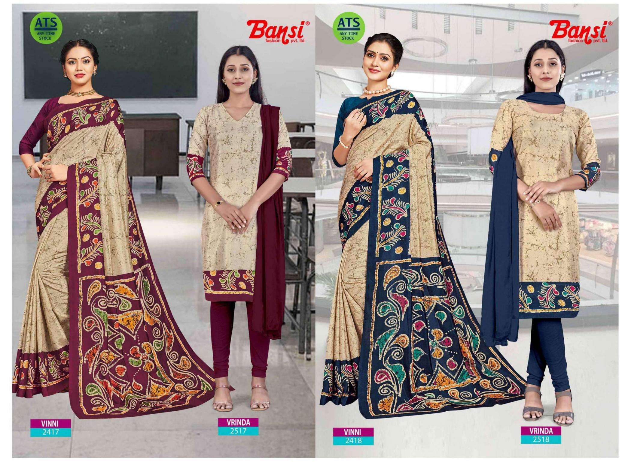 | Name: | Bansi Varinda & Vinni Series 2301 To 2560 Crackle Pretty Look Combo Set Uniform Saree & Suit In Wholesale Surat |