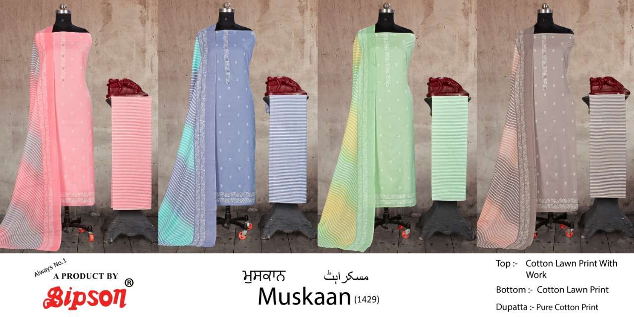 | Other Details: | BIPSON Brings ..... ```Premium Cotton Collection MUSKAAN 1429 TOP :- _ Cotton Lawn INK Print With Button Work .2.5Mtr BOTTOM :- _ Cotton Lawn Print .2.7Mtr DUPATTA :- _ Pure Cotton Print .2.25Mtr 4 Ps Set @ 495 /- per pcs : Set to set. |