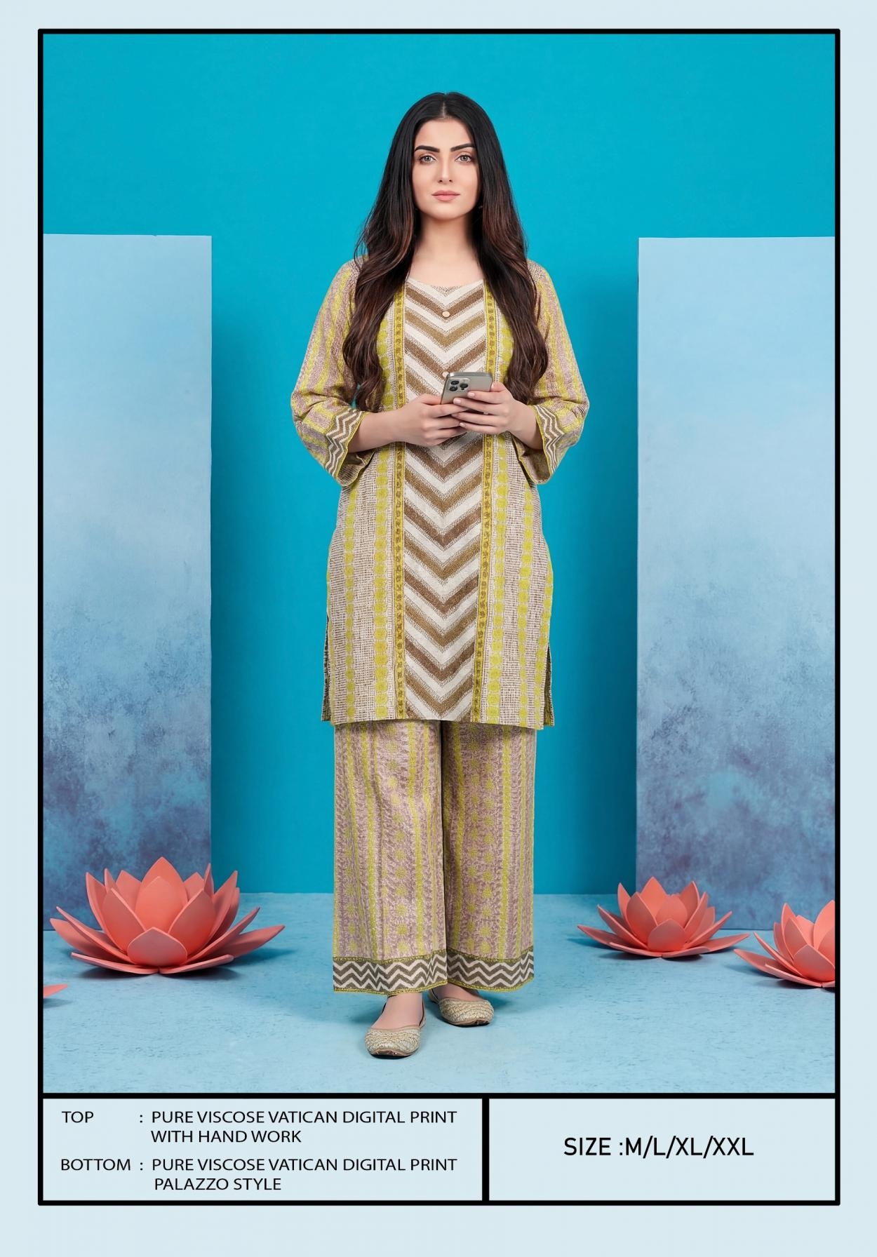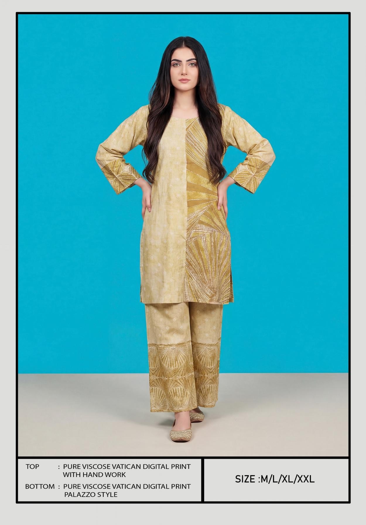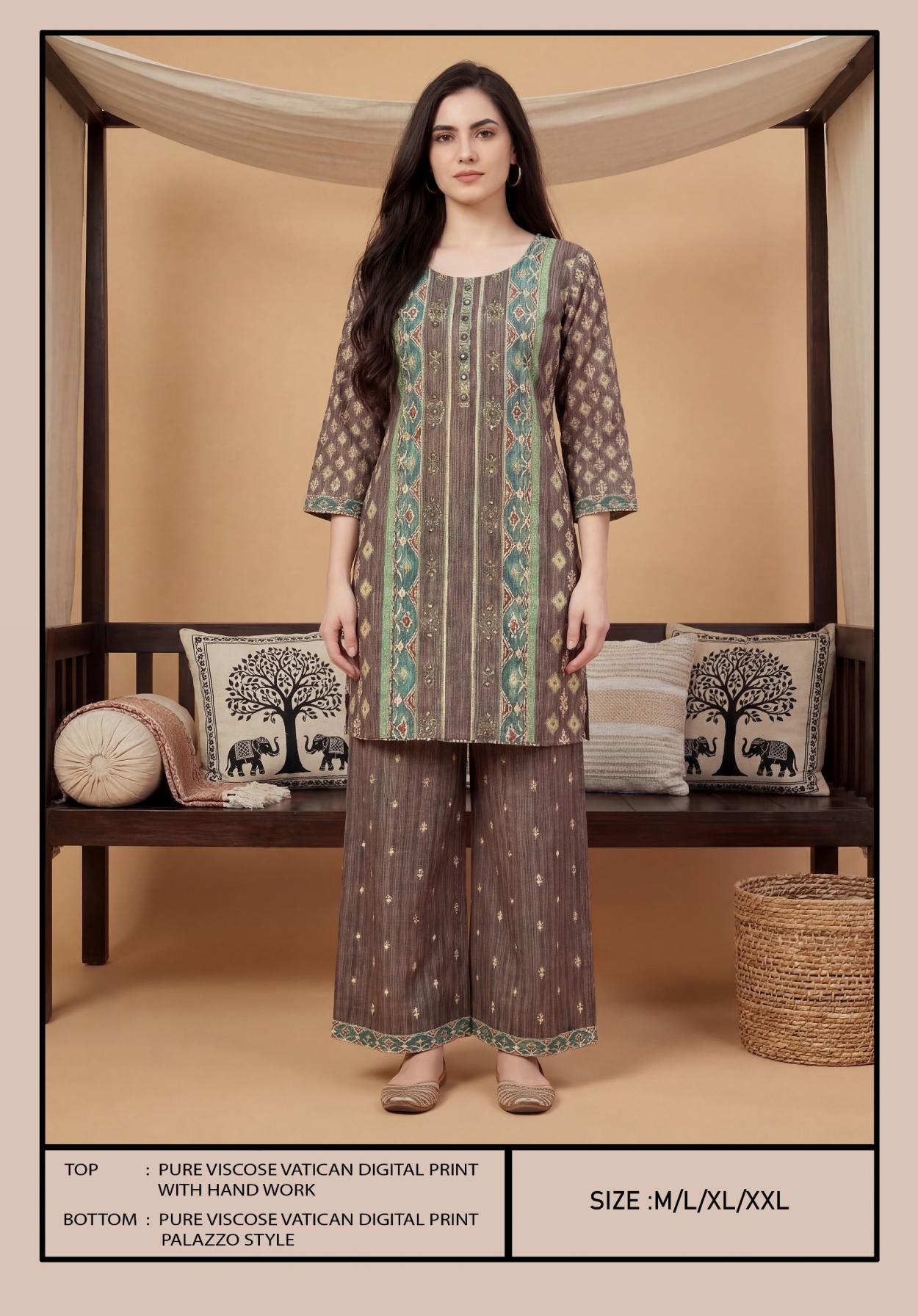 | Other Details: | BIPSON PRINTS Top - Pure Viscose Vatican Digital Print With HandWork . Size Chart :- M-L-XL-XXL RATE : 651 /- PER PCS GST EXTRA COMBO PACK SET |