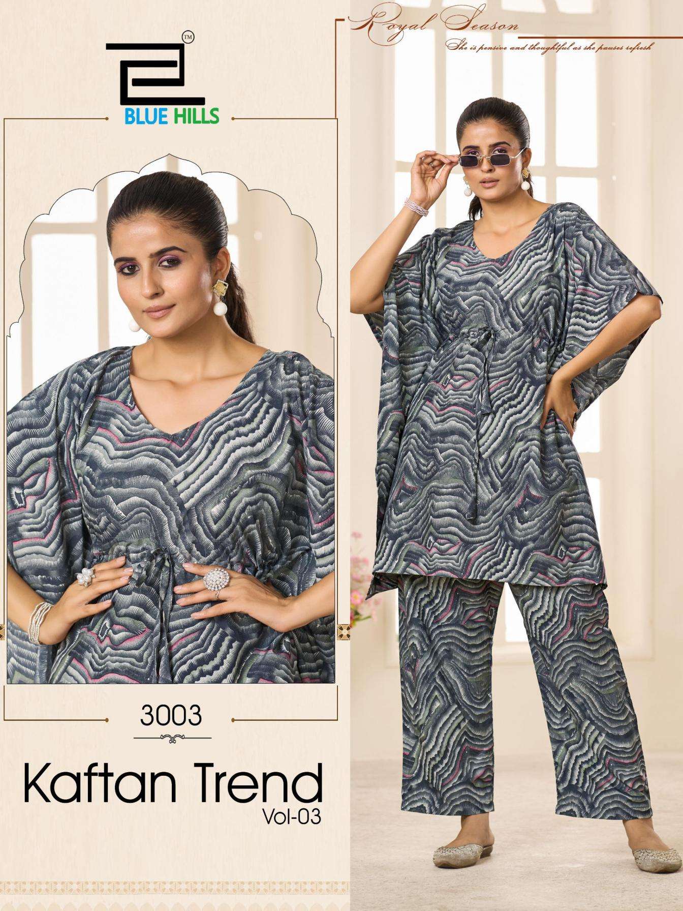 | Name: | Blue Hills Kaftan Trend Vol 3 Series 3001 To 3003 Readymade Heavy Crape Print Kurti With Pants In Wholesale Surat |