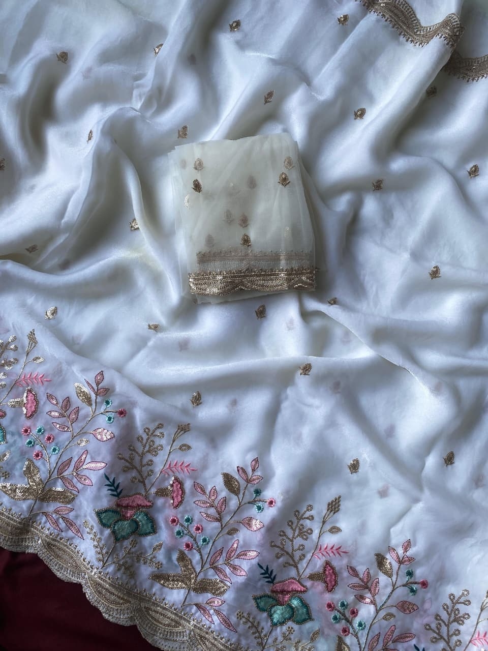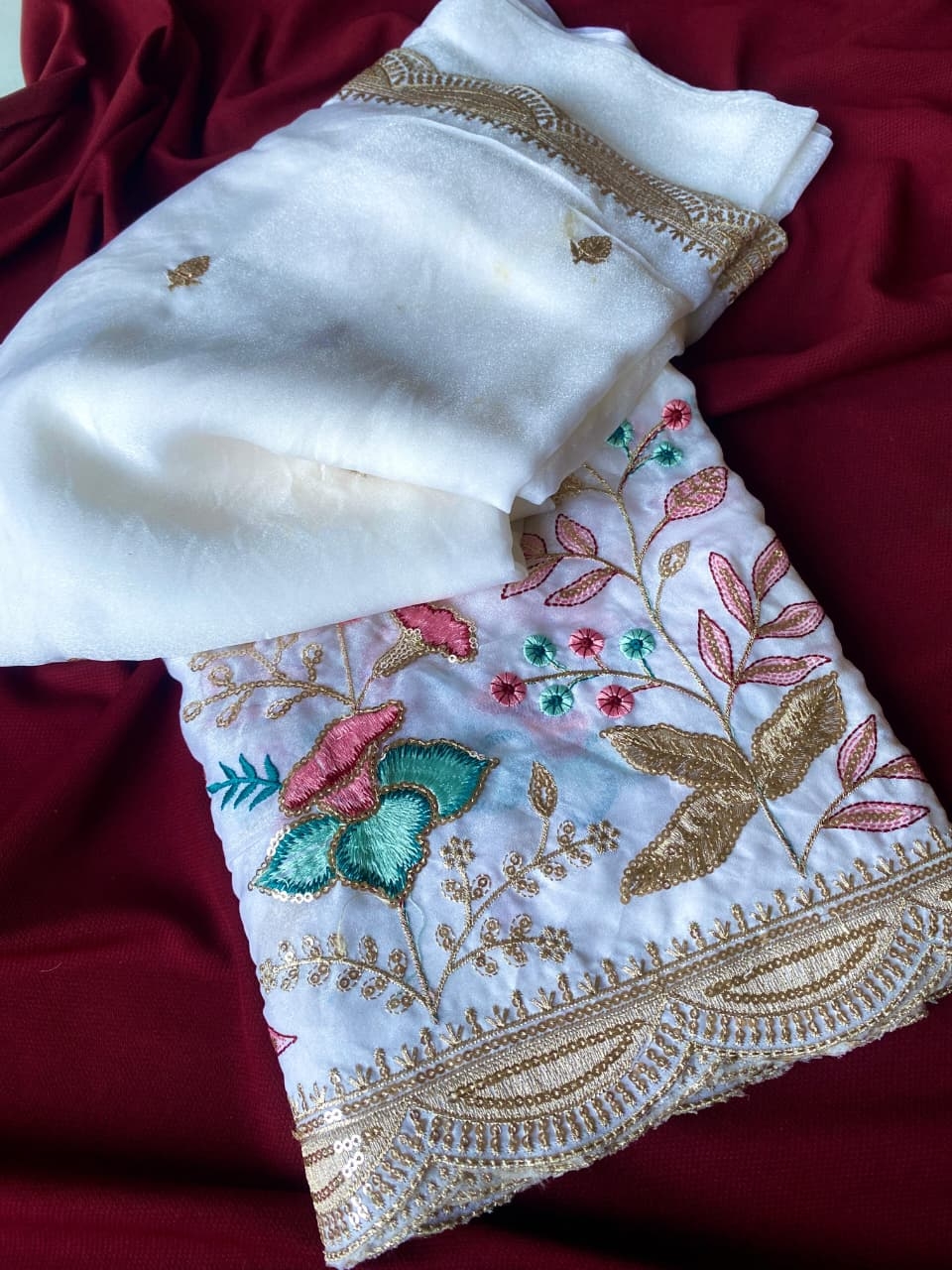 | Other Details: | FRESH ARRIVAL❤️ BT-53 Ds no : 1032 Pure georgate chiffon saree with beautiful embroidery and sequence work all over saree with cutwork Teamed with beautiful net blouse with embroidory Price :- 1350 |