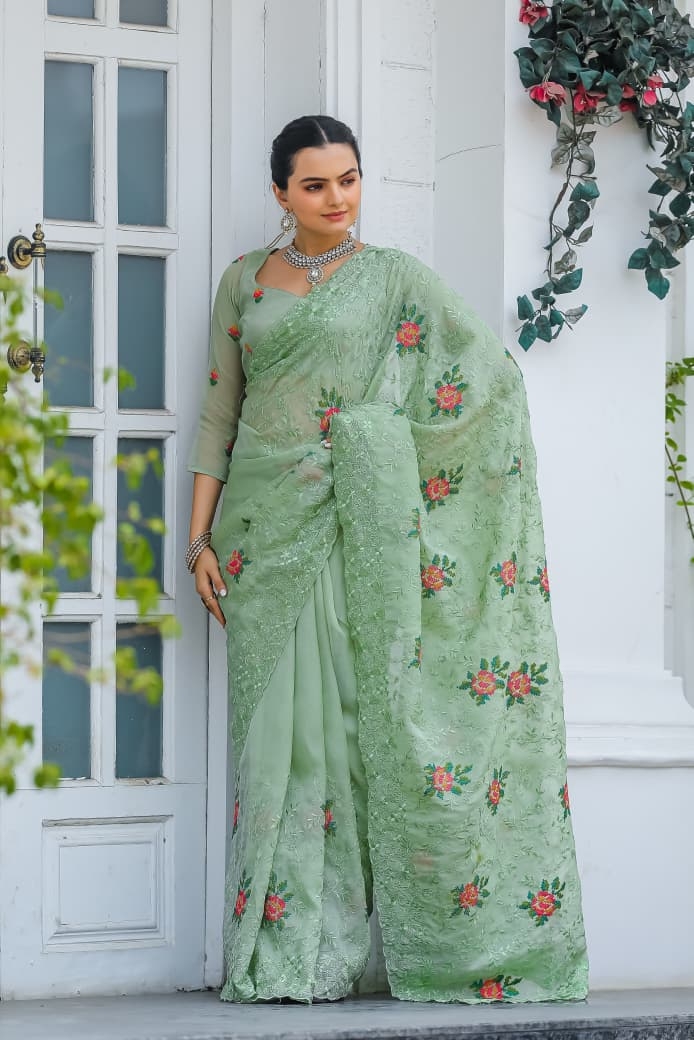 | Other Details: | FRESH ARRIVAL ❤️ BT-53 Catalog : Ankita Pure shiny zari chiffon saree with beautiful work all over saree with cutowork and embroidory Cross stich flower work all over saree Teamed with all over buttis blouse Price:- 1450/- |