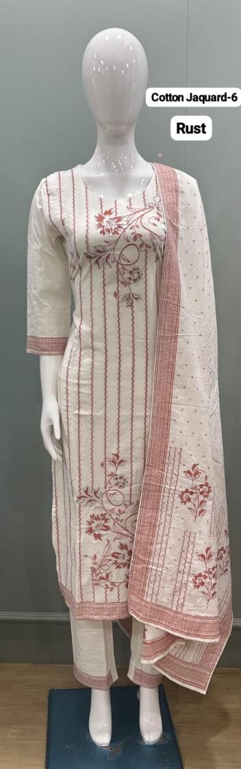 WORK :- FRONT FULLY JAQUARD MUTIF & HAND WORK ON NECK BOTTOM. :- COTTON with DAMAN BORDER DUPATTA :- COTTON JAQUARD WORK