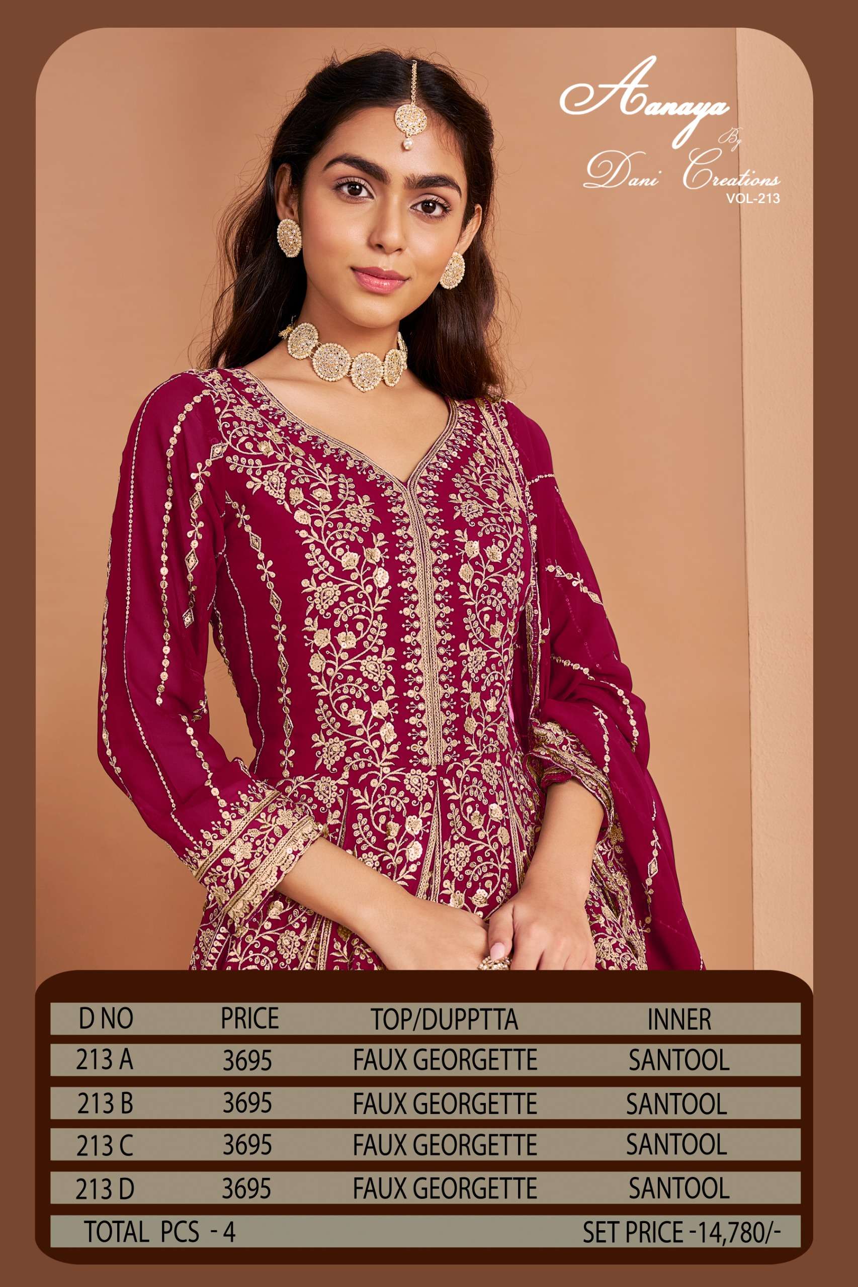 | Name: | Dani Creation Aanaya Vol 213 Series 213 A To 213 D Faux Georgette Suit In Wholesale Surat |