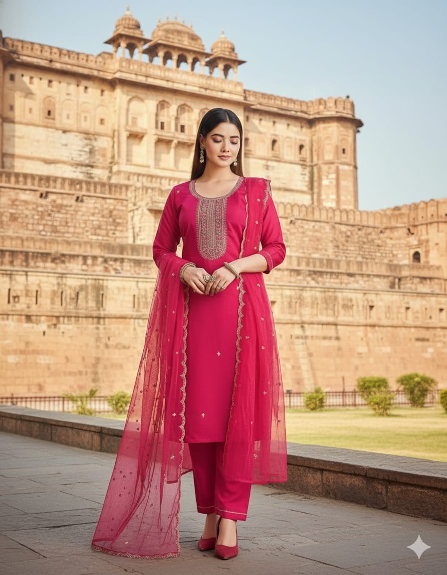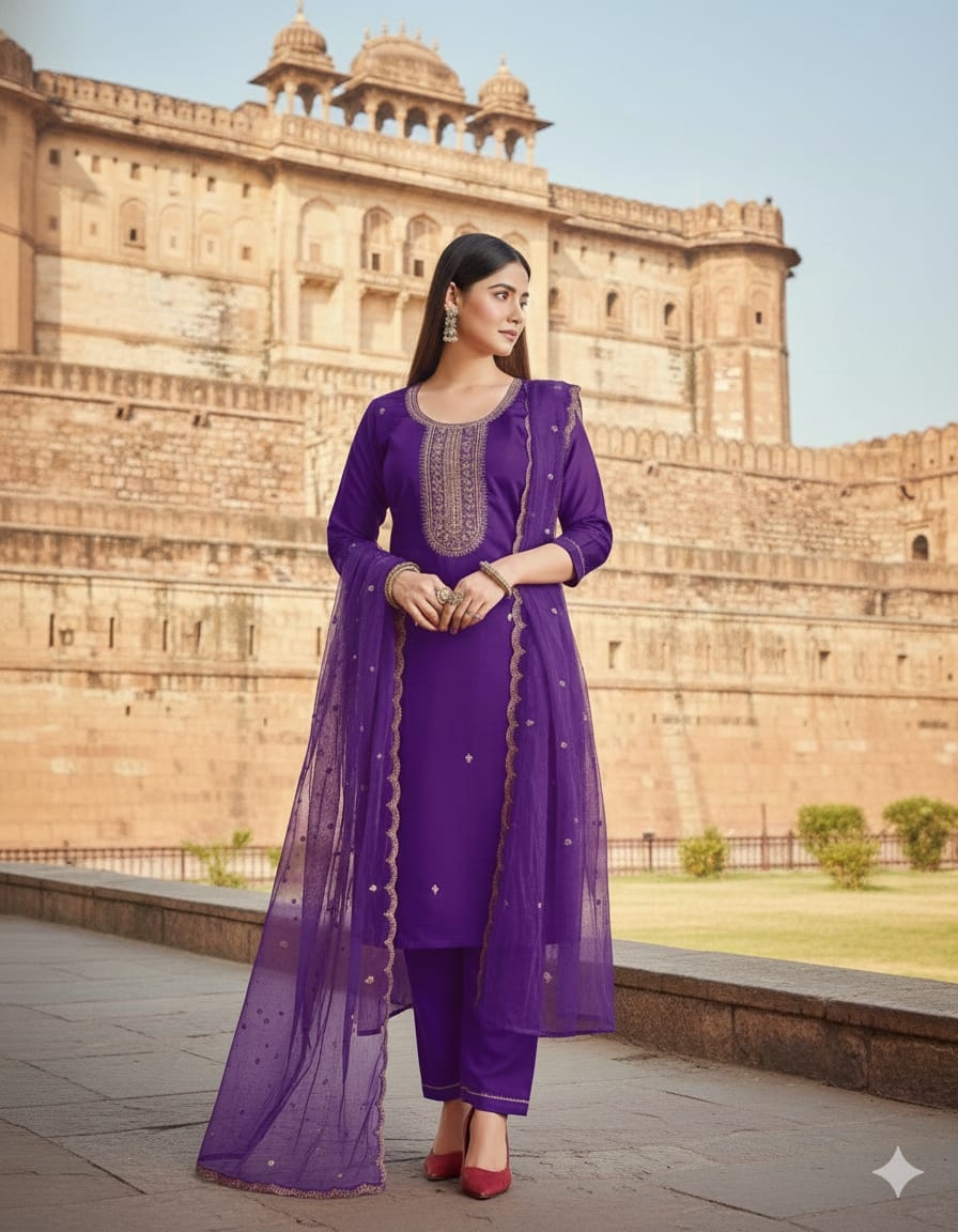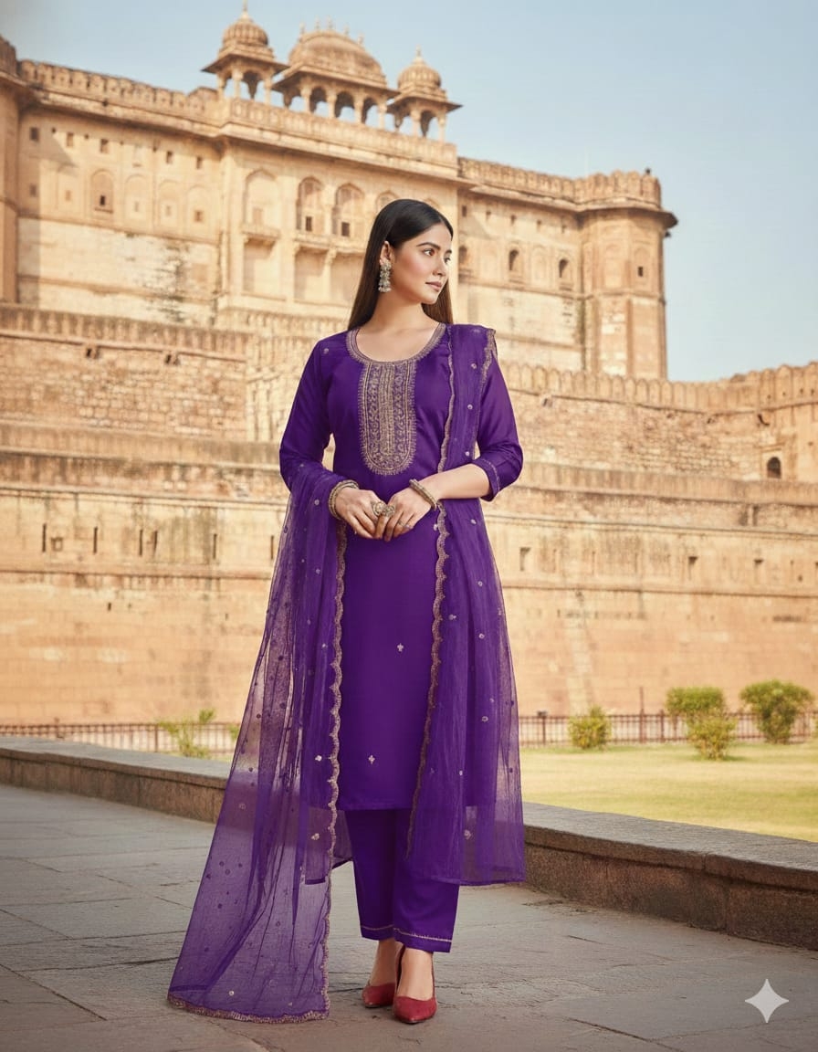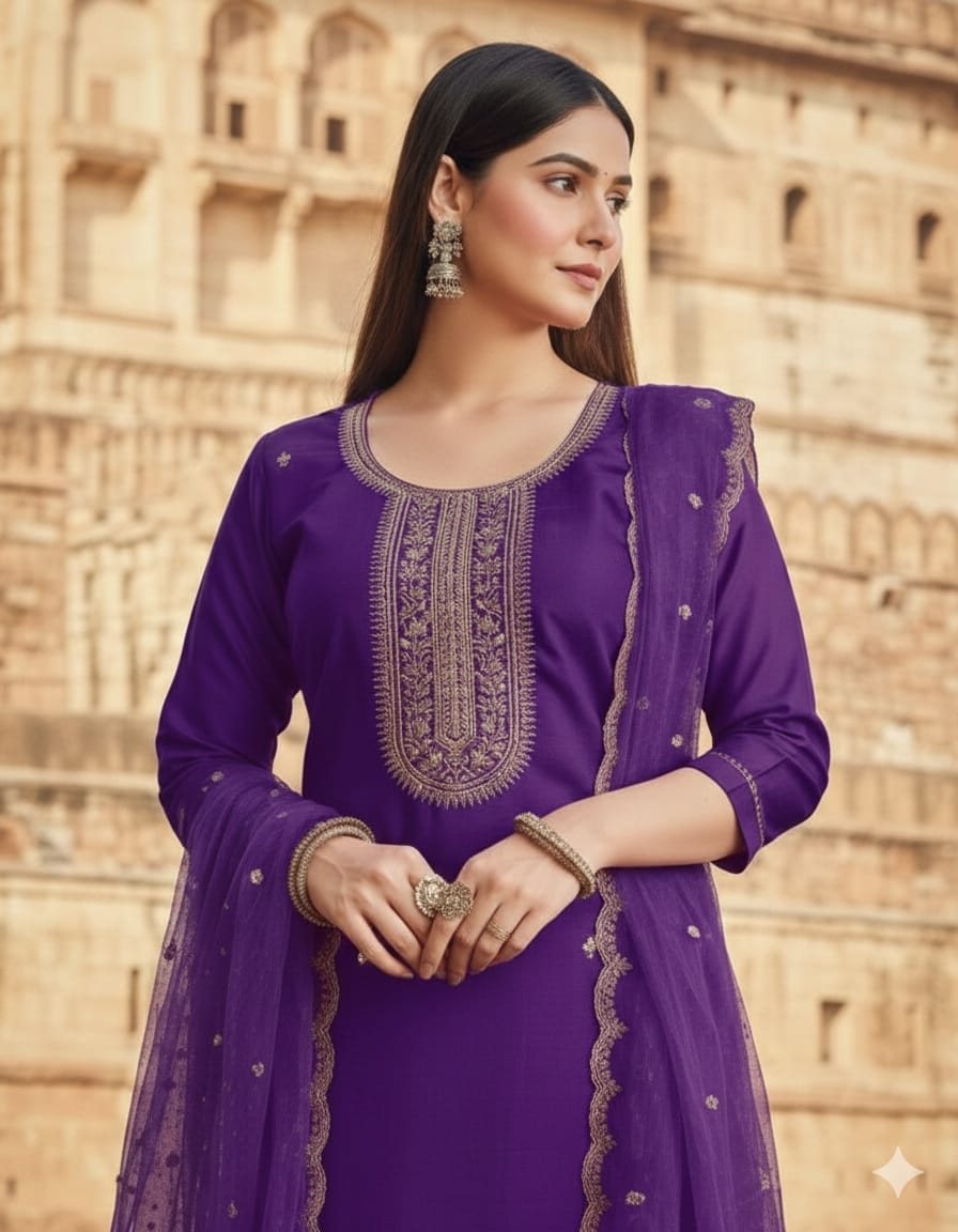 | Name: | Devika Silk Blend With Embrodeiry Work Fully Stiched Kurta & Pant Dupatta Set |