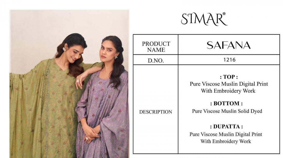 | Name: | Glossy Simar Safana 1216 Colours Viscose Muslin Wholesale Suit |
