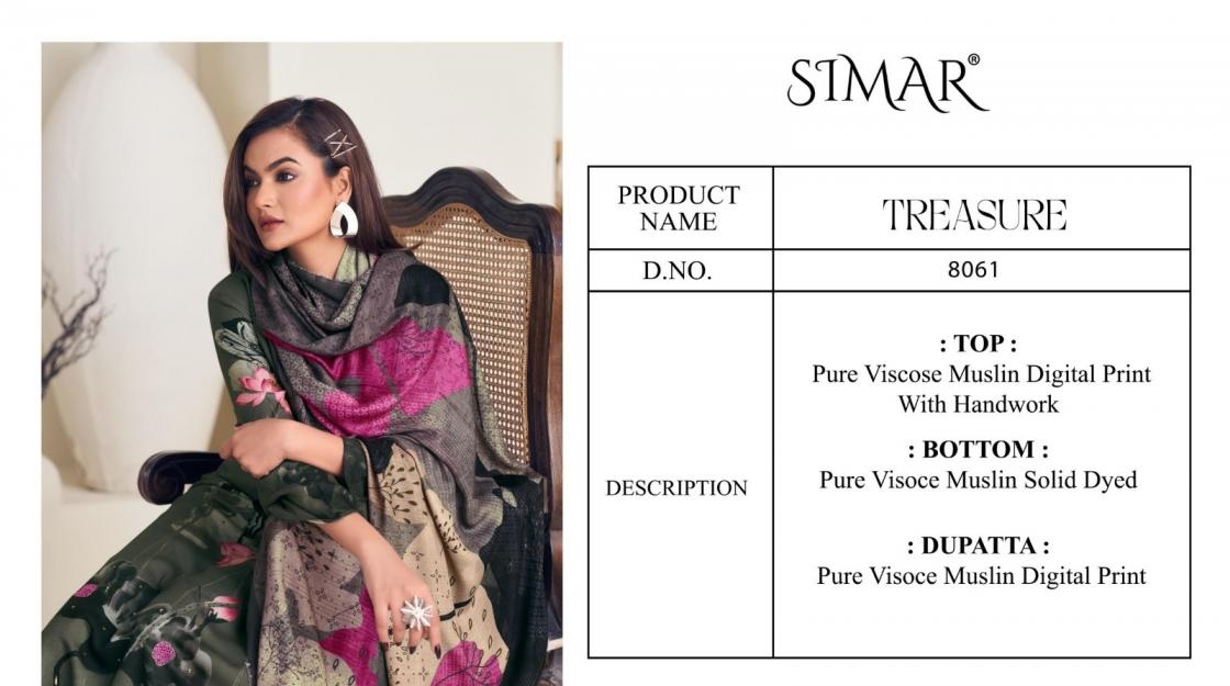 | Other Details: | BRAND - GLOSSY CATALOG - Treasure 8061 COLOUR'S FABRIC - Muslin Rate :- ₹1395/- PER PCS GST EXTRA SET TO SET |