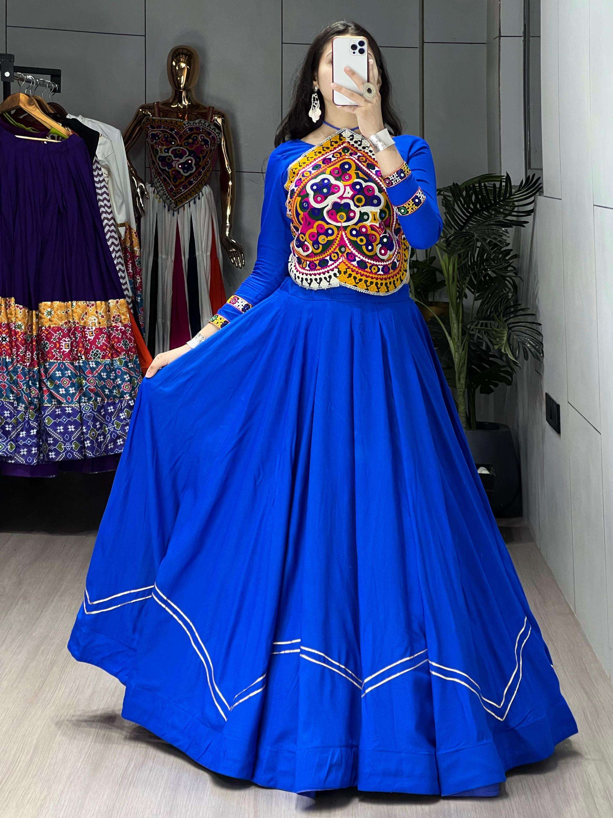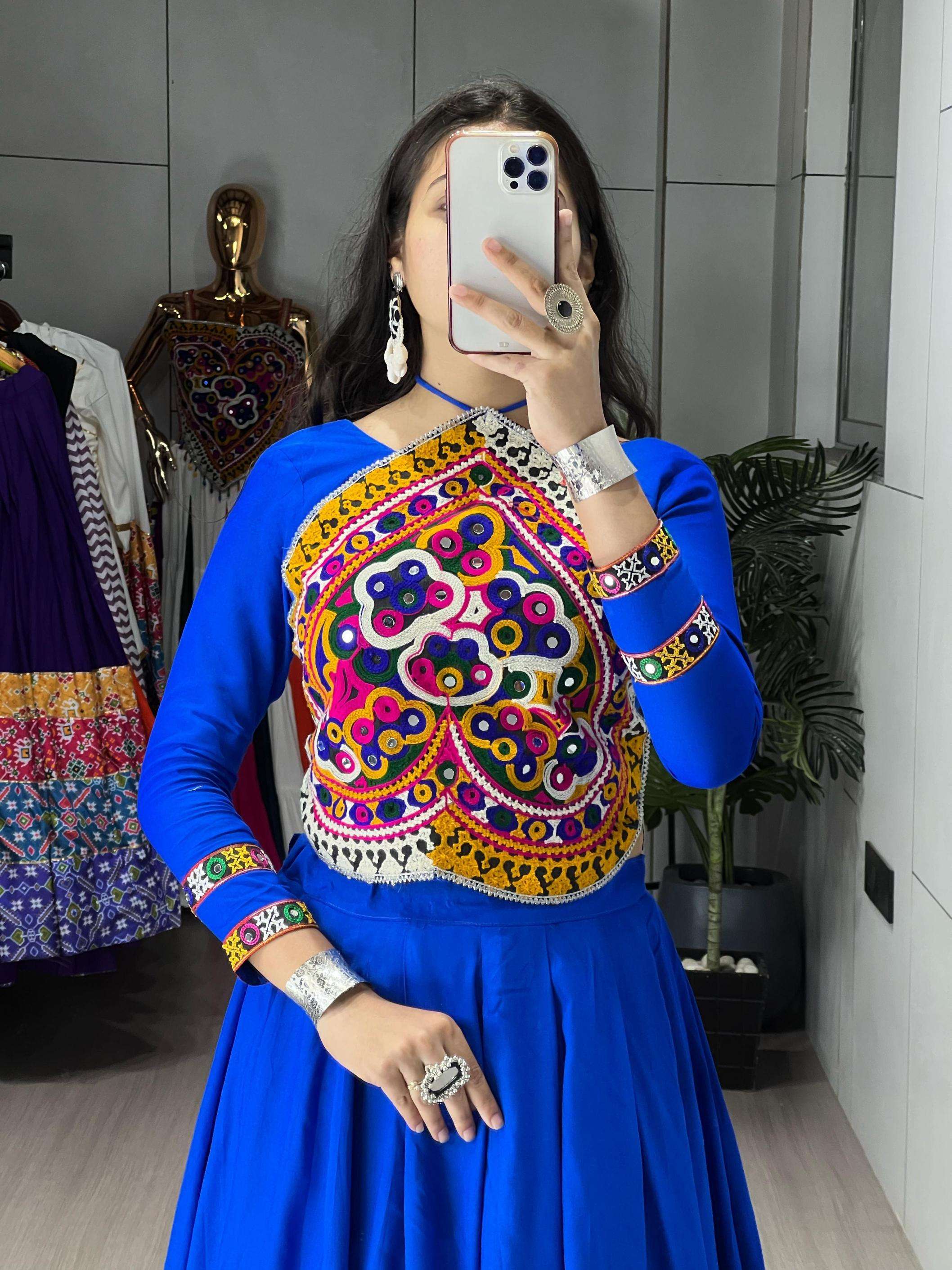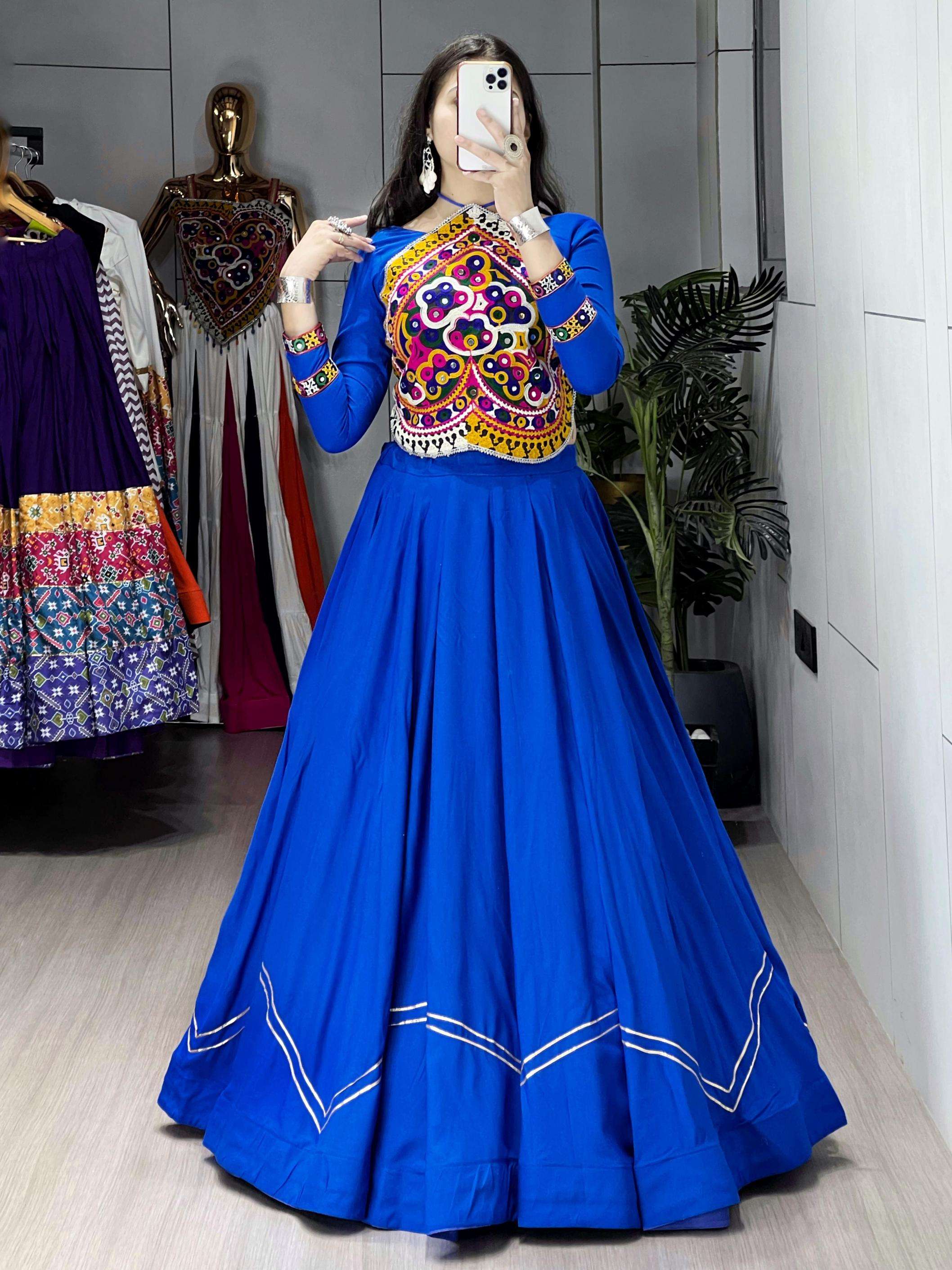 | Other Details: | Ethnic Women Cotton Lehenga Sets 👜 Navratri Collection ✨ _Flaunt ethnic elegance with this Royal Blue Navratri choli set, A perfect pick for dandiya nights, this Navratri outfit is designed with RoyalBlue Color With ZigZag Pattern and Pure Unn Kutchhi Work Fancy Top Worked With Real mirrors. _✨🌸
