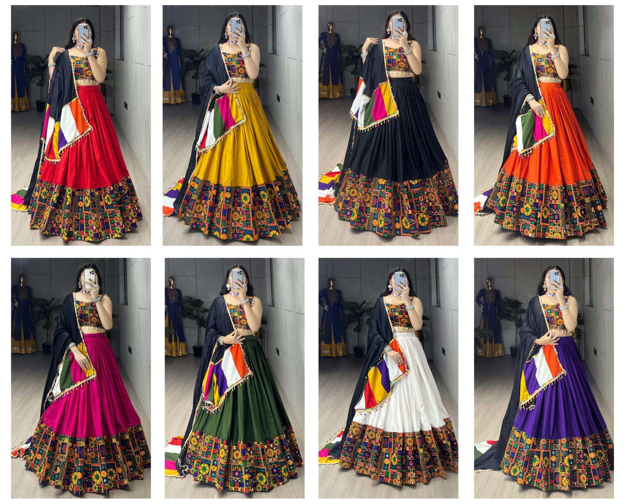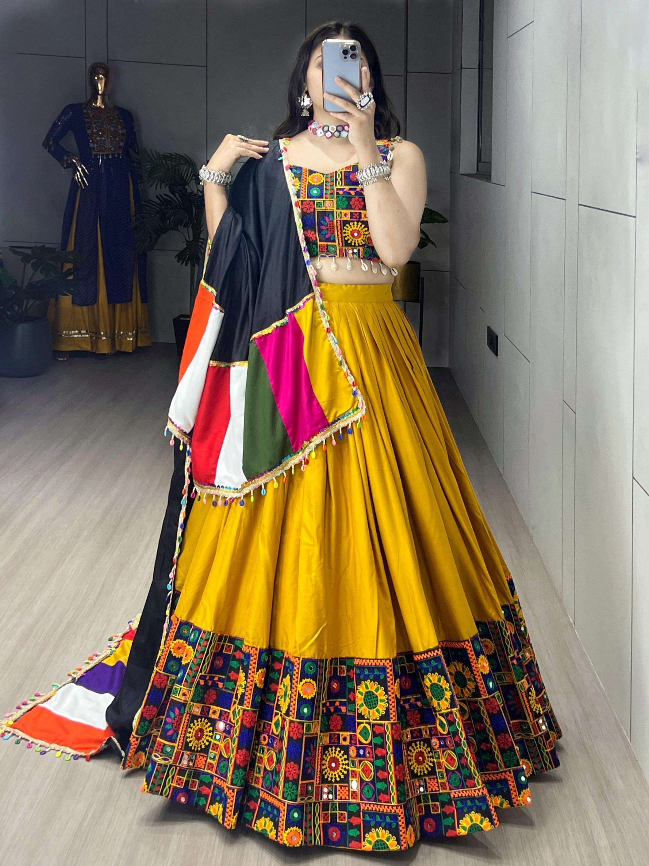 Lehenga Work: Plain With real Mirror Work Gamthi design Patta on Border
