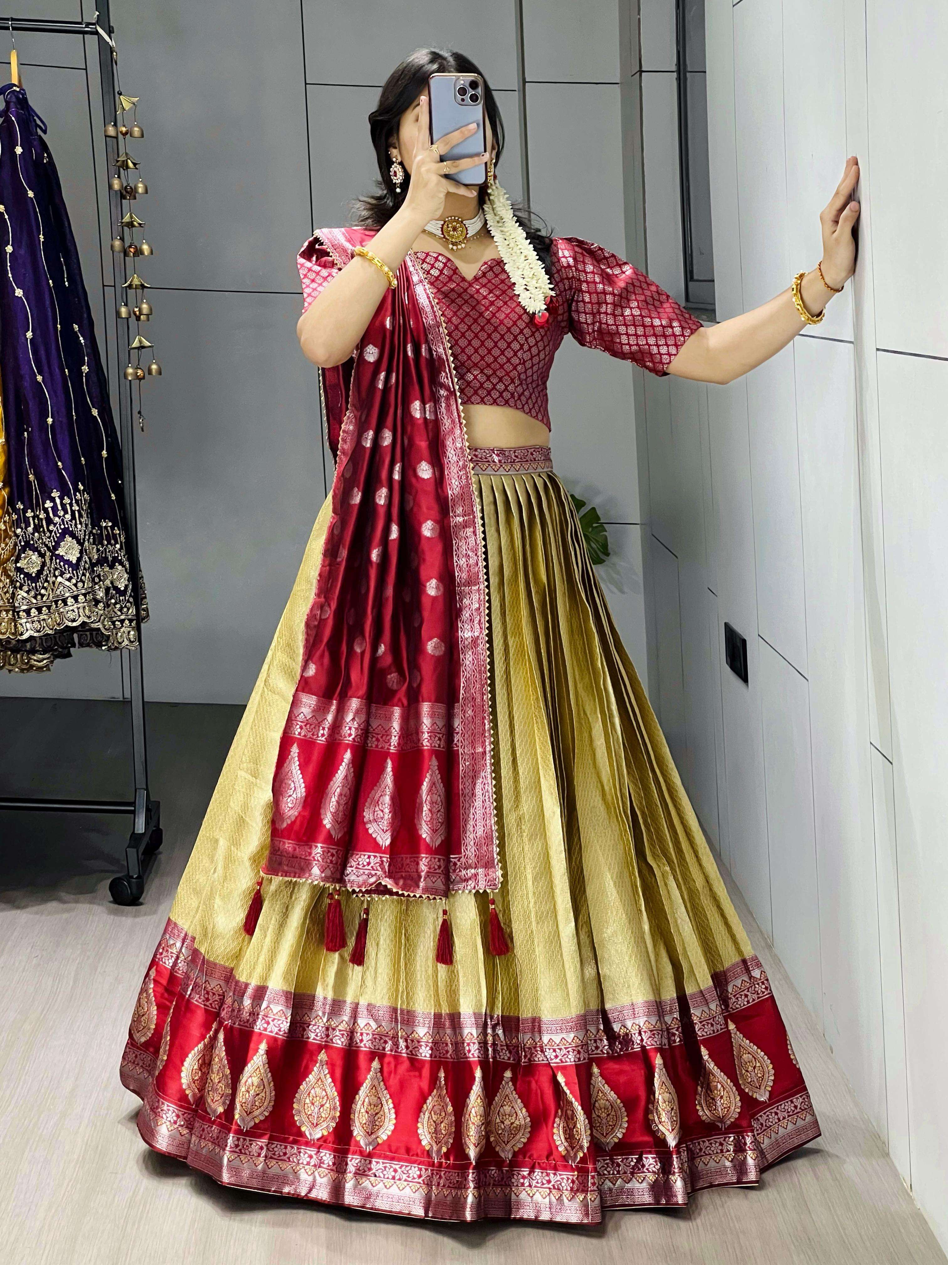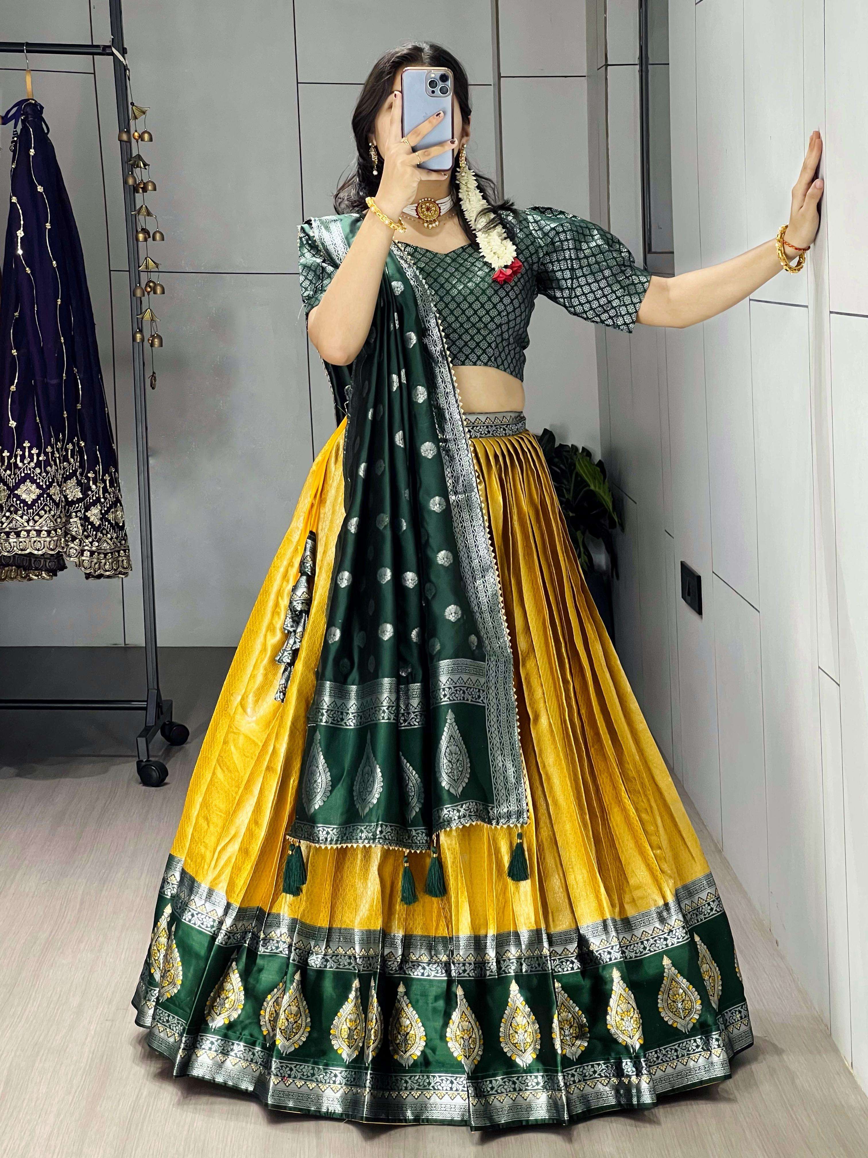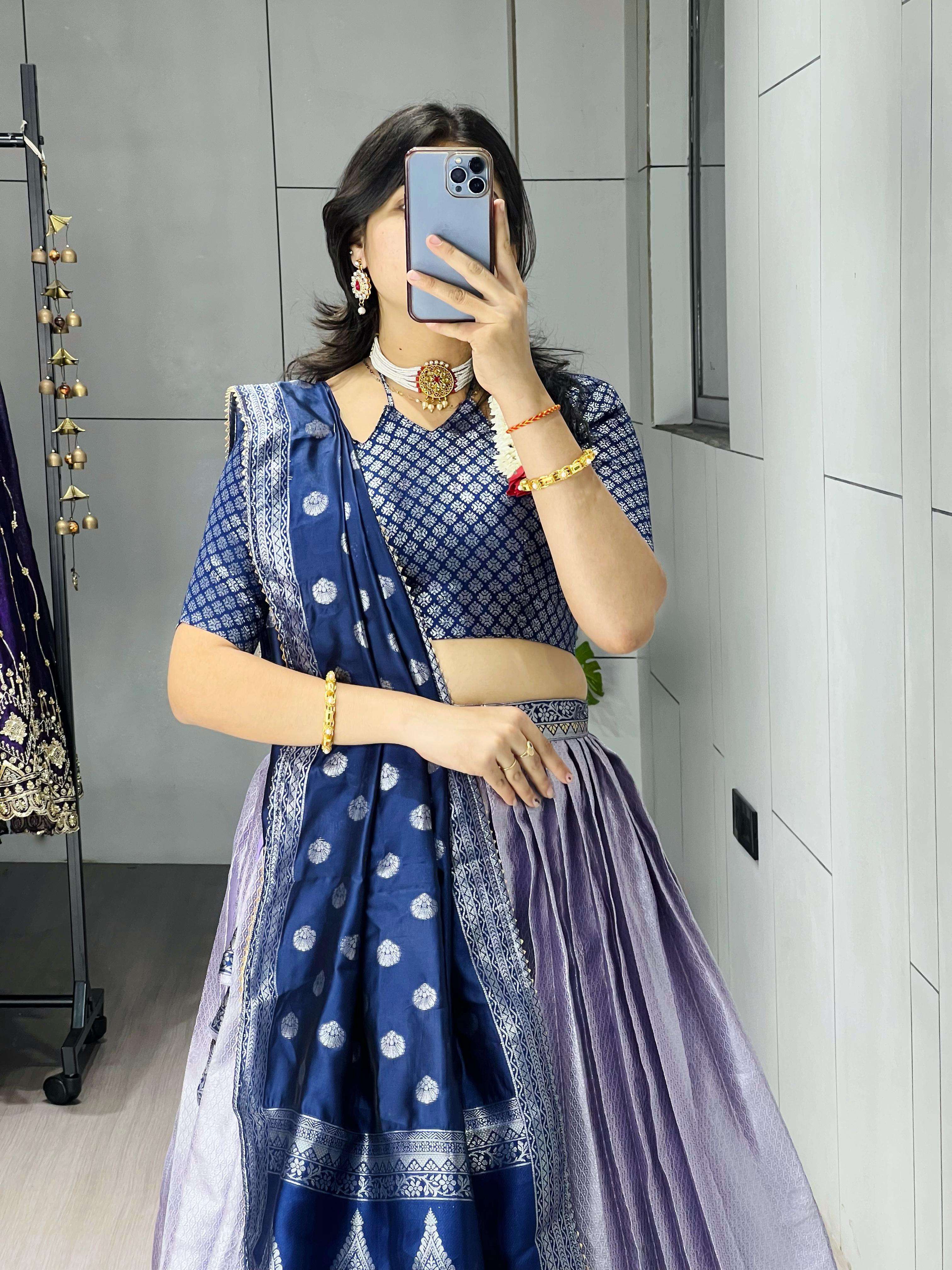 | Other Details: | New Arrivals Silk Pattu Lehenga👜 ✨ A Majestic combination of a silk skirt in deep jewel tones and a bright, contrasting dupatta, offering a perfect silhouette for weddings and grand celebrations, A Beautiful Pair of Lehenga,Blouse n Voni to Glame up a Look✨👜 GRTN8116PRPLBLU Lehenga(Stitched) Blouse(Unstitched) Dupatta Package Contain: Lehenga (Fully Stitched), Blouse(Unstitched) , Dupatta, Drawstring with Zip, Tassels