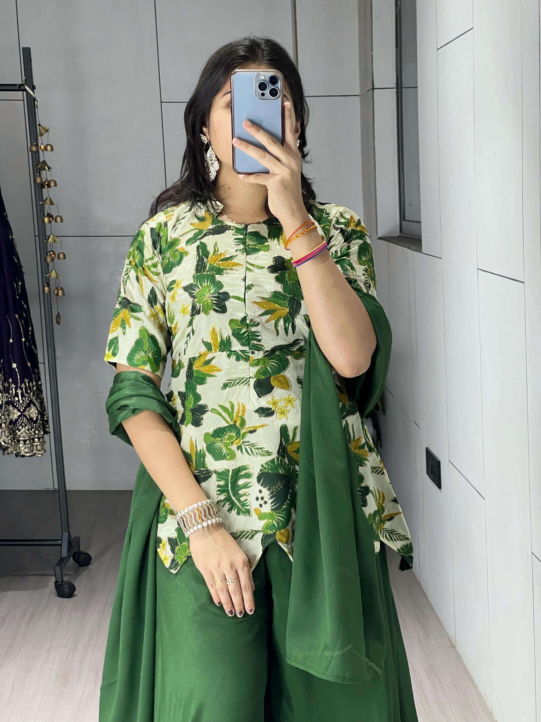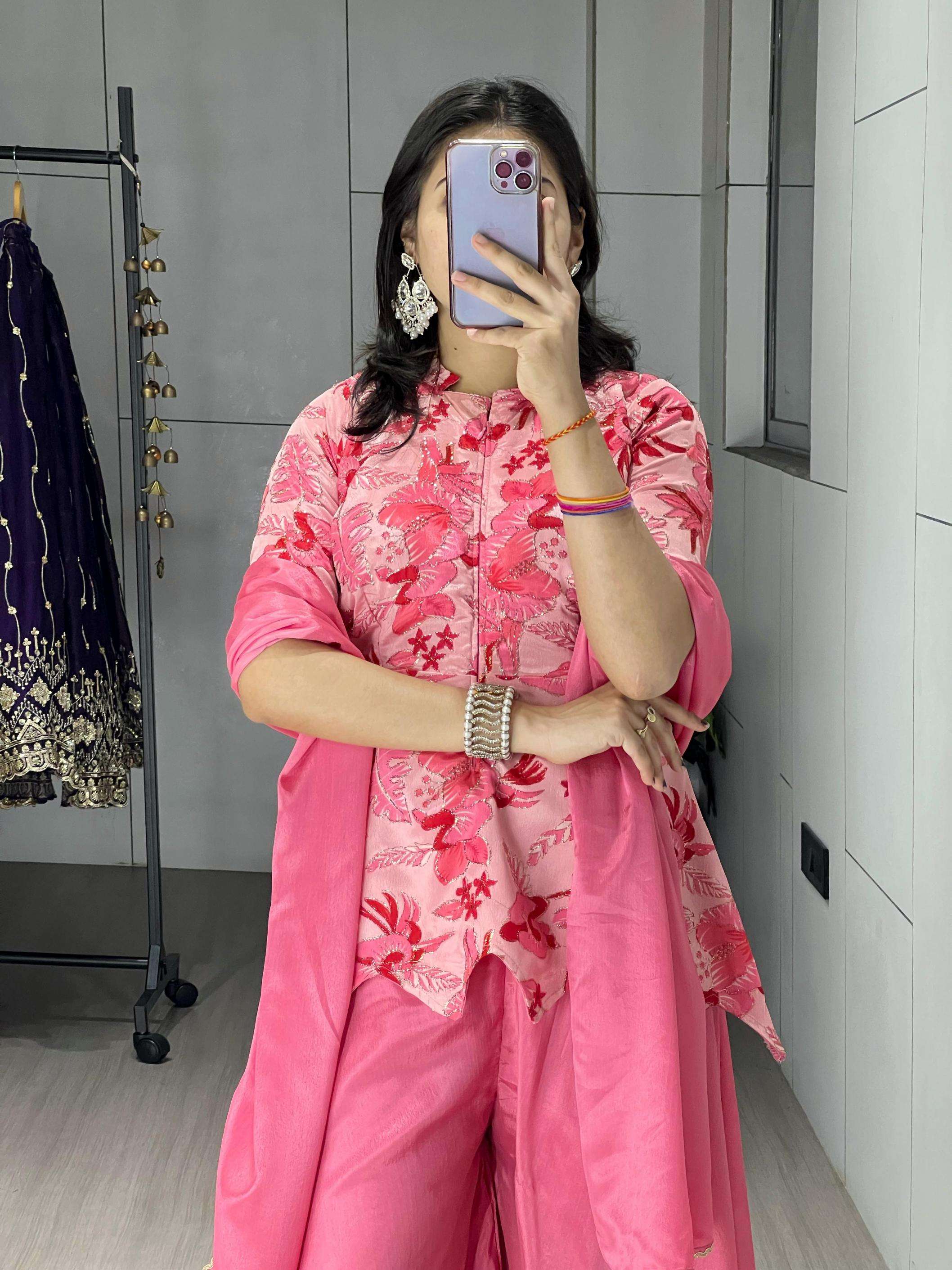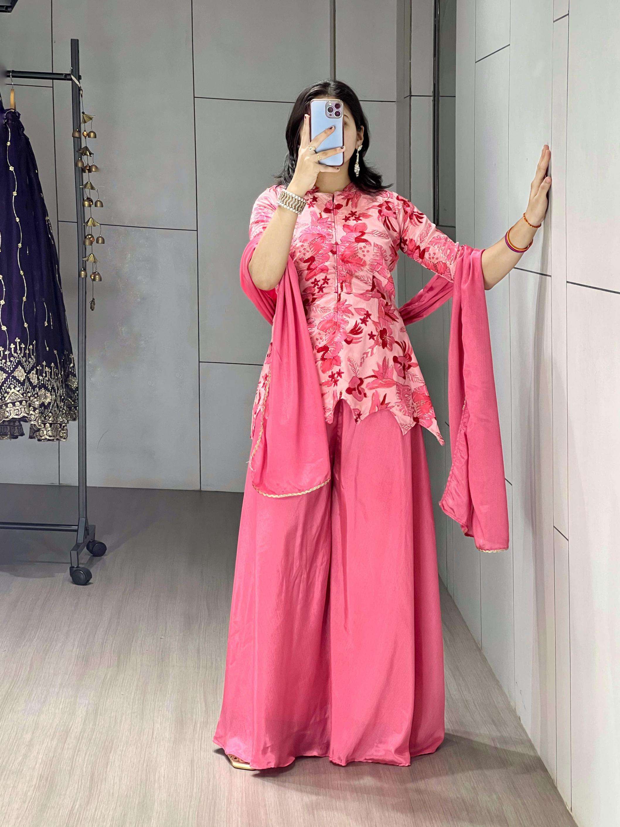 Step into effortless ethnic elegance with this beautifully coordinated Chinon plazo pair, designed for modern festive dressing.Complemented by a matching lightweight dupatta, this ensemble creates a complete and polished look.