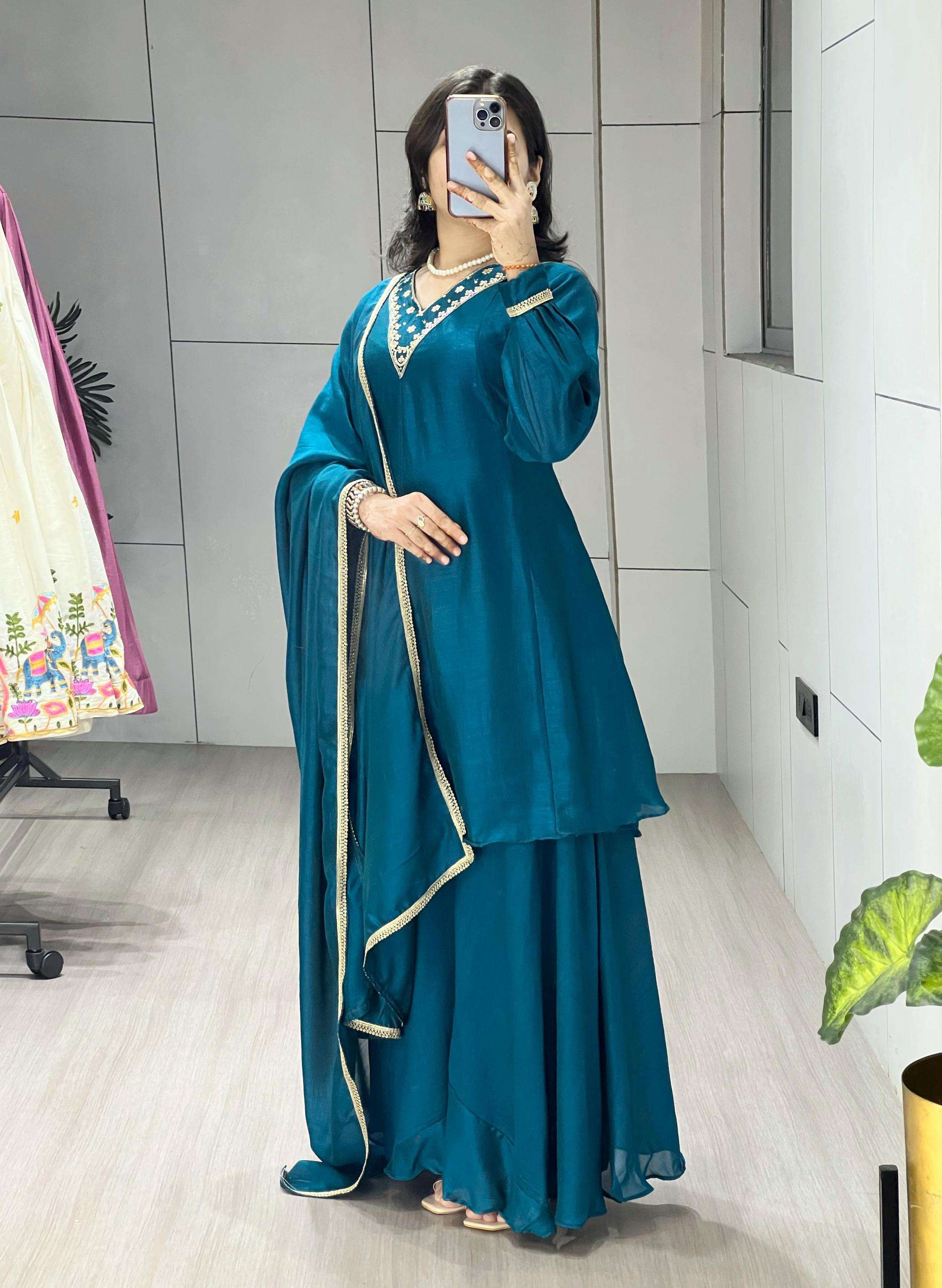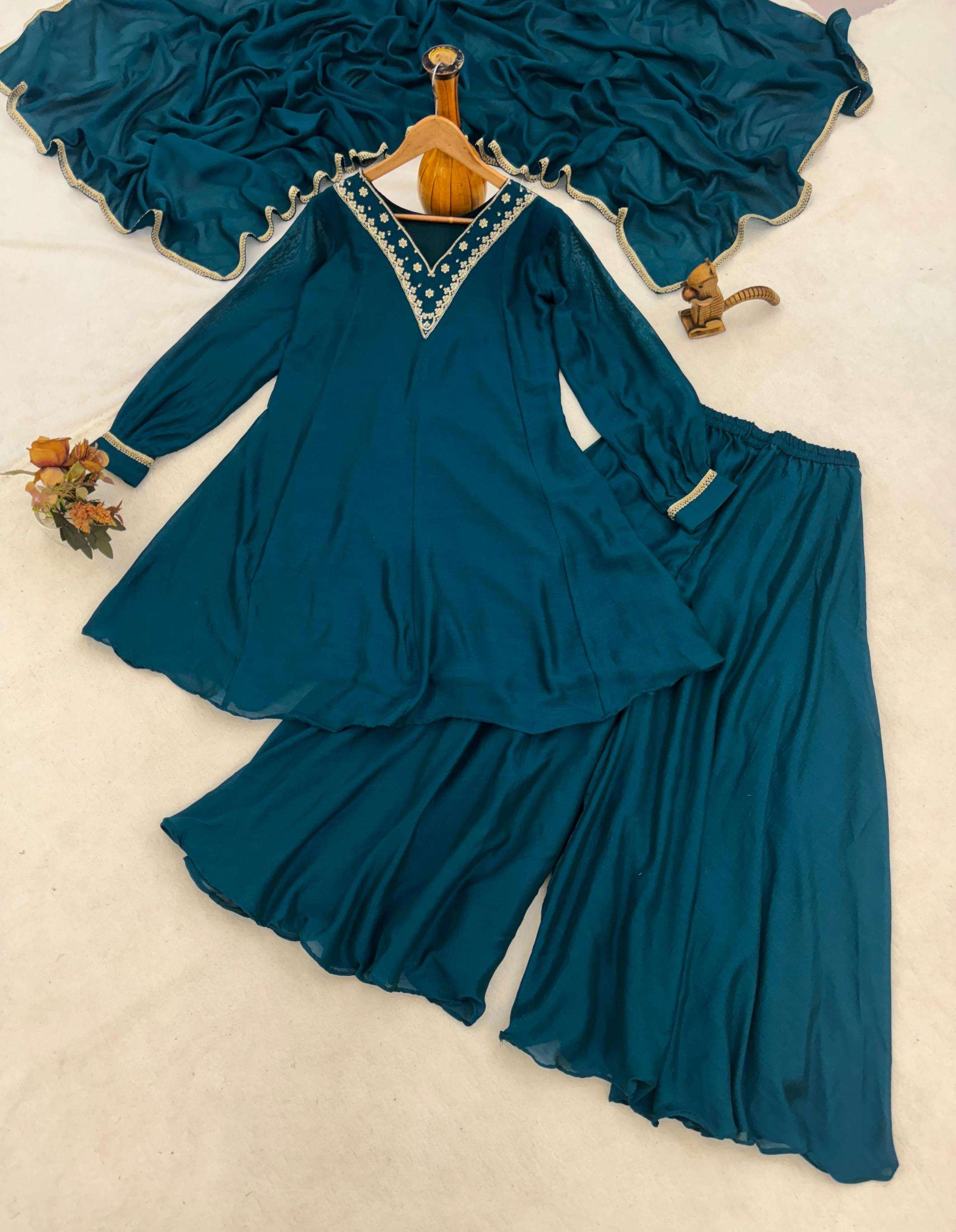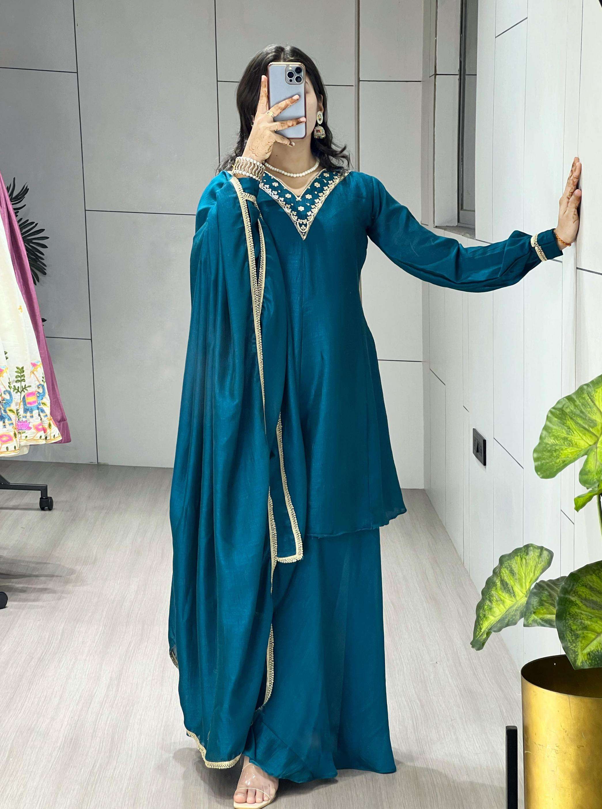 | Other Details: | Kurta Plazo Pair 👜✨ Peacock Blue elegant plazo suit set features a beautiful kurta flattering V-neckline adorned with intricate gold embroidery and sequin work, adding a touch of sparkle. It has long, slightly gathered sleeves ending with a simple gold trim. The rich color and detailed neckline make this a stylish and sophisticated choice.