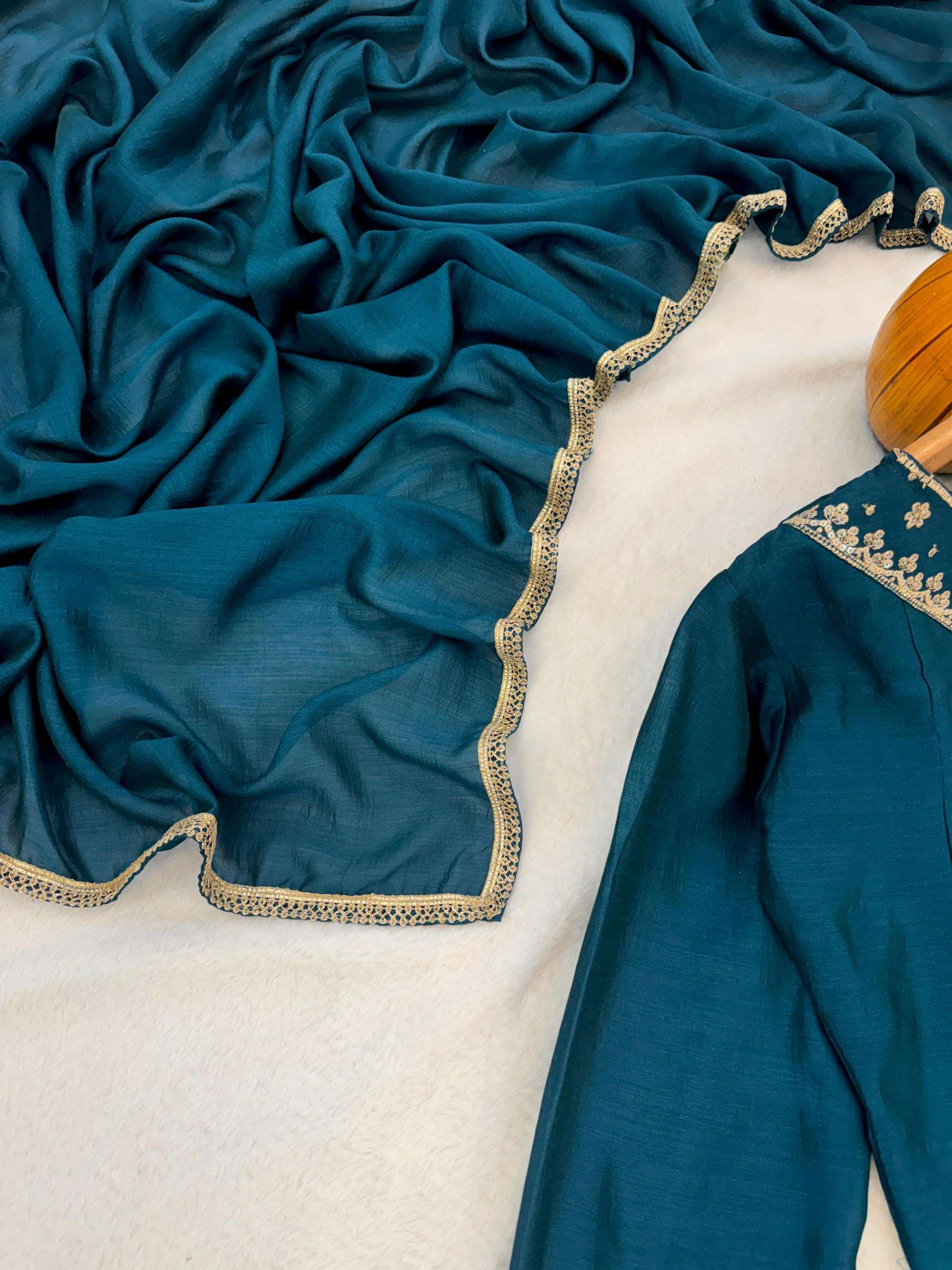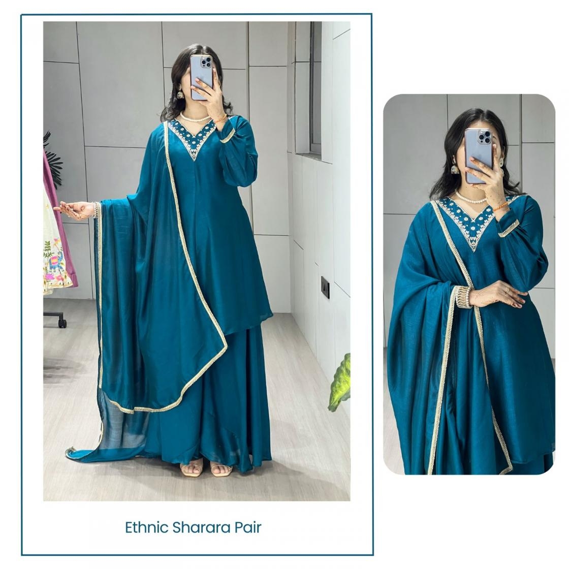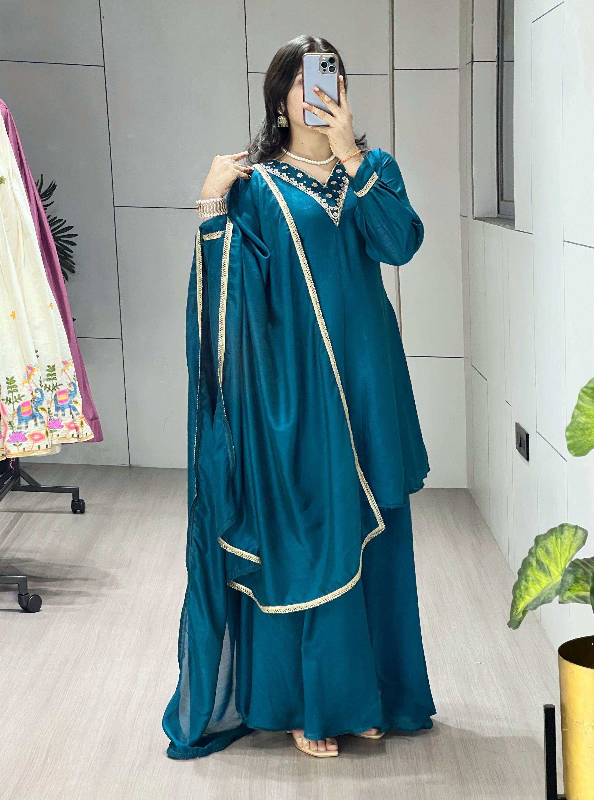 | Other Details: | Kurta Plazo Pair 👜✨ Peacock Blue elegant plazo suit set features a beautiful kurta flattering V-neckline adorned with intricate gold embroidery and sequin work, adding a touch of sparkle. It has long, slightly gathered sleeves ending with a simple gold trim. The rich color and detailed neckline make this a stylish and sophisticated choice.