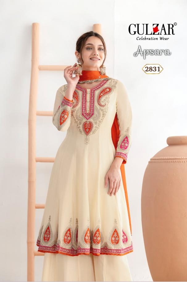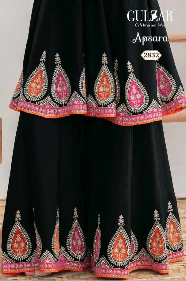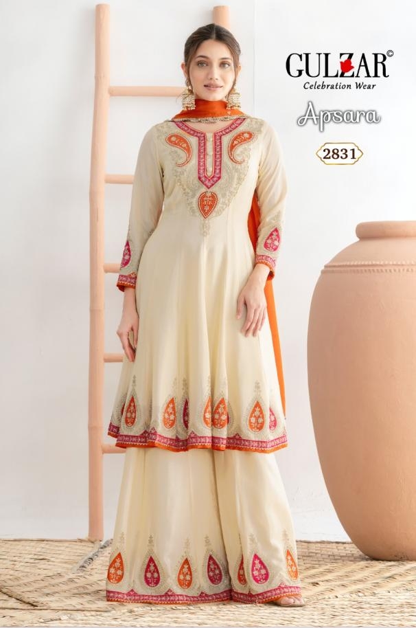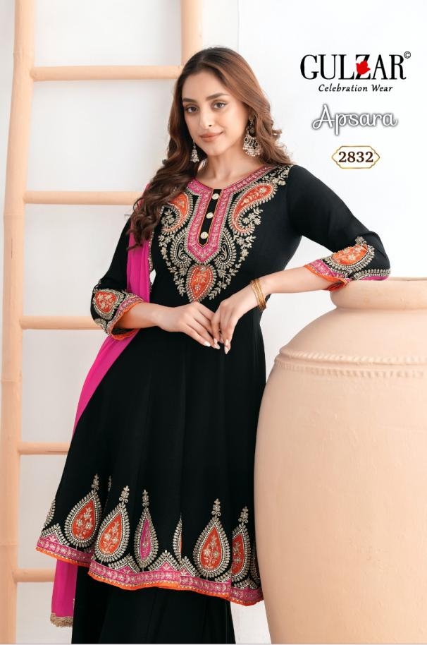 Other Details: | Apsara by Gulzar D.no. 2831-2832 2 colour per set Freesize Readymade Top: Premium Chinnon Kalidar Anarkali with applique style embroidery work on it Bottom: Beautiful kalidar palazzo on premium chinnon fabric Dupatta: premium chinnon dupatta with 4- side handmade moti lace Work details: Dabka zari ,applique style and swaroski work Rate : 2995/- |