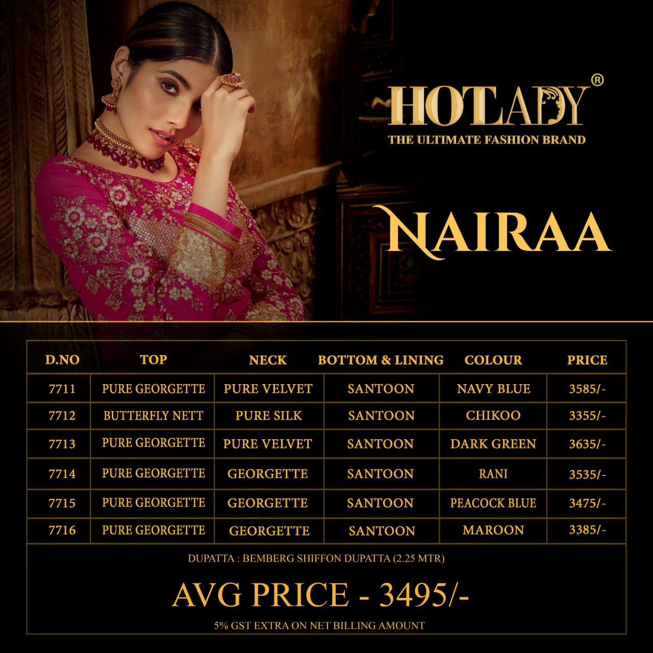| Other Details: | HOTLADY© Presents “NAIRAA†6 DESIGNS Series -7711 to 7716. Delivery Date – 07/02/2020 5 % GST EXTRA APPLICABLE ON NET BILLING AMOUNT |