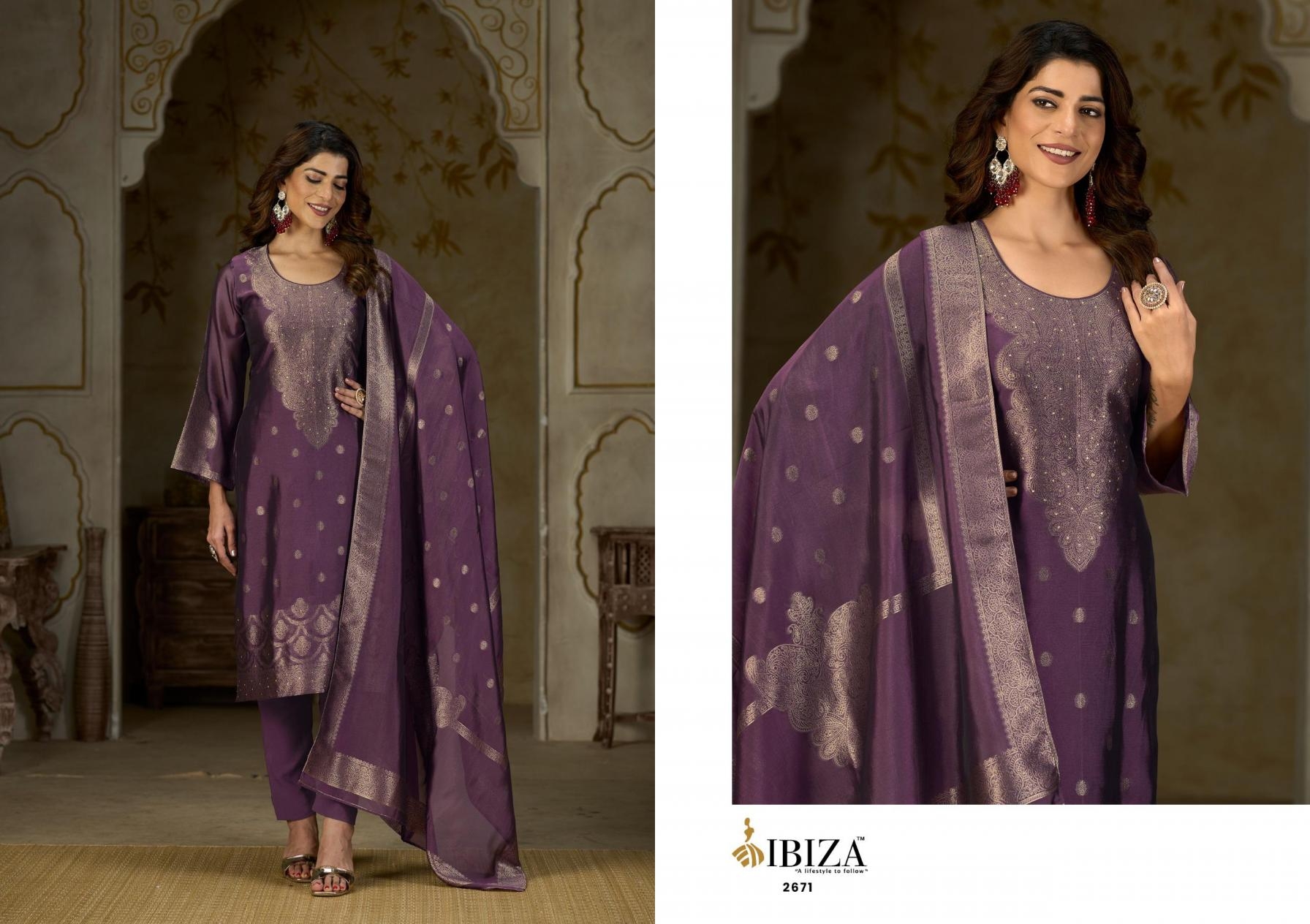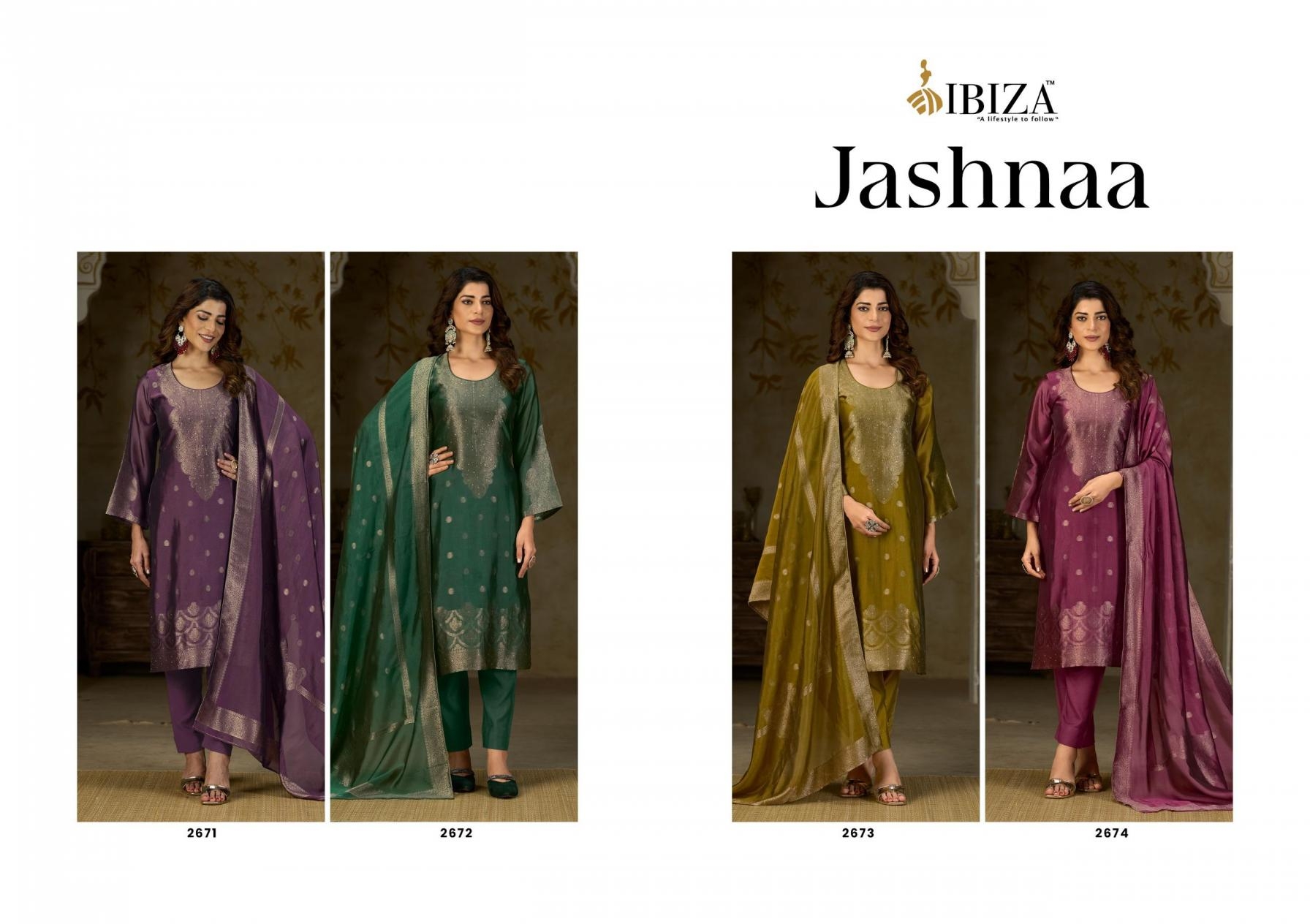 | Name: | Ibiza Jashnaa Series 2671-2674 Banglory Silk Jacquard Wholesale Suit | |