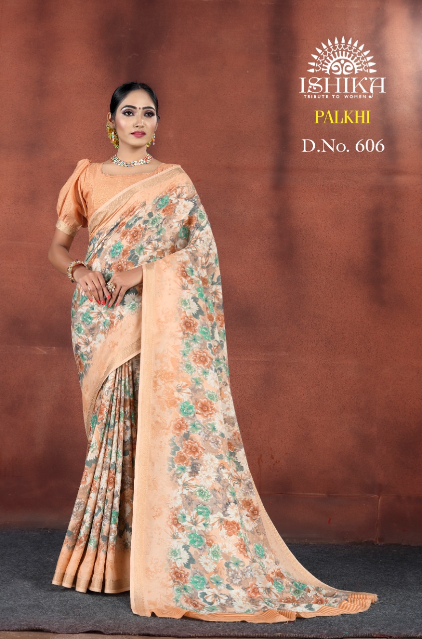 | Other Details: | We are launching our new Saree Catalog Brand – ISHIKA SAREES . Catalog Name : PALKHI Fabrics – FANCY PRINT WITH JARI BORDER * Set to set * Rate 610/- only Pc – 06 GST 5 Percent Extra. Delivery 3-4 days |