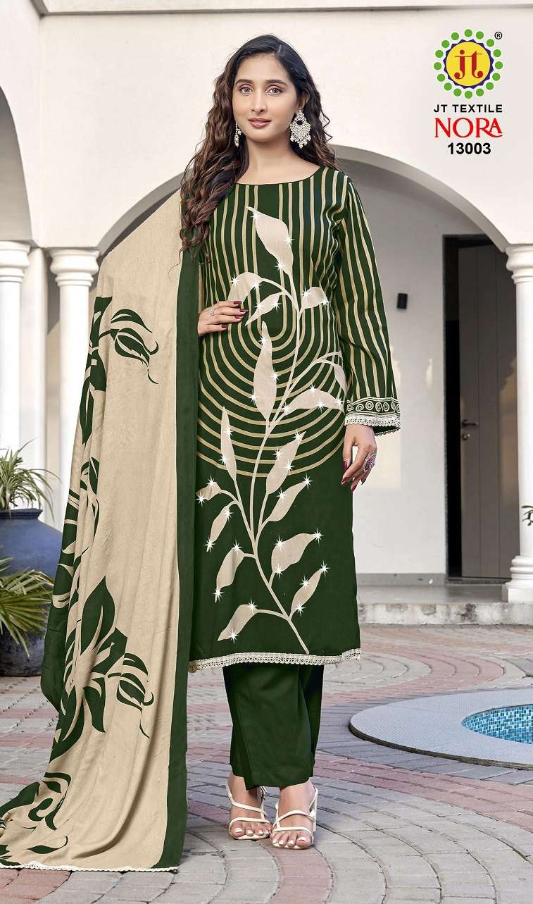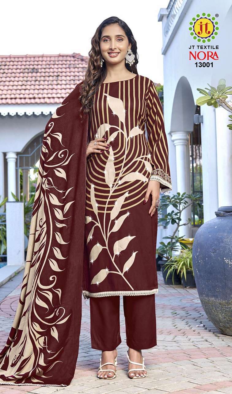 | Name: | Jt Nora Vol-13 Series 13001 To 13005 Rayon Fabric With Foil & Lace Print Salwar Kameez In Wholesale Surat |