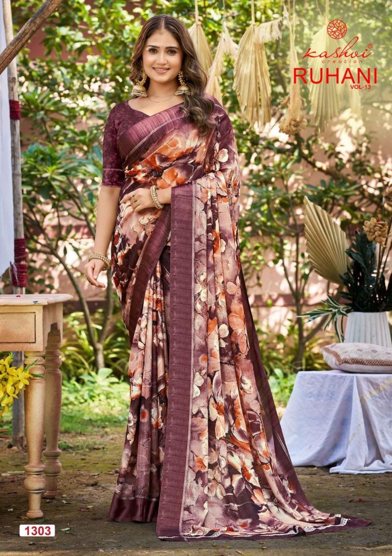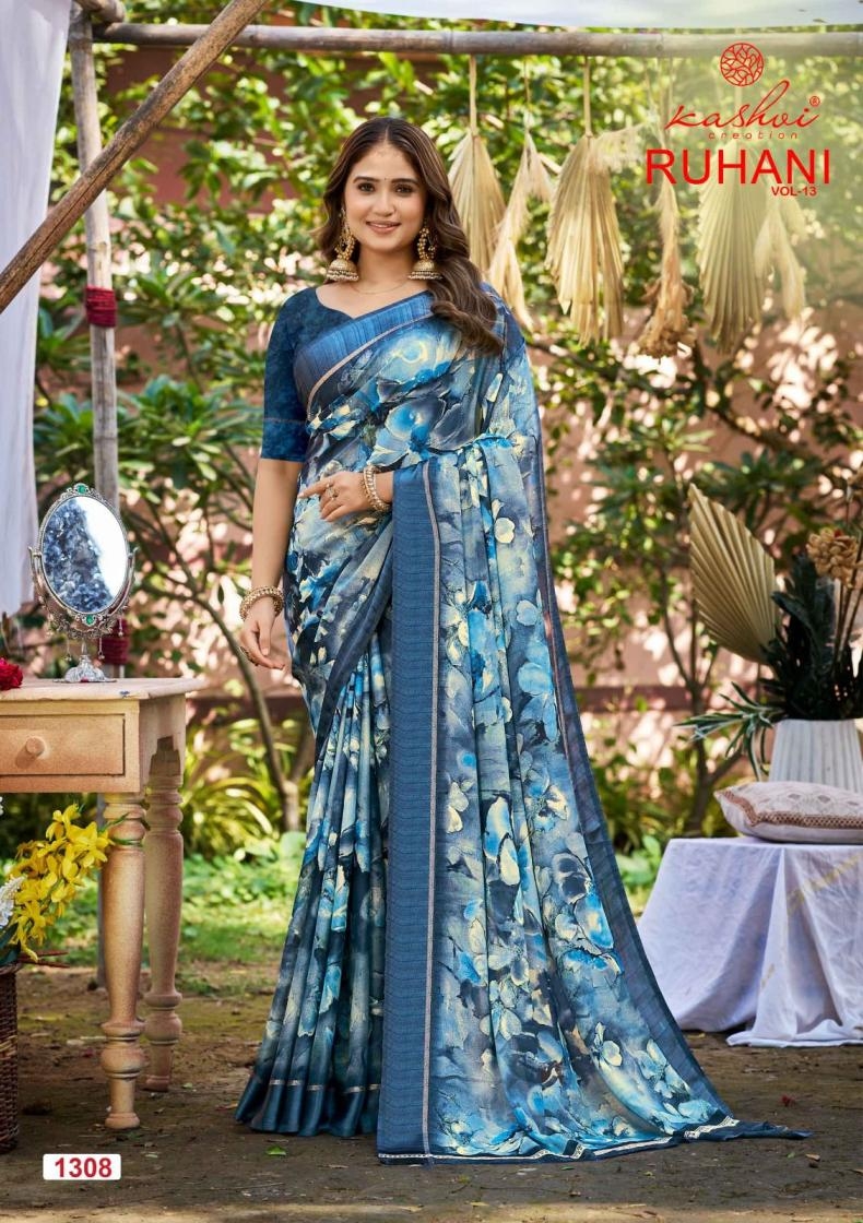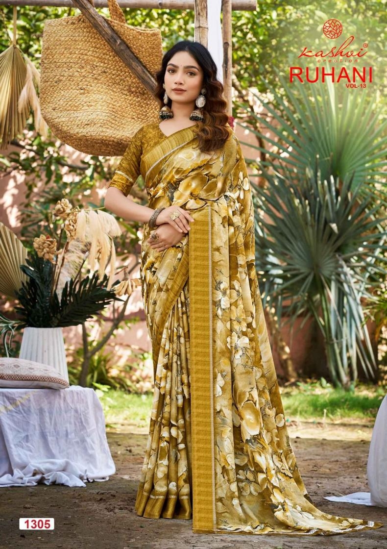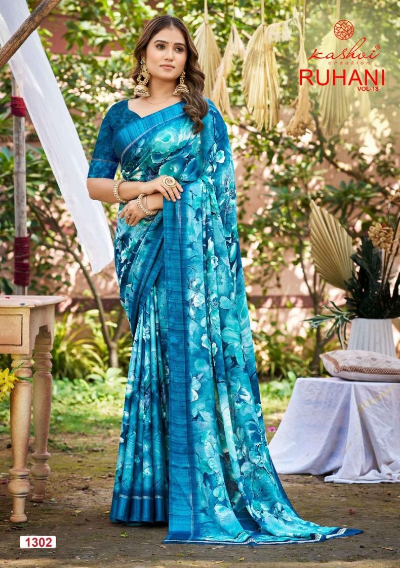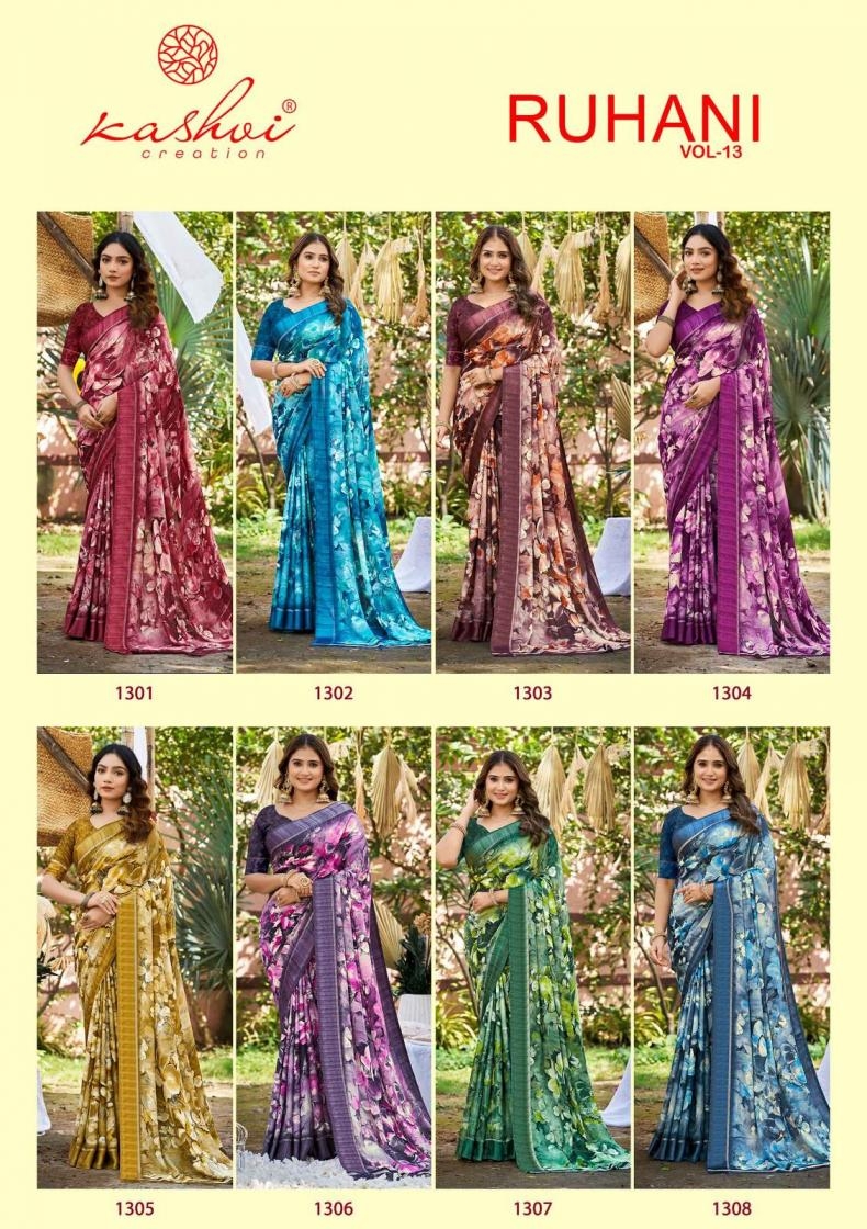 | Name: | Kashvi Creation Ruhani Vol 13 Series 1301 To 1308 Dull Moss Satin Patta Printed Sarees In Wholesale Surat |