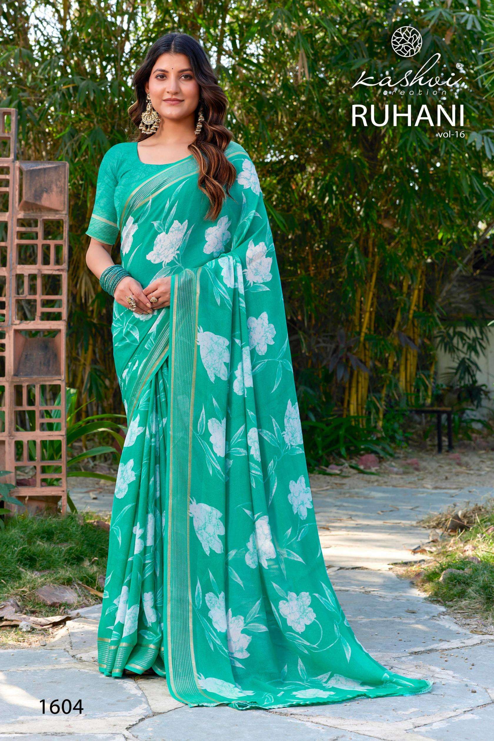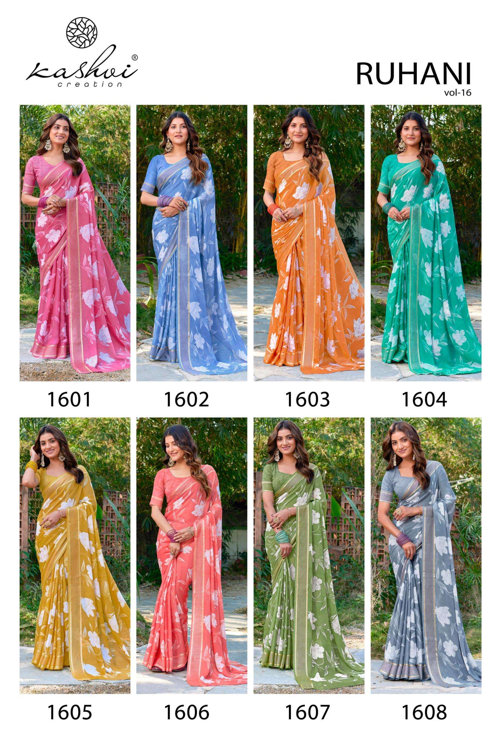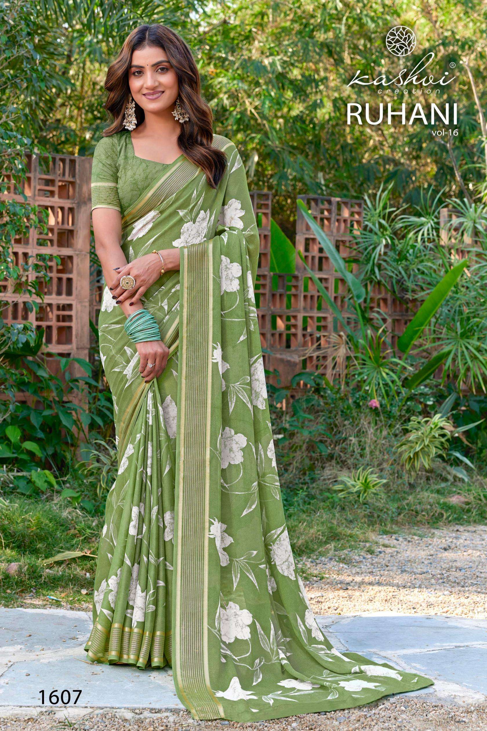 | Name: | Kashvi Ruhani Vol 16 Series 1601-1608 Dull Moss Satin Wholesale Saree |