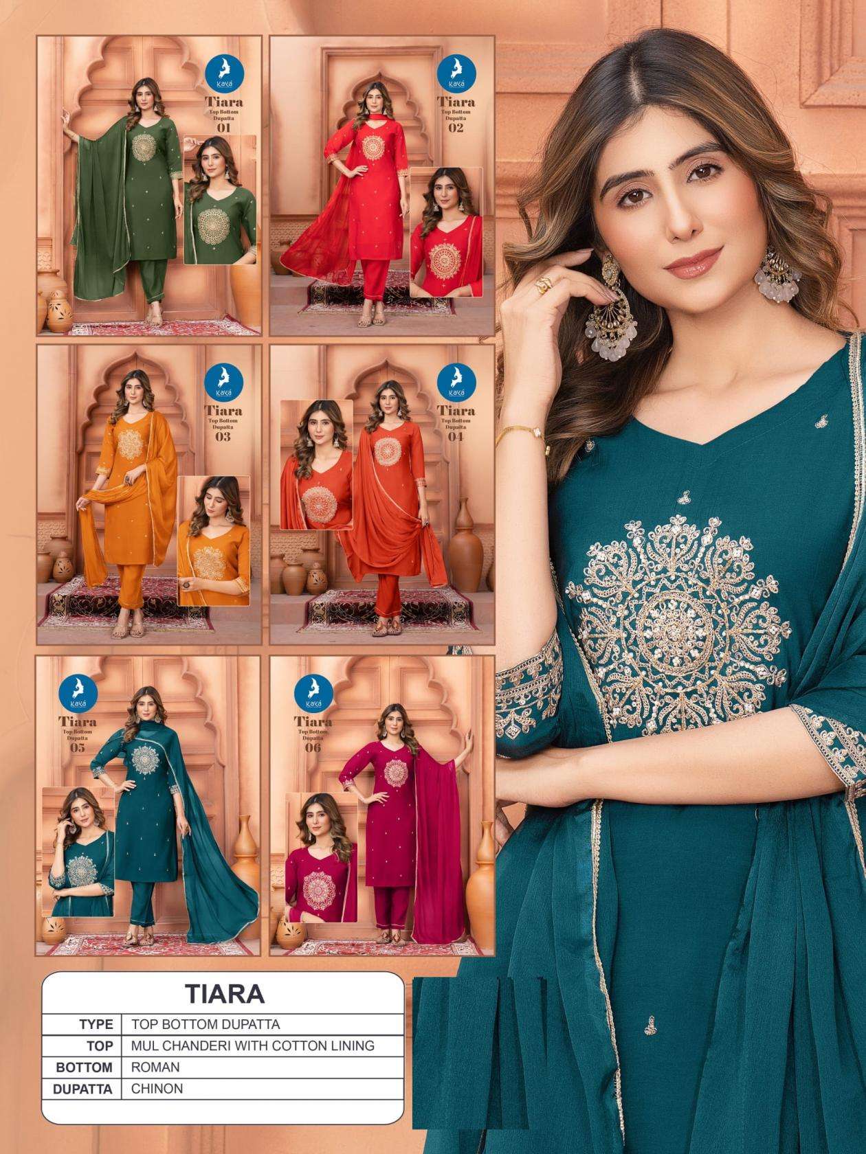 | Name: | Kaya Tiara Series 01-06 Mul Chanderi Wholesale Readymade Suit |
