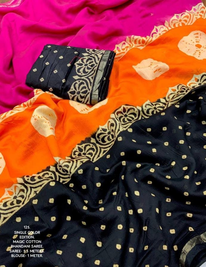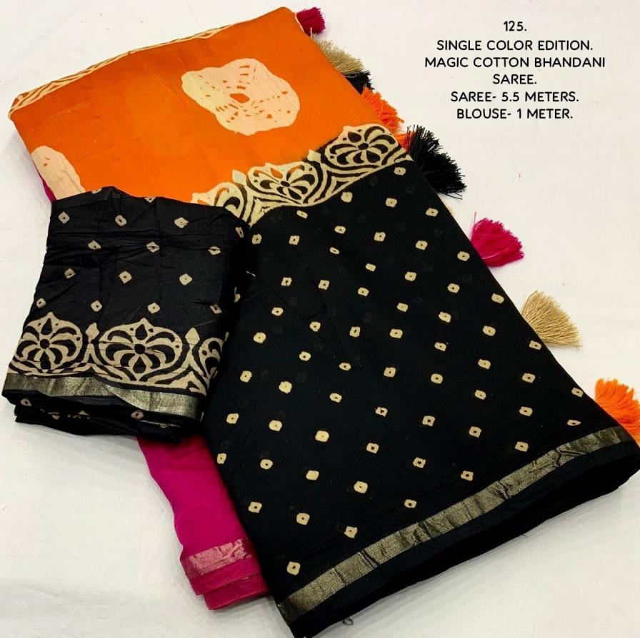 | Other Details: | New magic cotton single color edition from kc kc- 125 kc- magic rangoli. Quality- pure chanderi cotton saree with zari pattu border. Multicolor tye and dye with hand block bhandani prints. Blouse- pure chanderi cotton bhandani printed blouse. Rate - 1350+ship Top premium quality from kc |