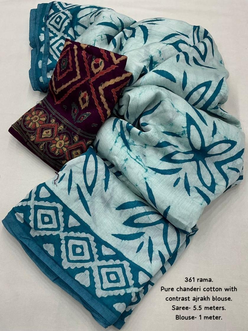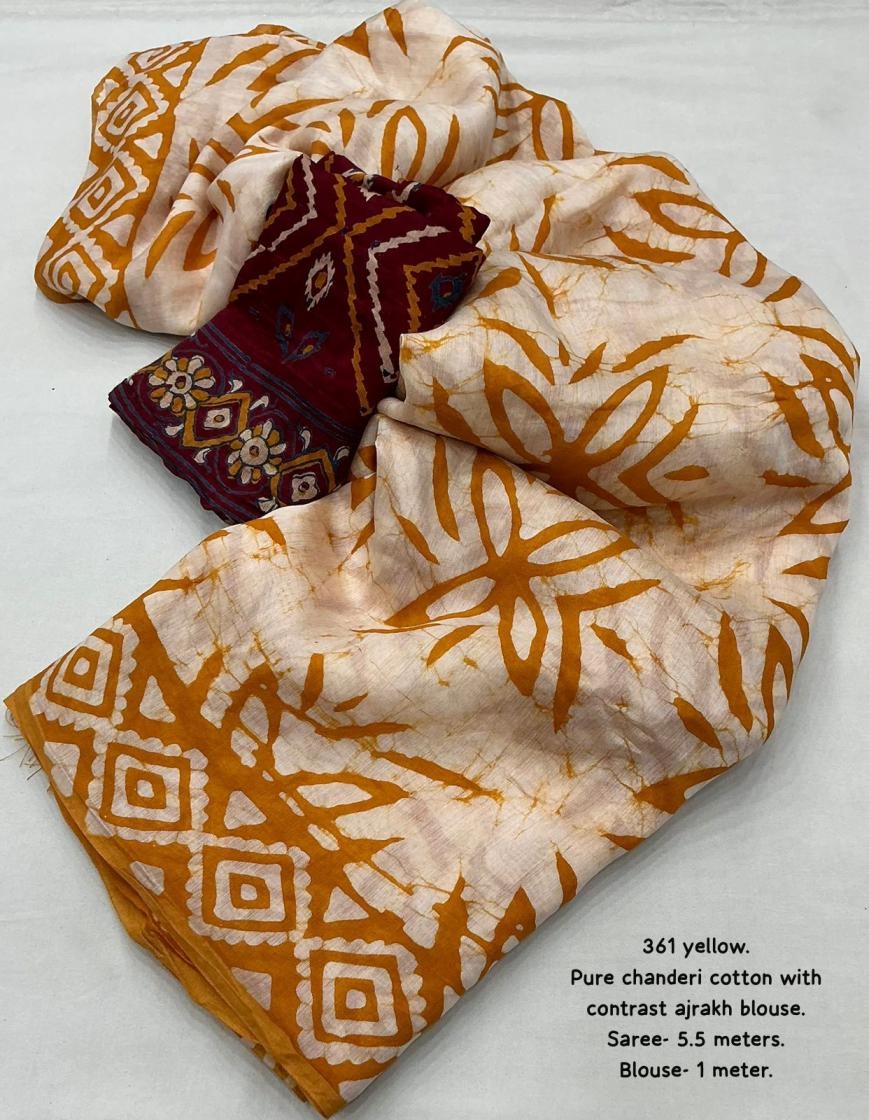 | Other Details: | new arrivals New fancy hand made batik prints saree with fancy designer blouse. kc - 361 magic cotton. Pure chanderi cotton saree hand batik prints. Cotton tassels on pallu. Contrast ajrakh block prints blouse on pure chanderi cotton. Rate - 950+ship Top trusted quality |