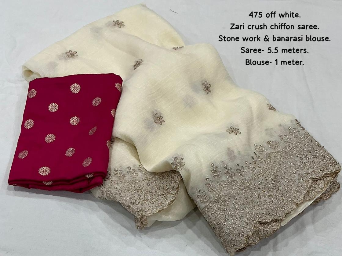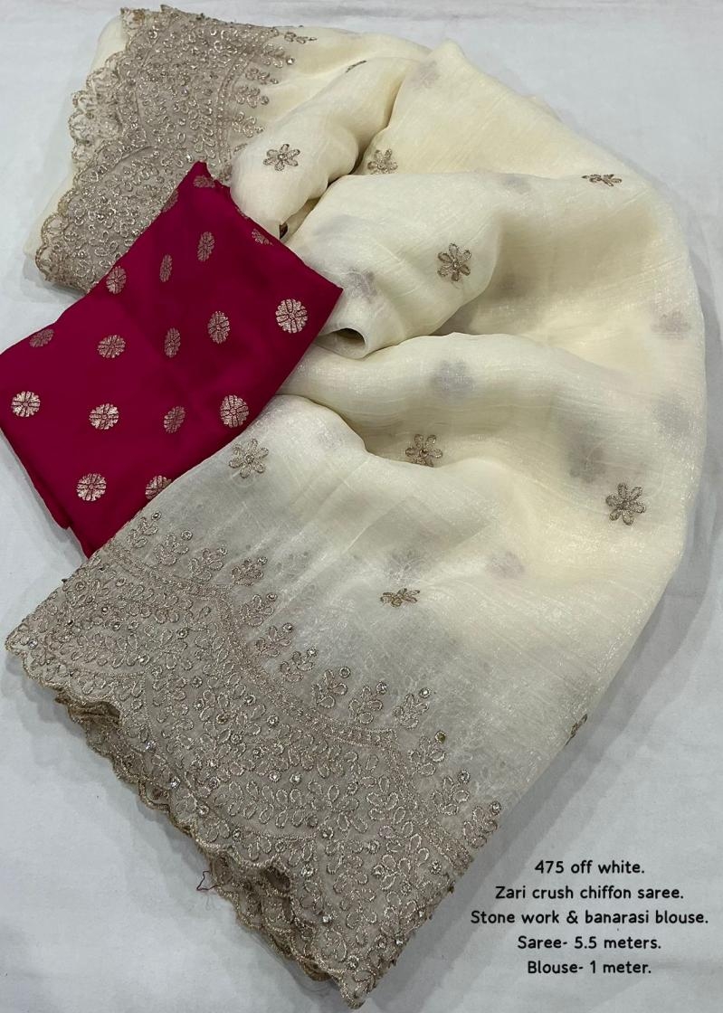 | Other Details: | NEW ARRIVALS New fancy off white emboridary saree Single color edition. kc - 475 zari crush (d-3) Quality- soft crunchy crush saree with zari emboriday and stone work on it. Blouse- Contrast rani color banarsi zari woven blouse. Rate - 1400+ship. Top premium quality |