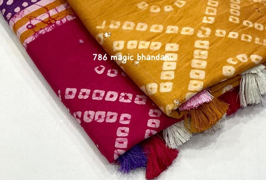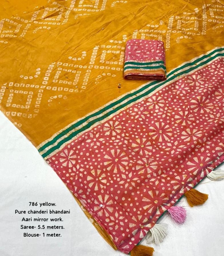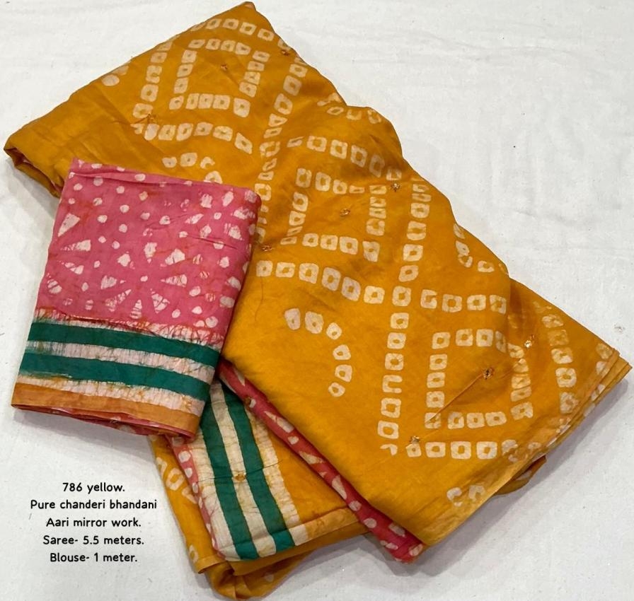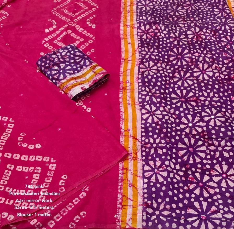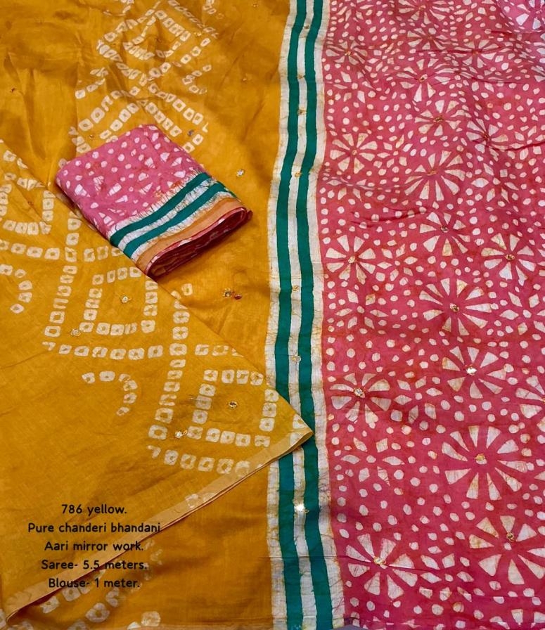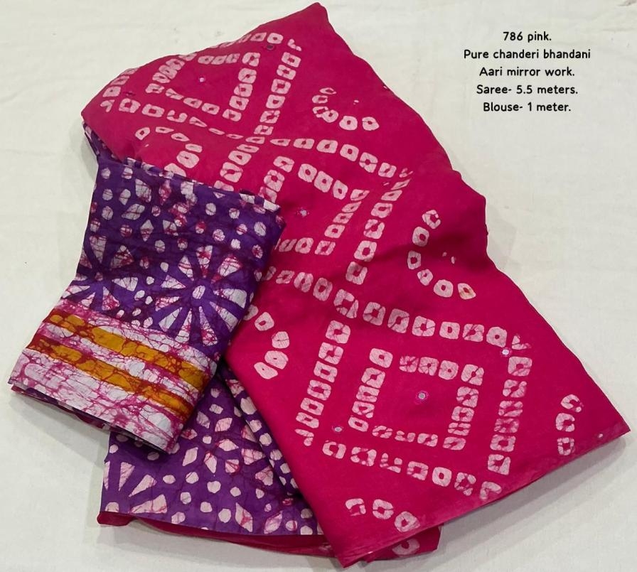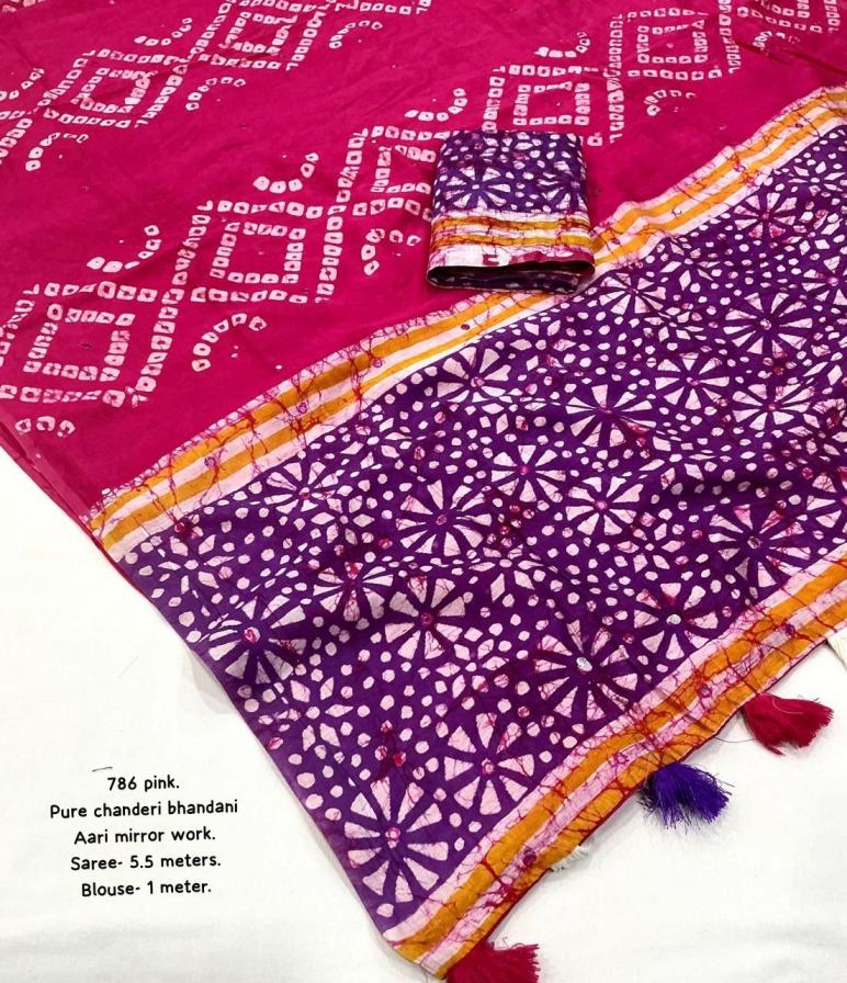 | Other Details: | new arrivals New pure chanderi hand block bhandani saree. kc - 786 magic bhandani Pure chanderi hanblock bhandani colotfull saree. Full of aari mirror work and cotton tassels on pallu. Running pure chanderi block printed blouse. Rate - 1350+ship. Top trusted quality |