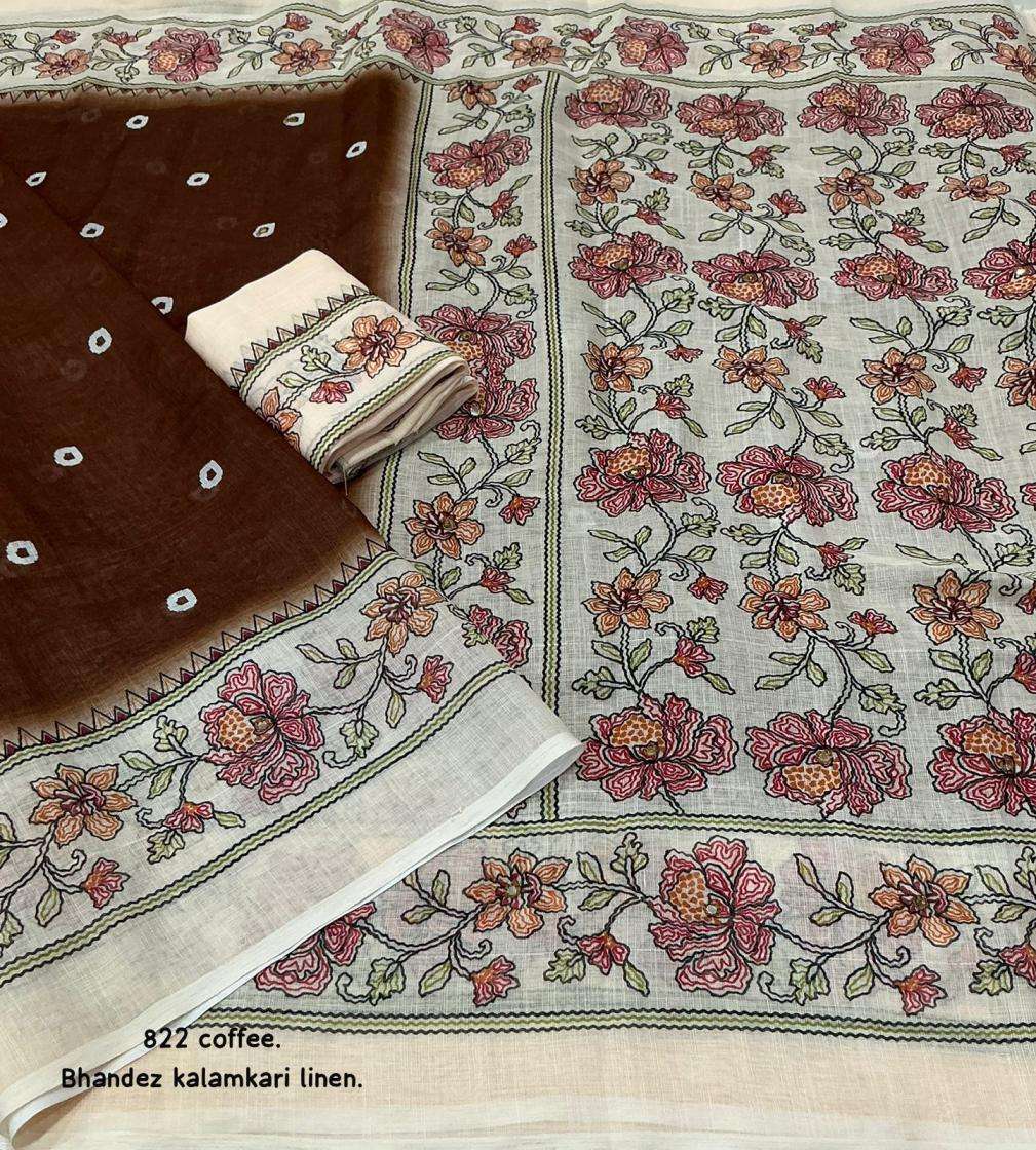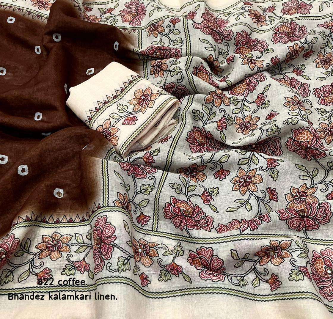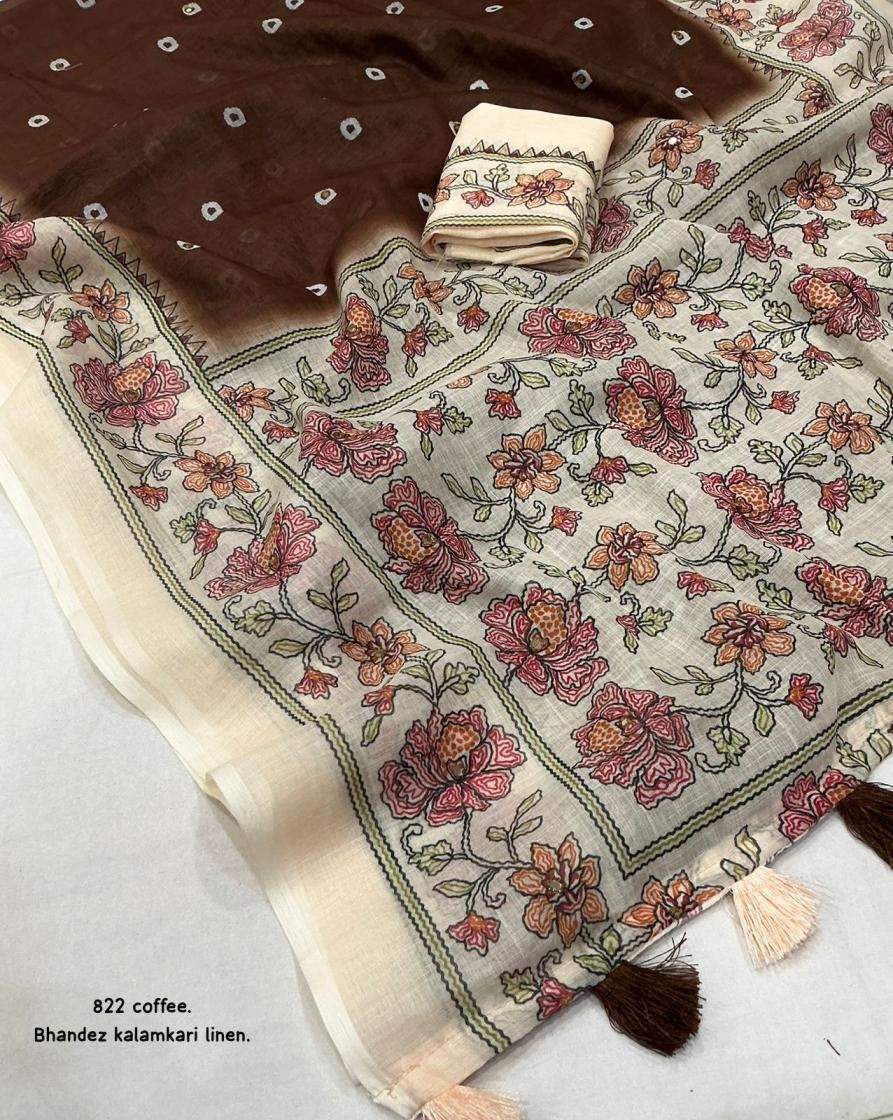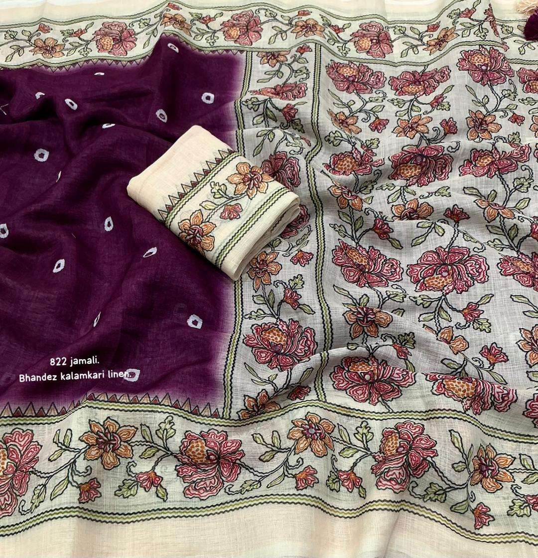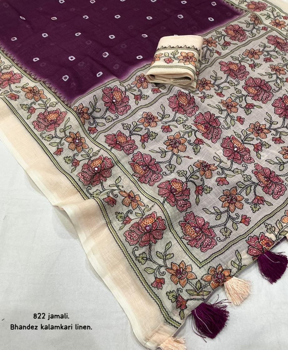 | Other Details: | new arrivals New addition to our best selling didgital linens. kc 822 bhandaex kalamkari. Soft linen saree with bhandani and kalamkari digital prints. Cotton tassels on pallu. Running perfectly matched blouse. Rate- 630+ship. Top trsuted quality |