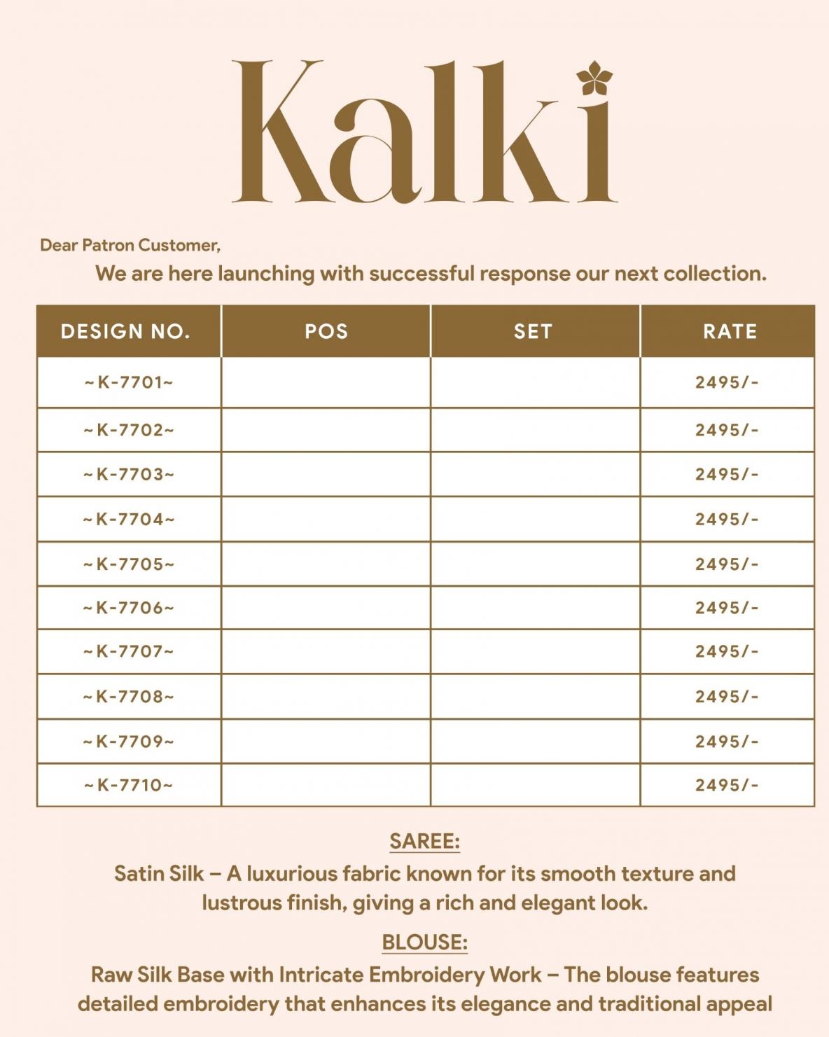 | Name: | Kira Creation Kalki Series 7701- 7710 Satin Silk Exclusive Designer Sarees In Wholesale Surat |