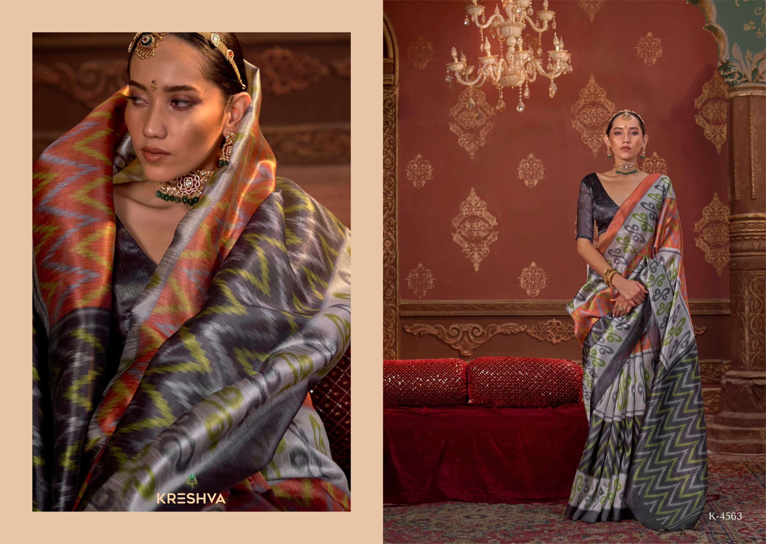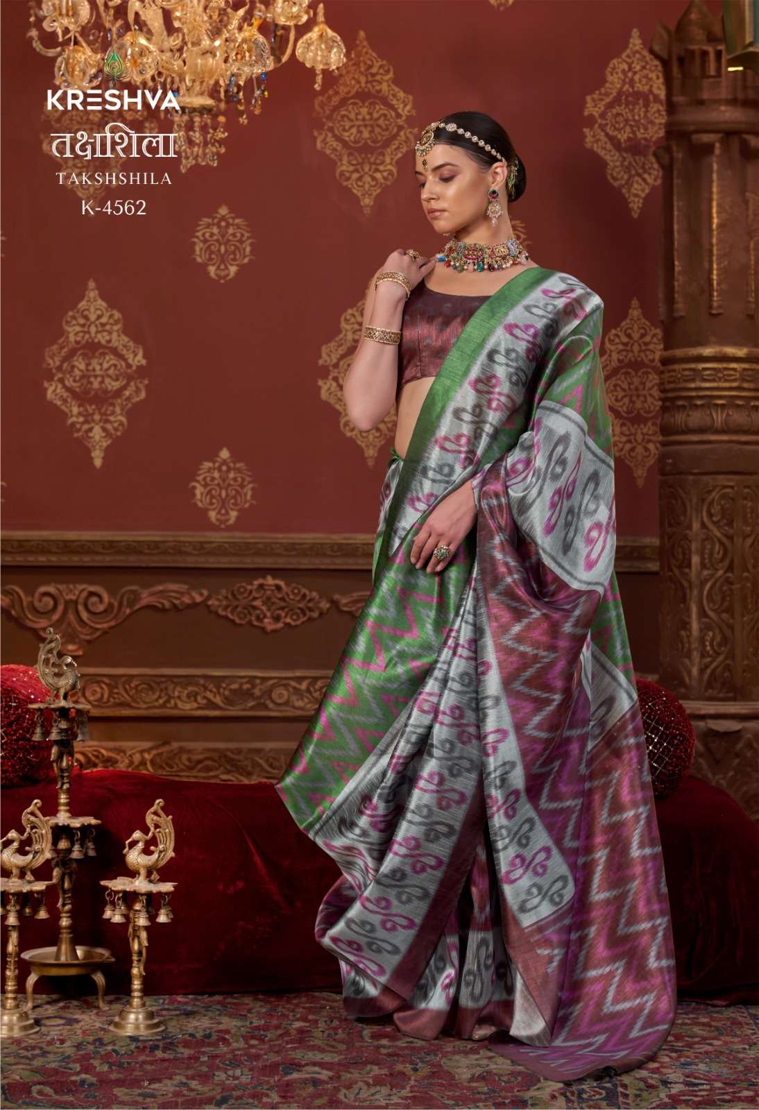 | Other Details: | Brand Name: Kreshva Catalog Name: Takshshila Series: 4558 To 4569 Price: 695/-+5%Gst Saree Fabric: ︎ Black Pearl P.C.Silk With Ikkat Design With Hard Marmo Finish With Tassles Blouse : P.C.Silk With Ikkat Desig Occasion: Daily Wear,Uniform Wear,Casual Wear |