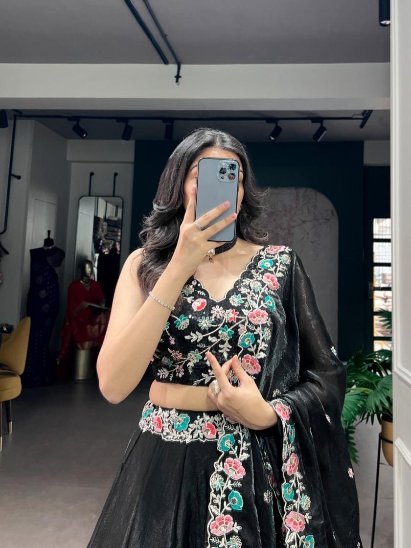 This black lehenga choli stands out with its soft Fendi fabric and exquisite embroidery work. 🖤