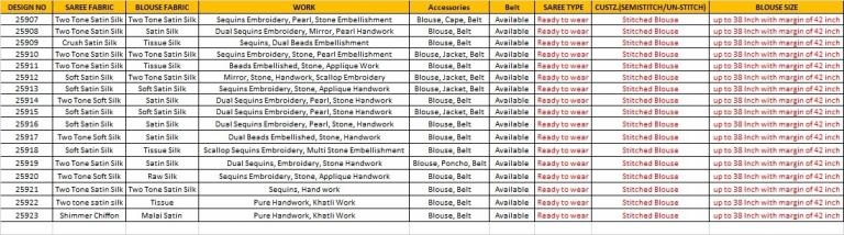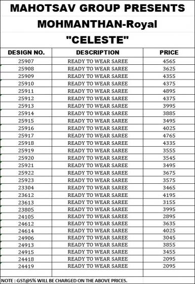 | Other Details: | ♻ OUR NEW PARTY WEAR ONE MINUTE DESIGNER SAREE COLLECTION ♻️ BRAND NAME : MAHOTSAV CATALOG NAME : "MOHMANTHAN 25900 CELESTE PRICE :- RATE LIST ATTACHED +5% GST EXTRA FABRIC DETAILS: ATTACHED BLOUSE TYPE: STITCHED (SIZE: UP to 38 inches with a margin of 42 inches) |