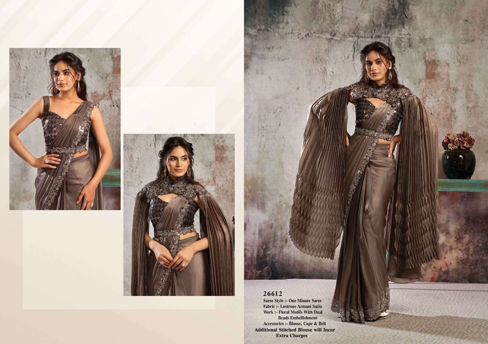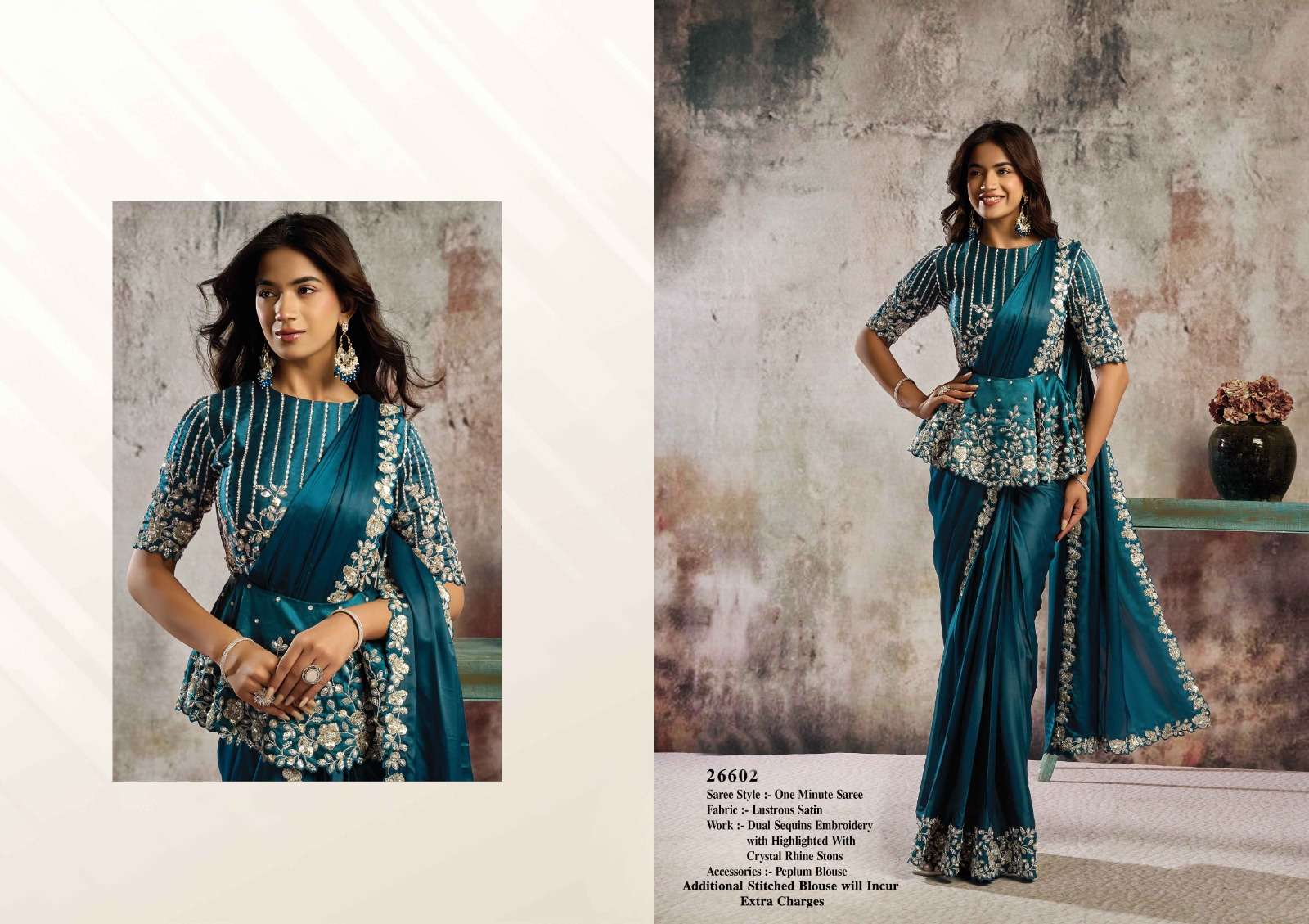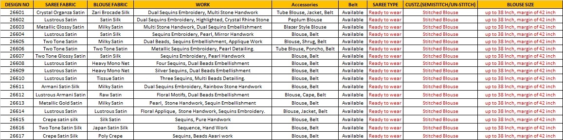 | Other Details: | ♻ OUR NEW EXCLUSIVE PARTY WEAR DRAPE DESIGNER SAREE COLLECTION ♻️ BRAND NAME : MAHOTSAV CATALOG NAME : MOHMANTHAN 26600 SELENE PRICE :- FABRIC DETAILS: ATTACHED BLOUSE TYPE: STITCHED (SIZE: UP to 38 inches with a margin of 42 inches) NOTE: GST AND SHIPPING ARE EXTRA ON THE PRICE. (There might be slight color variation due to lighting & flash during the photo shoot.) Set & Loose & Single |