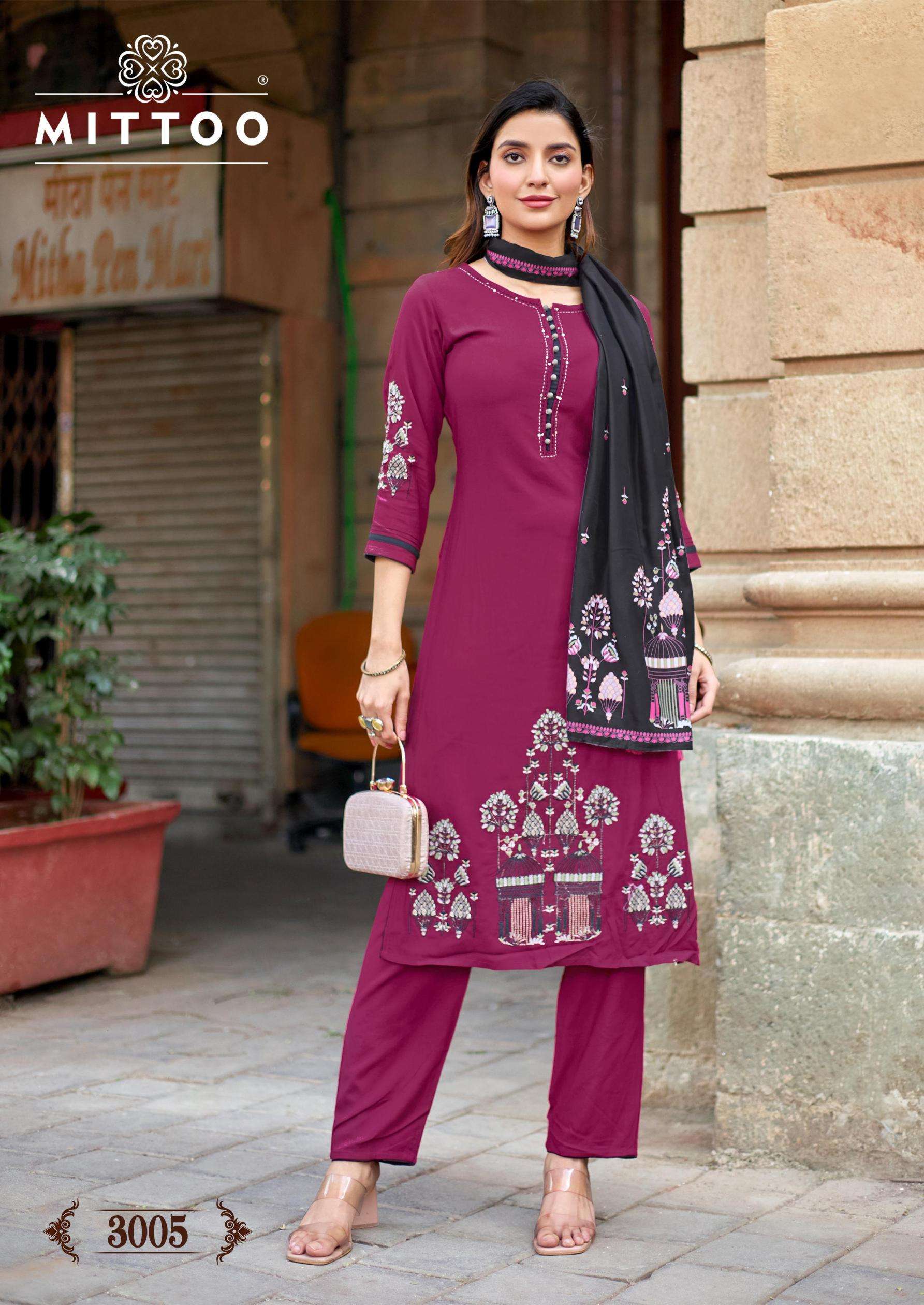 | Name: | Mittoo Kalamay Series 3001-3006 Rayon Thread & Handwork Readymade Wholesale Suit | |