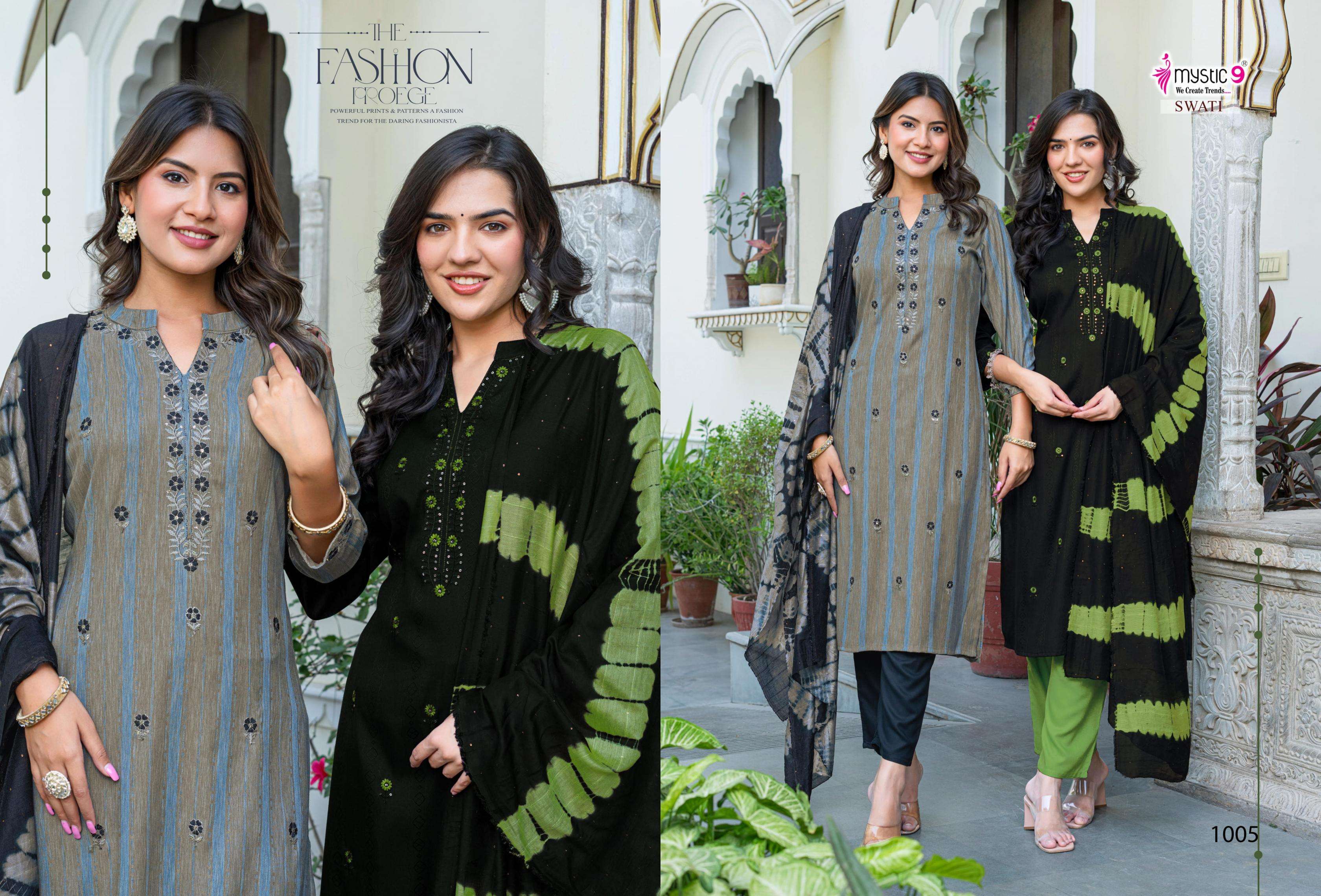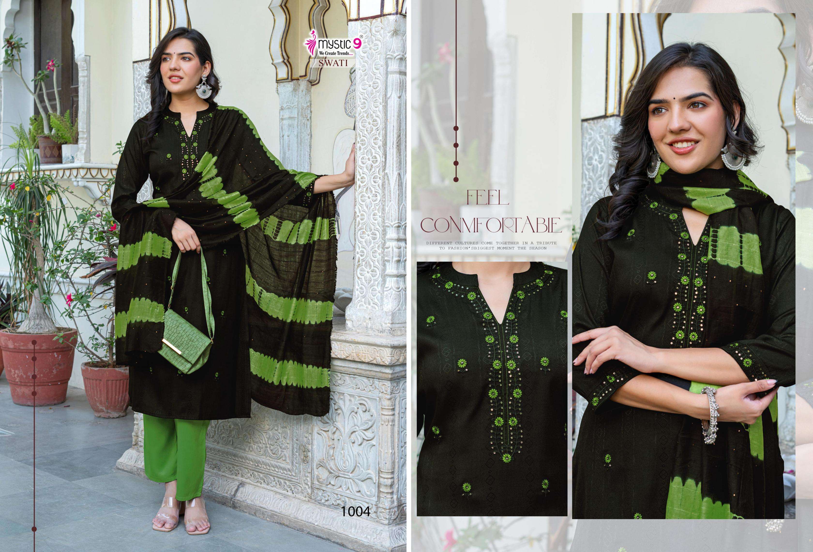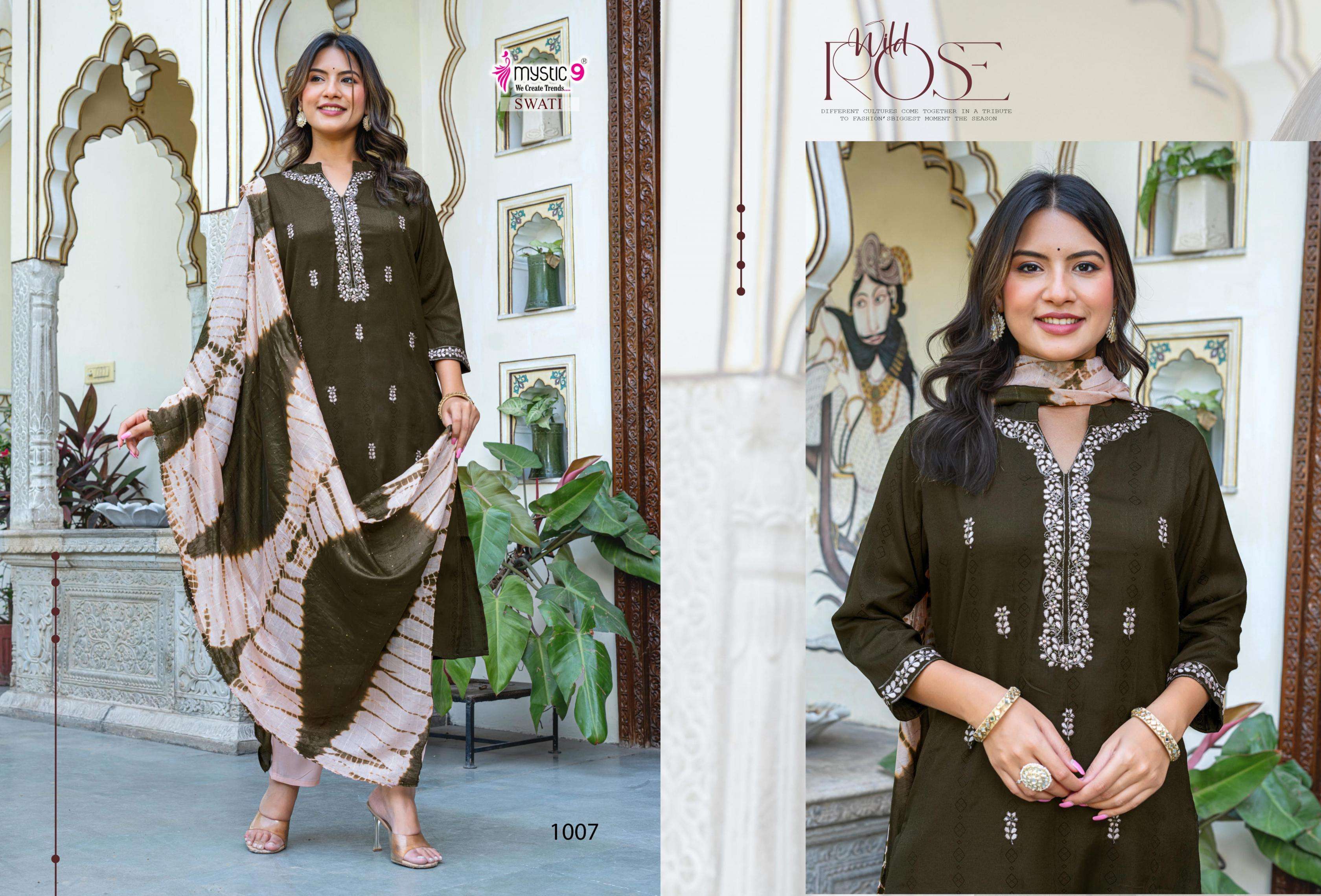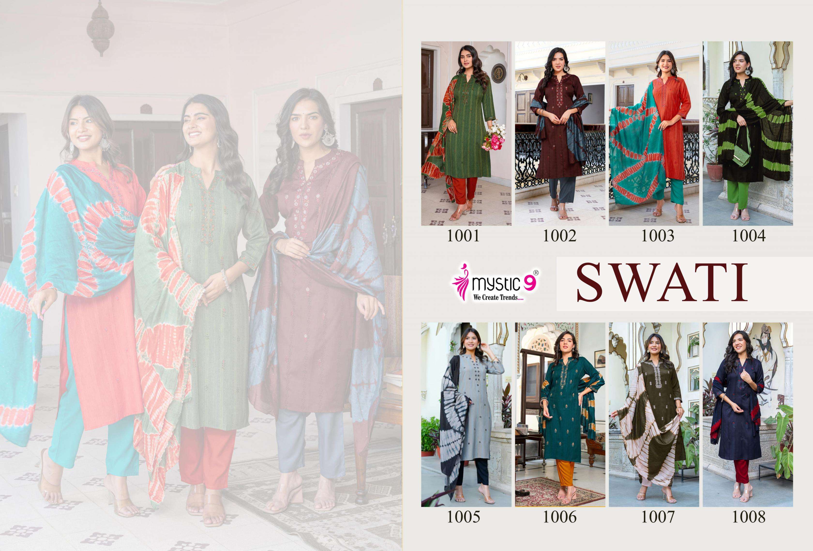 | Name: | Mystic9 Swati Vol 1 Series 1001 To 1008 Rayon Readymade Gorgeous Look Suit In Wholesale Surat |