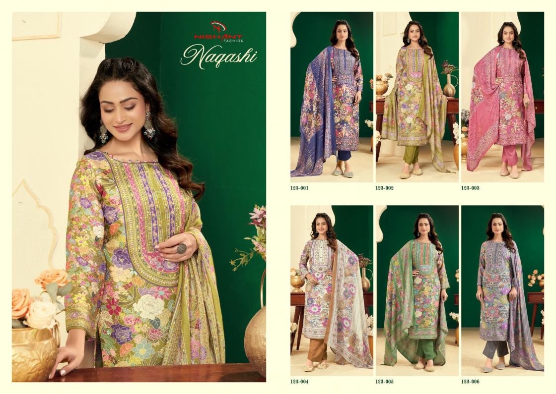 | Name: | Nishant Fashion Nagashi Series 123001-123006 Viscose Simer Muslin Wholesale Suit |