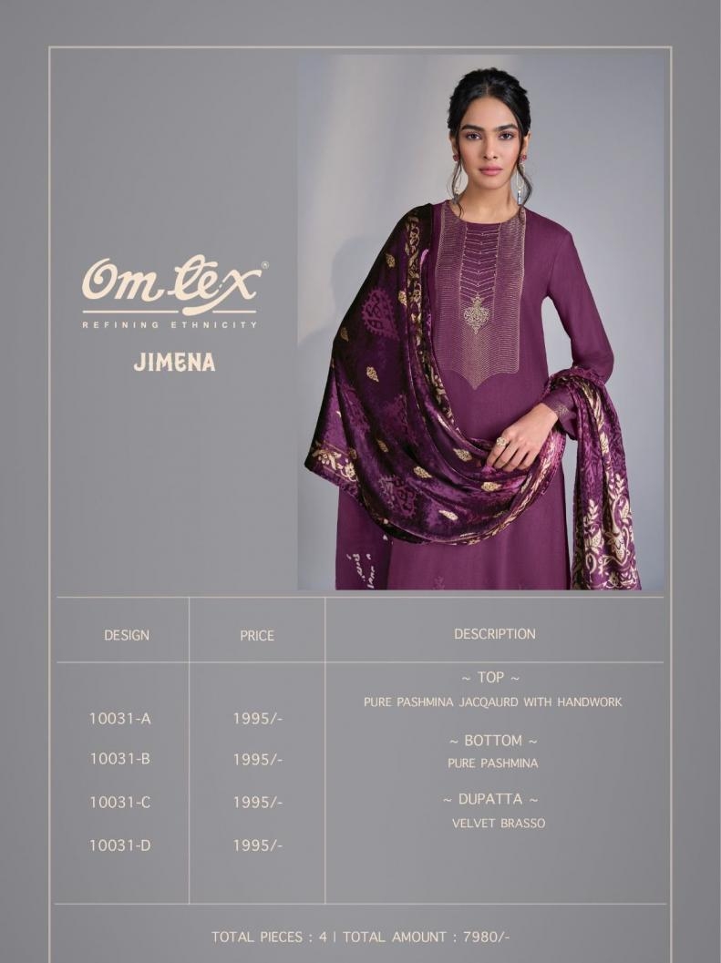 | Name: | Omtex Launch Jimena Series 10031 A To 10031 D Pashmina Jacqaurd Stylish Suit In Wholesale Surat |