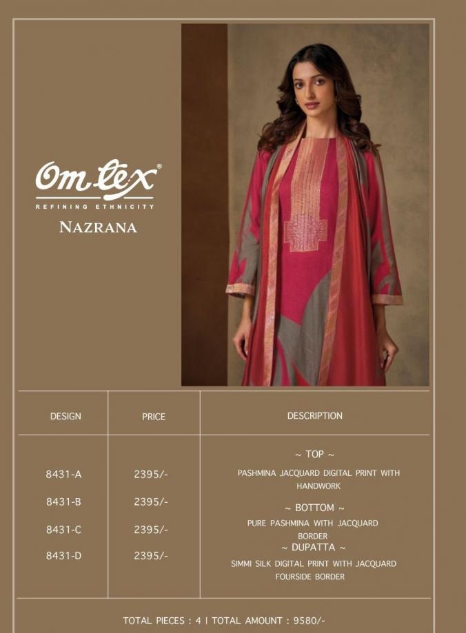 | Name: | Omtex Launch Nazrana Series 8431 A To 8431 D Unique Pashmina Jacquard Salwar Kameez In Wholesale Surat |