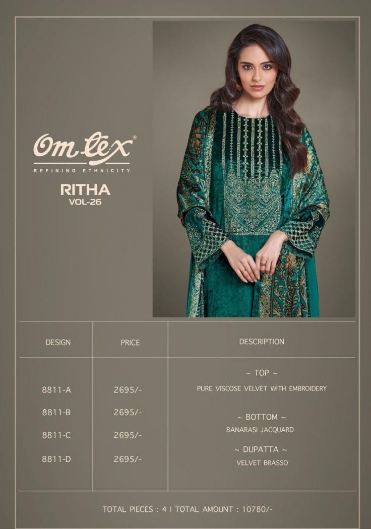 | Name: | Omtex Ritha Vol 26 Series 8811a To 8811d Winter Viscose Velvet Designer Salwar Suit In Wholesale Surat |